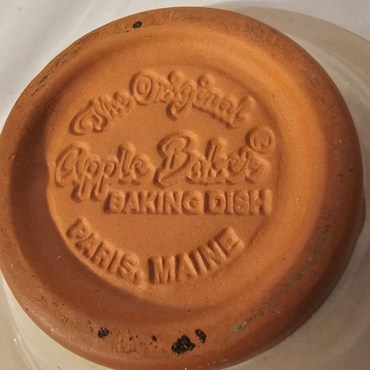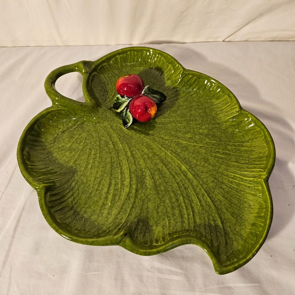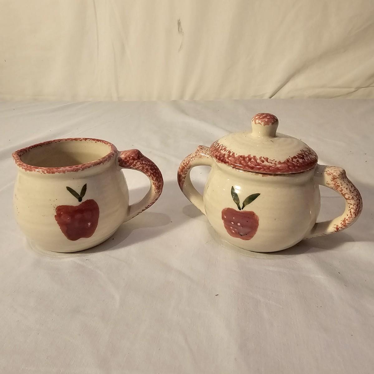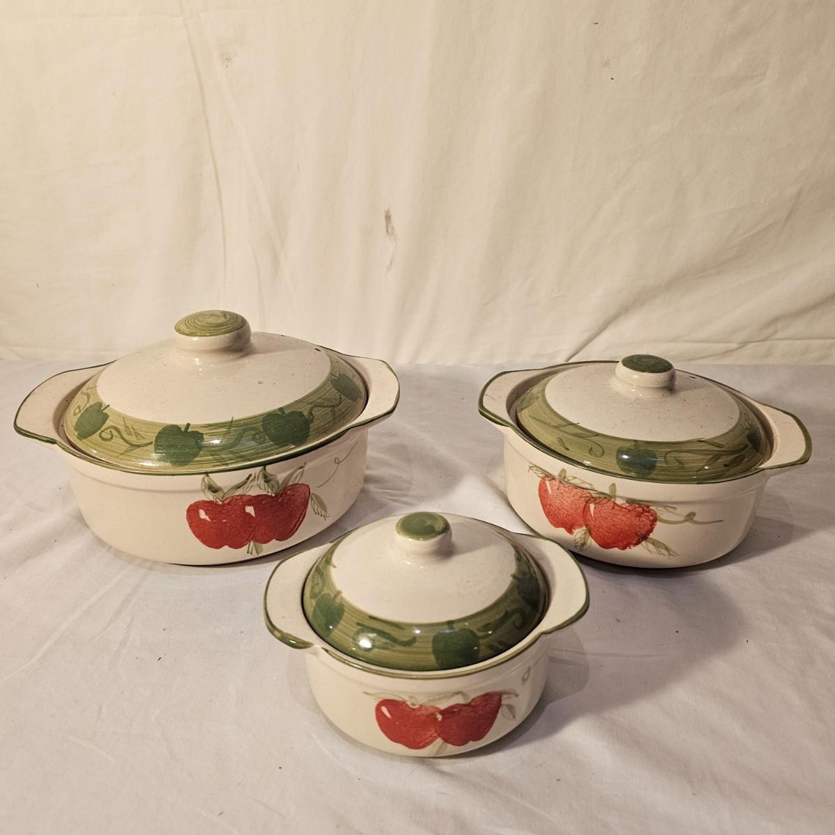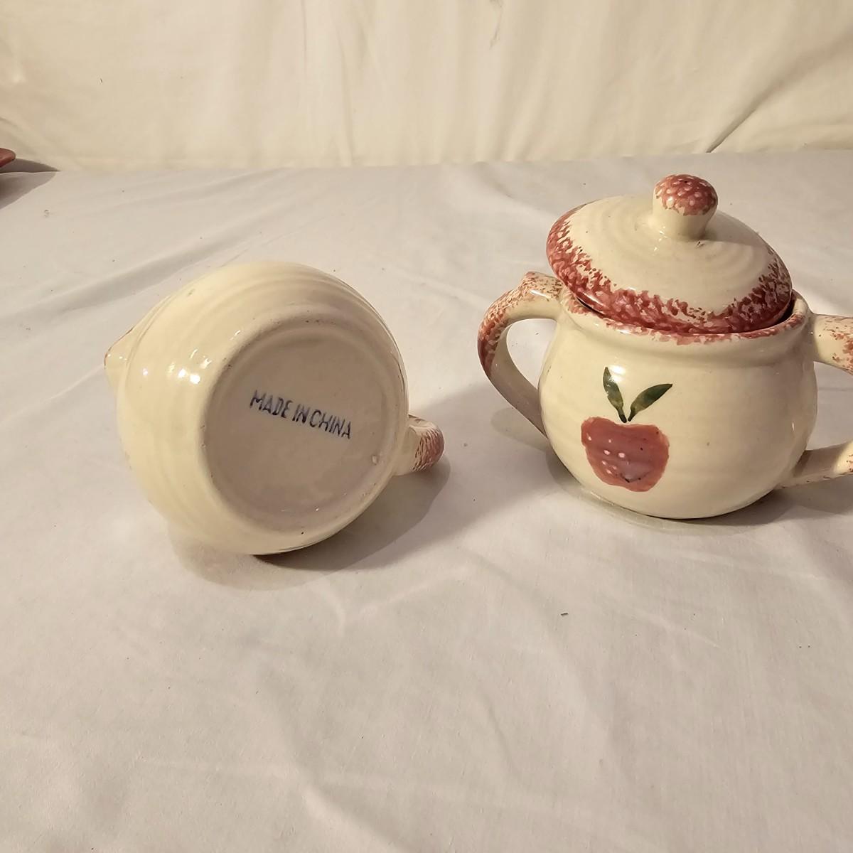 Multiple pieces of ceramic bowls, plates and more with an apple theme. Large flat tray measures 14" x 18.5", has handles. Set of three casseroles with lids nest together, large piece is 9.75"D x 6"H. Sugar bowl and pitcher set. Tabletop apple peeler. Large apple shaped jar with lid, measures 8"D x 7"H, has small chip on top. See photos for details. Shipping available.