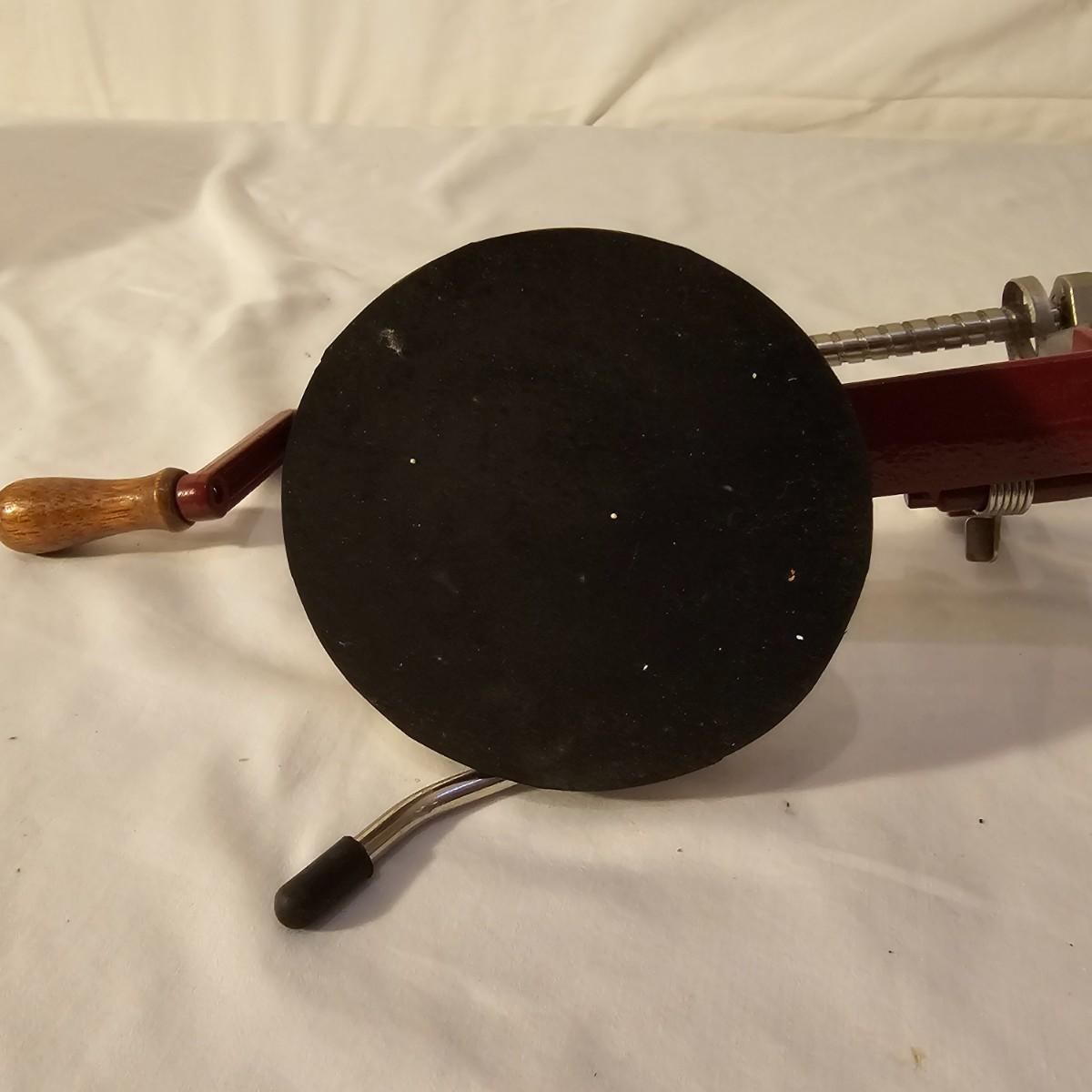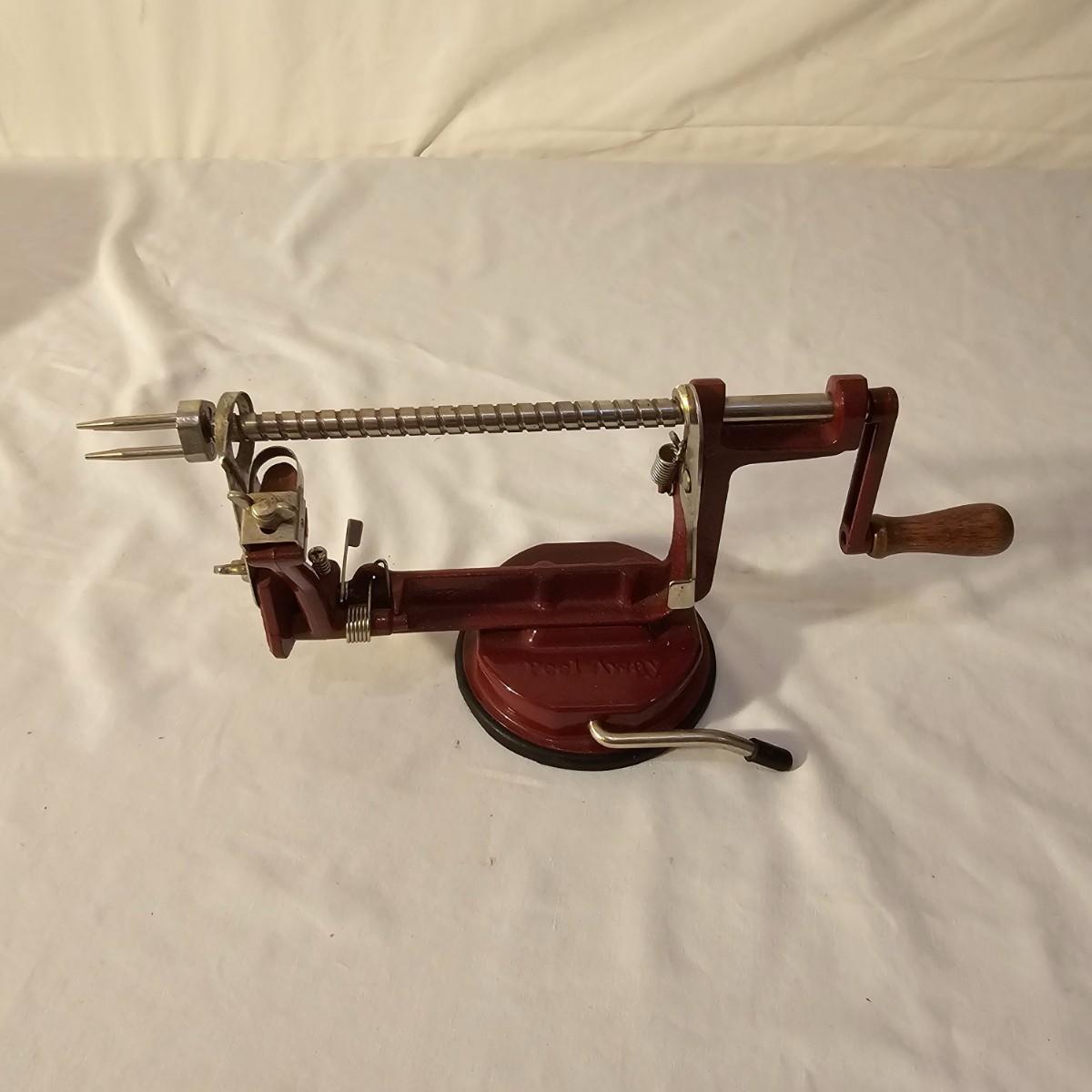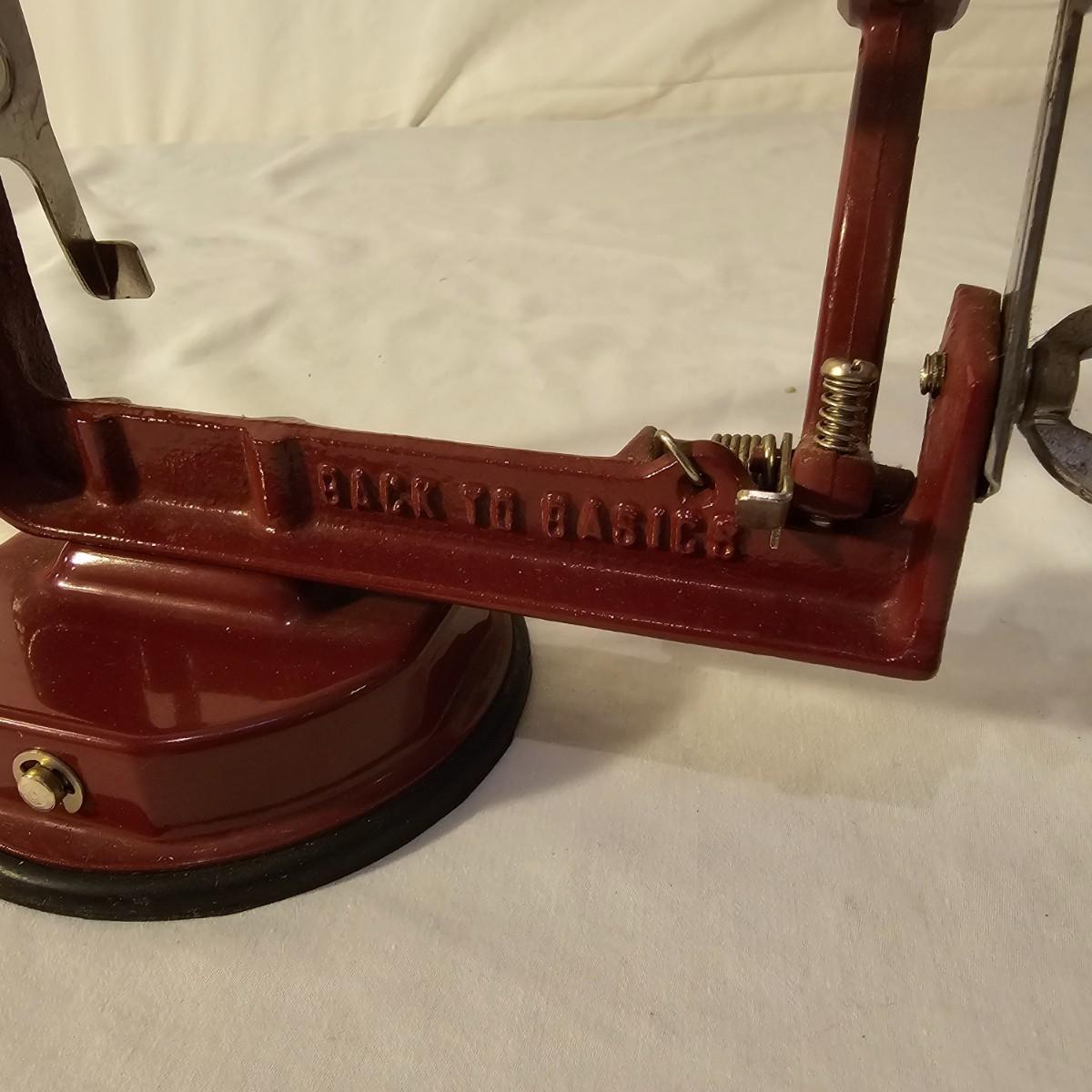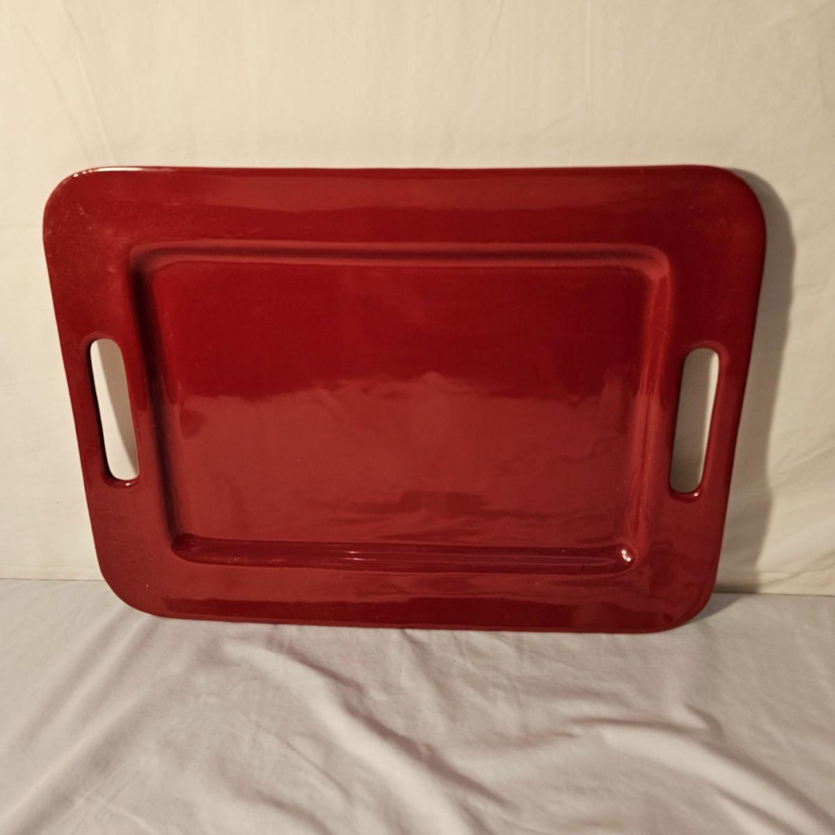 Multiple pieces of ceramic bowls, plates and more with an apple theme. Large flat tray measures 14" x 18.5", has handles. Set of three casseroles with lids nest together, large piece is 9.75"D x 6"H. Sugar bowl and pitcher set. Tabletop apple peeler. Large apple shaped jar with lid, measures 8"D x 7"H, has small chip on top. See photos for details. Shipping available.