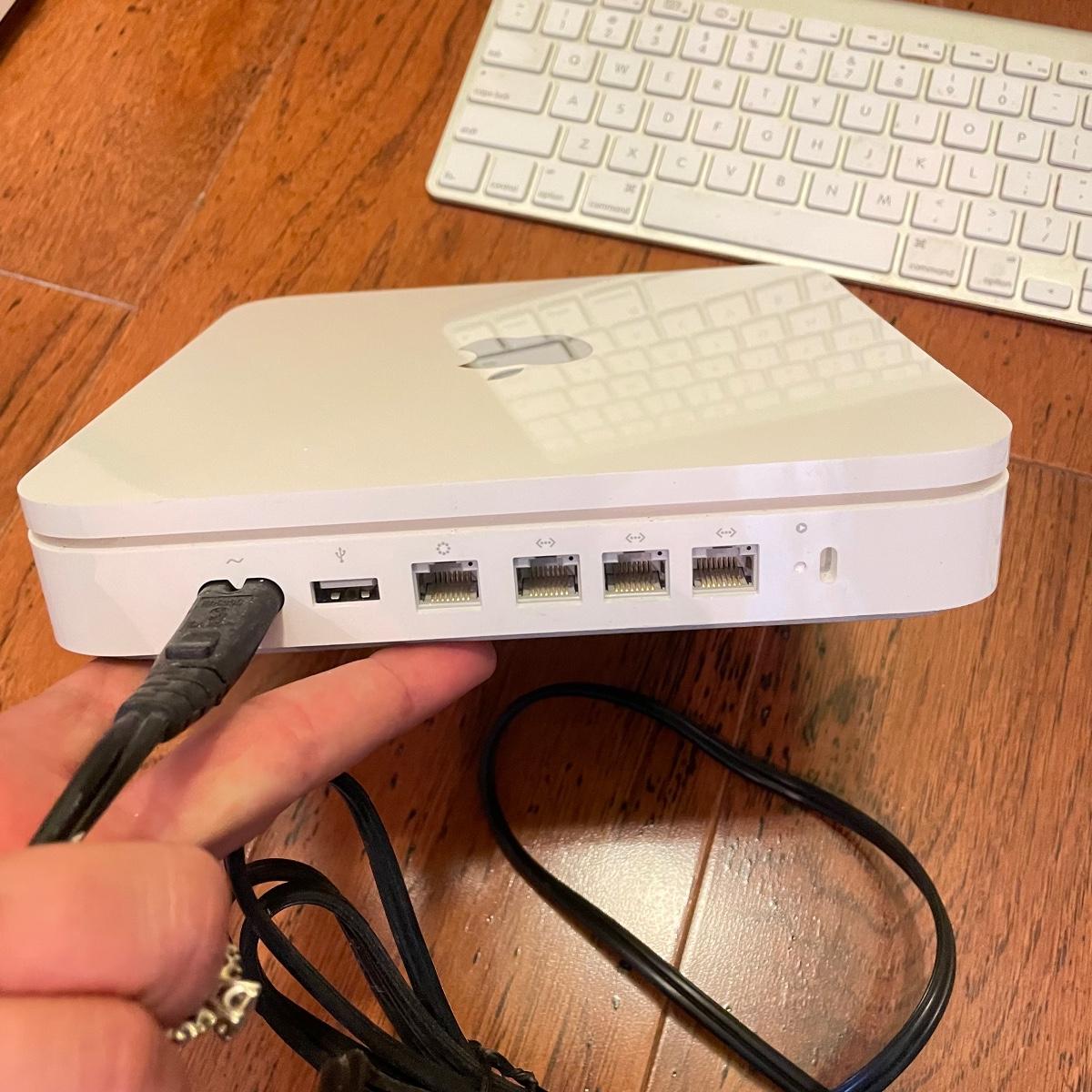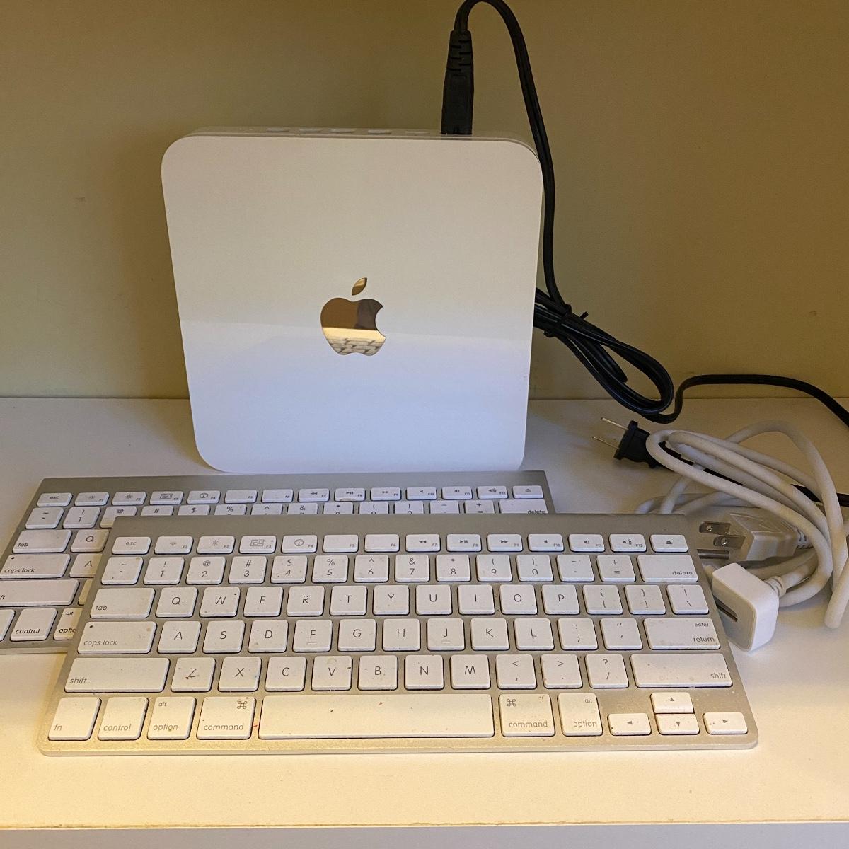 One Apple keyboard is model A1255, and one model A1314. Lot features Apple Time Capsule with 1TB memory router extension. Time capsule lit up when connected to power. The keyboards and mouse were not tested. Shipping available.