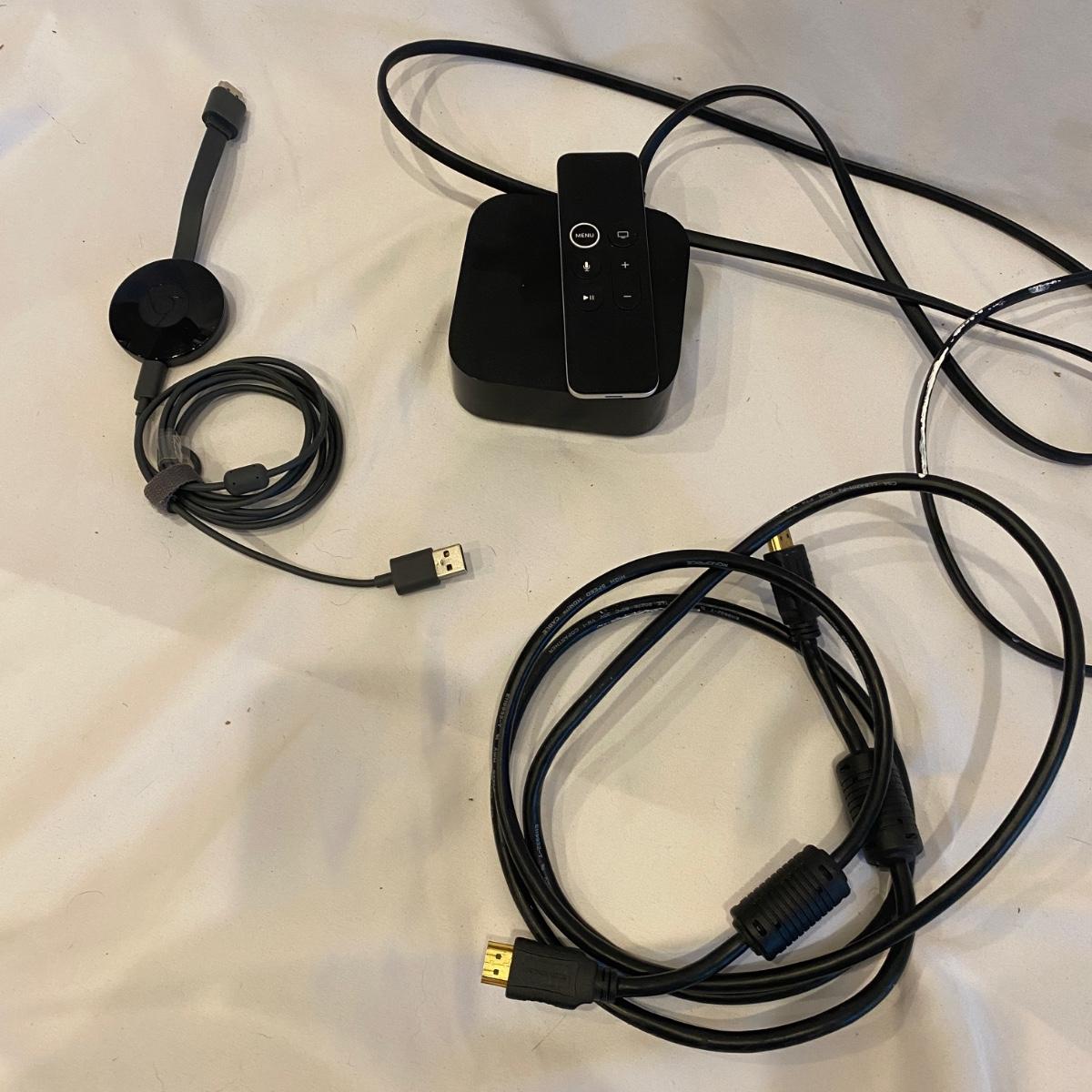 Apple TV with remote and HDMI cable as well as Chromecast for TV plug in. Both give you access to apps for streaming shows. Shipping available.