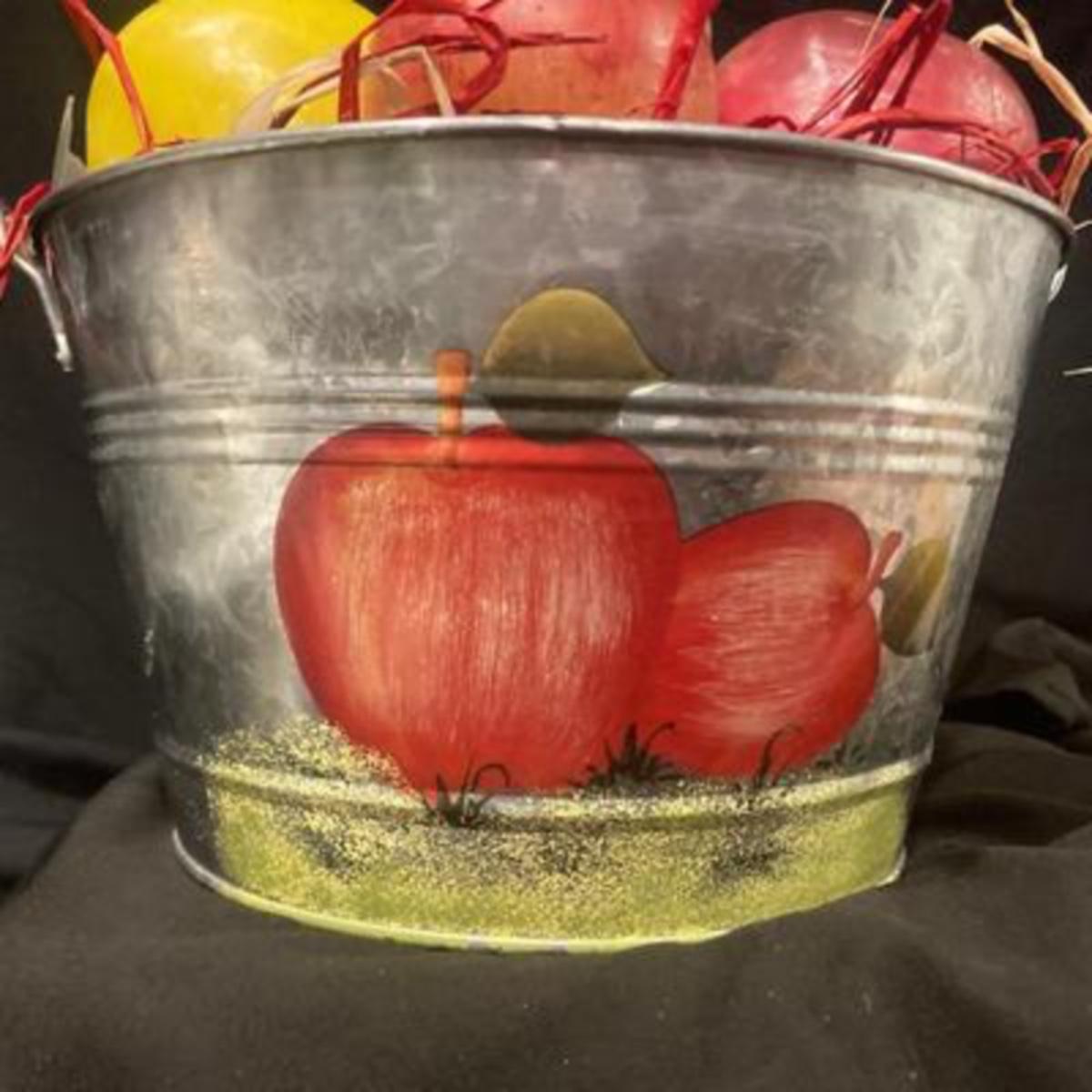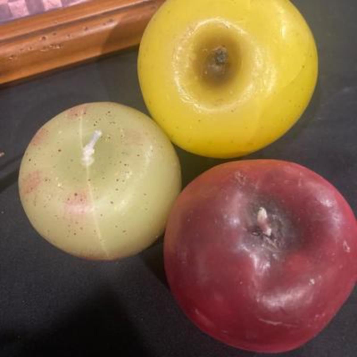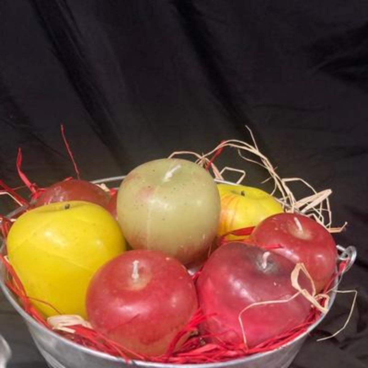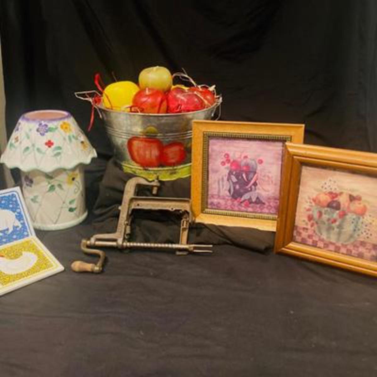 Metal apple peeler, Candle apples, painted metal bucket, pictures, candle lamp and tile hot plates.