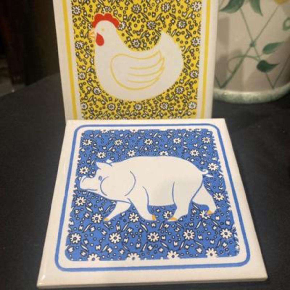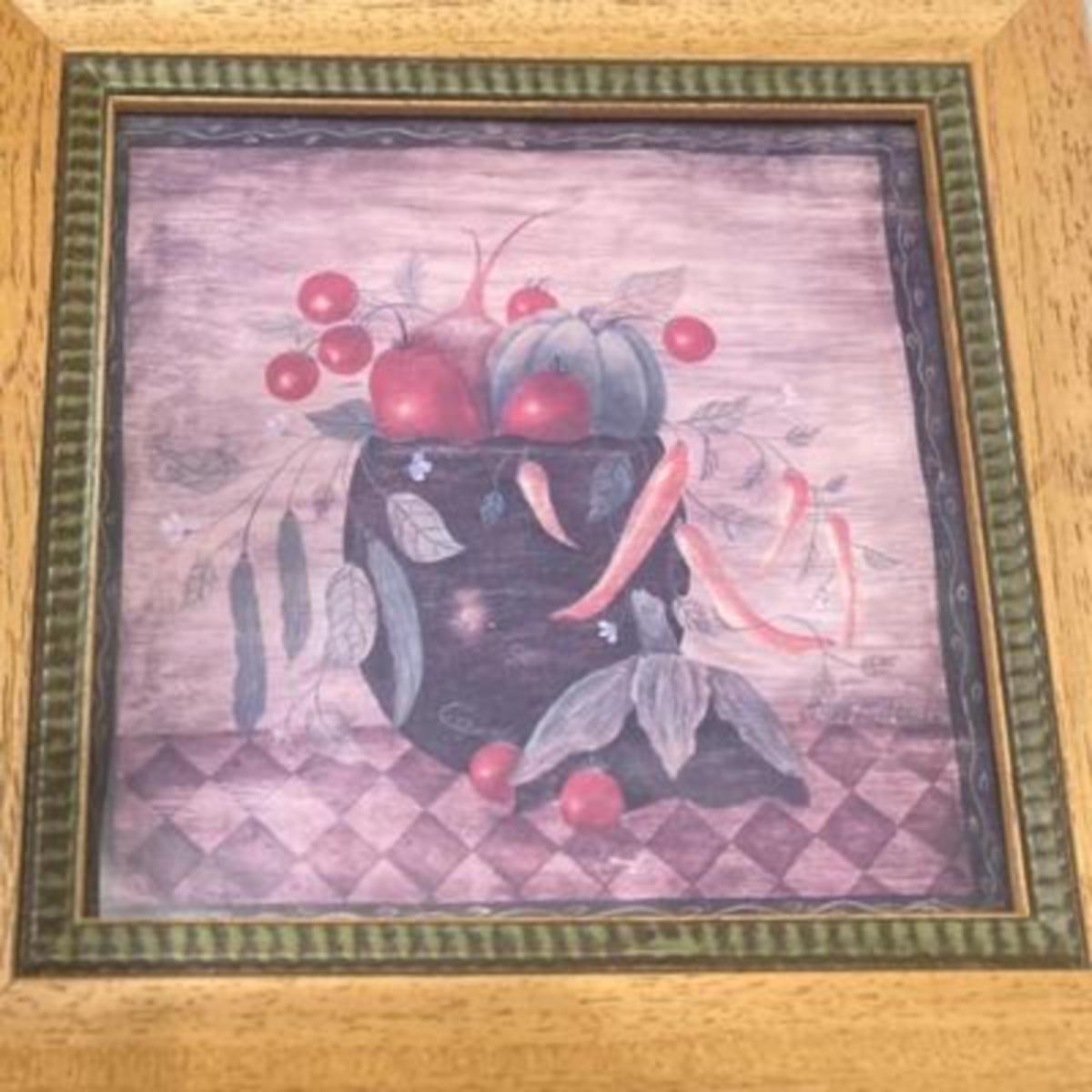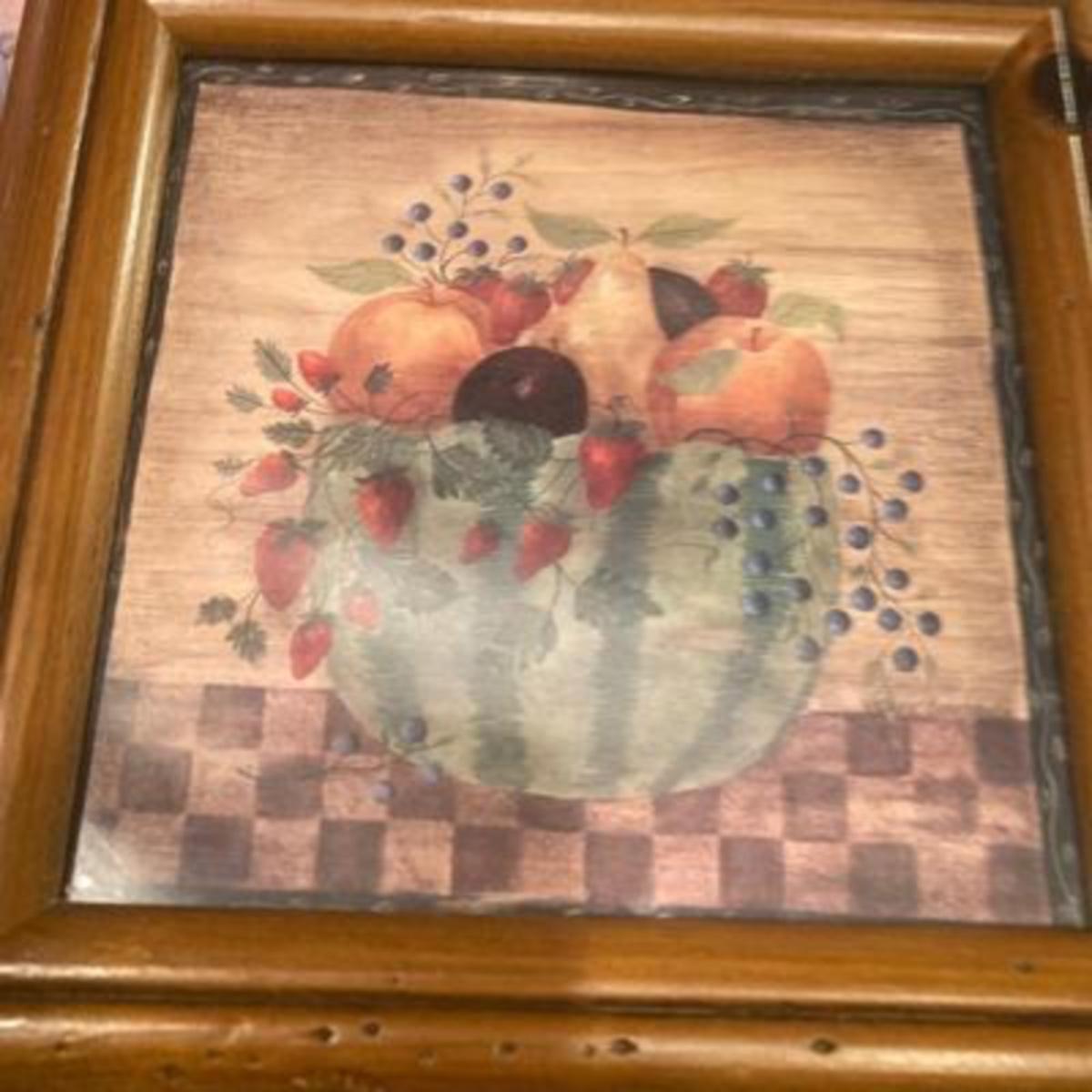 Metal apple peeler, Candle apples, painted metal bucket, pictures, candle lamp and tile hot plates.