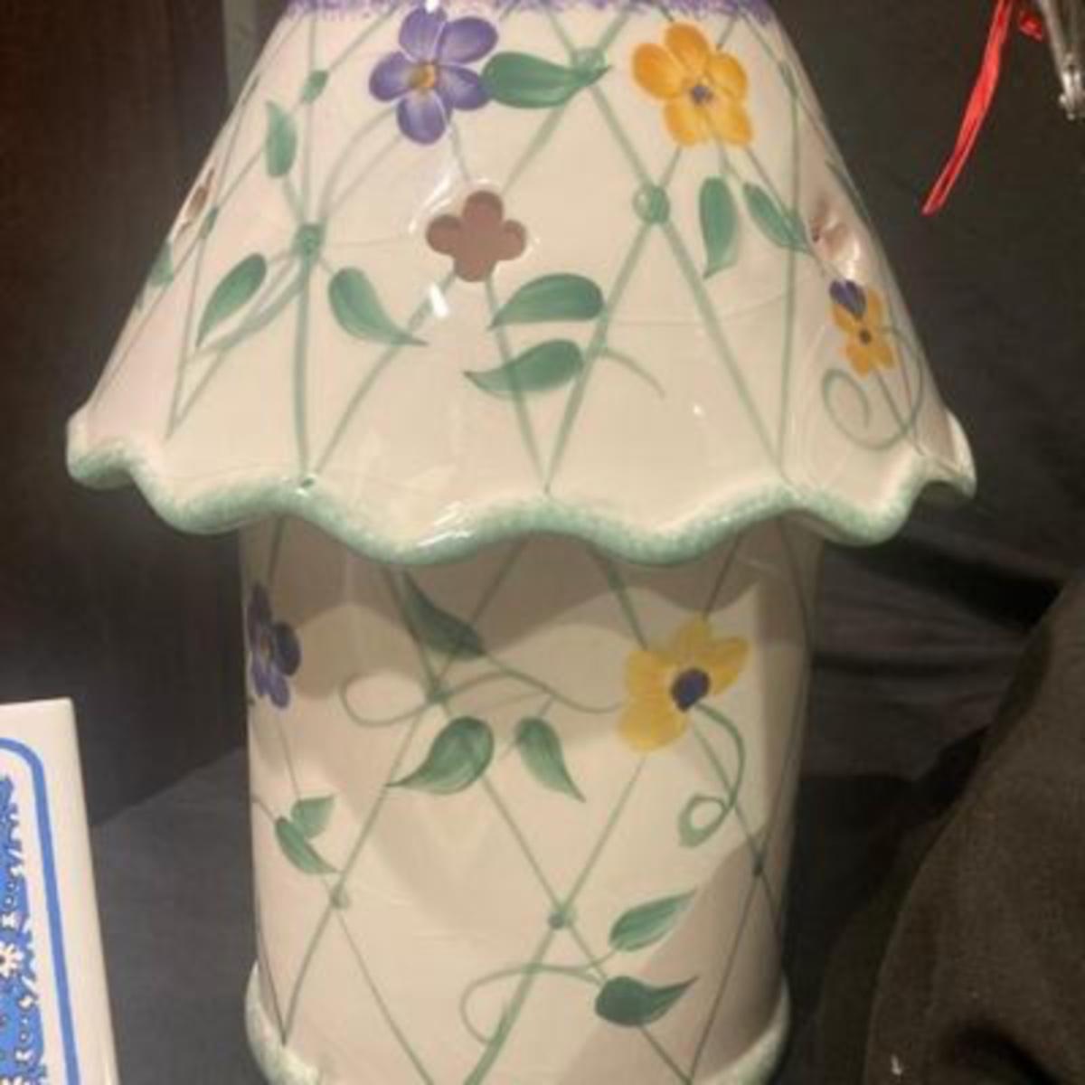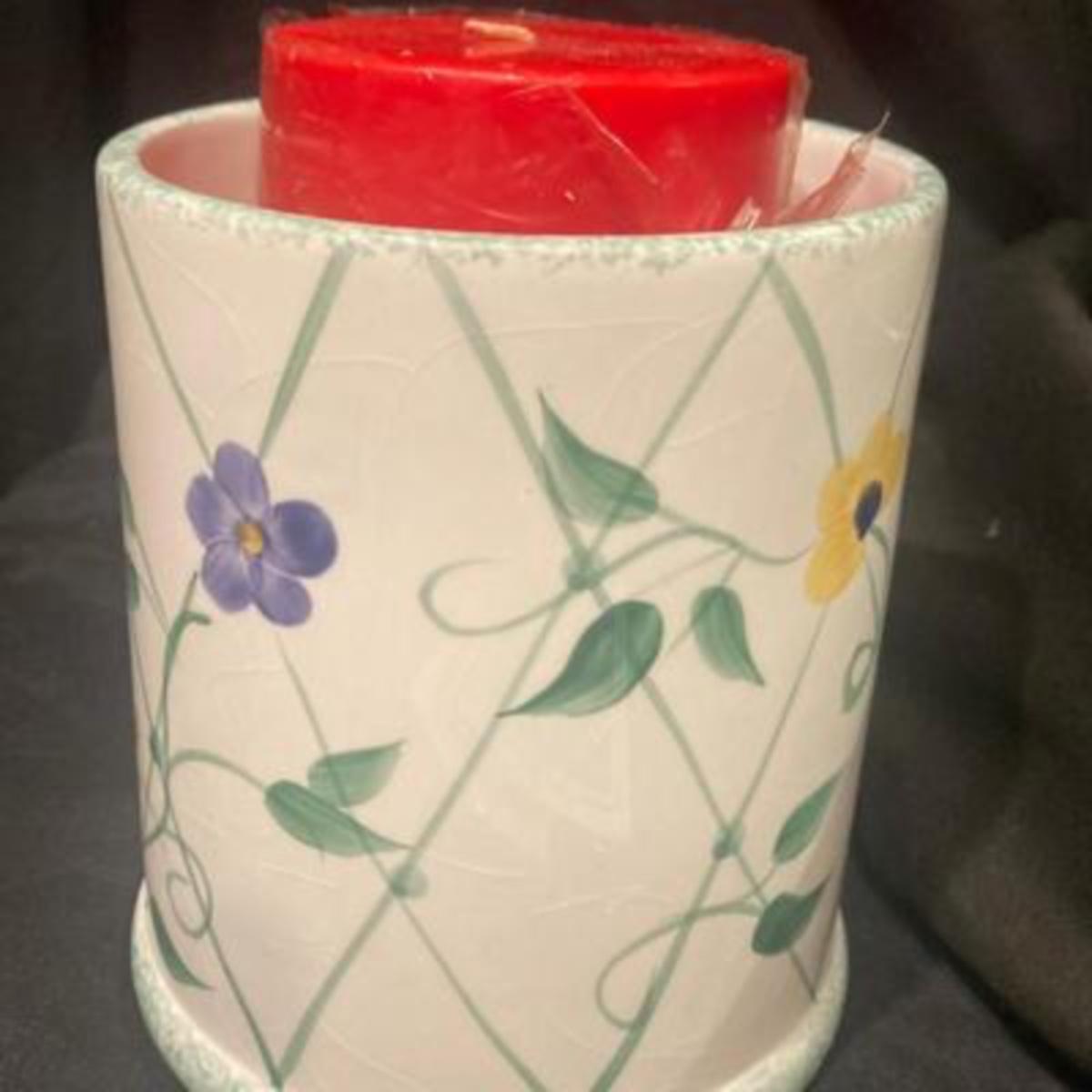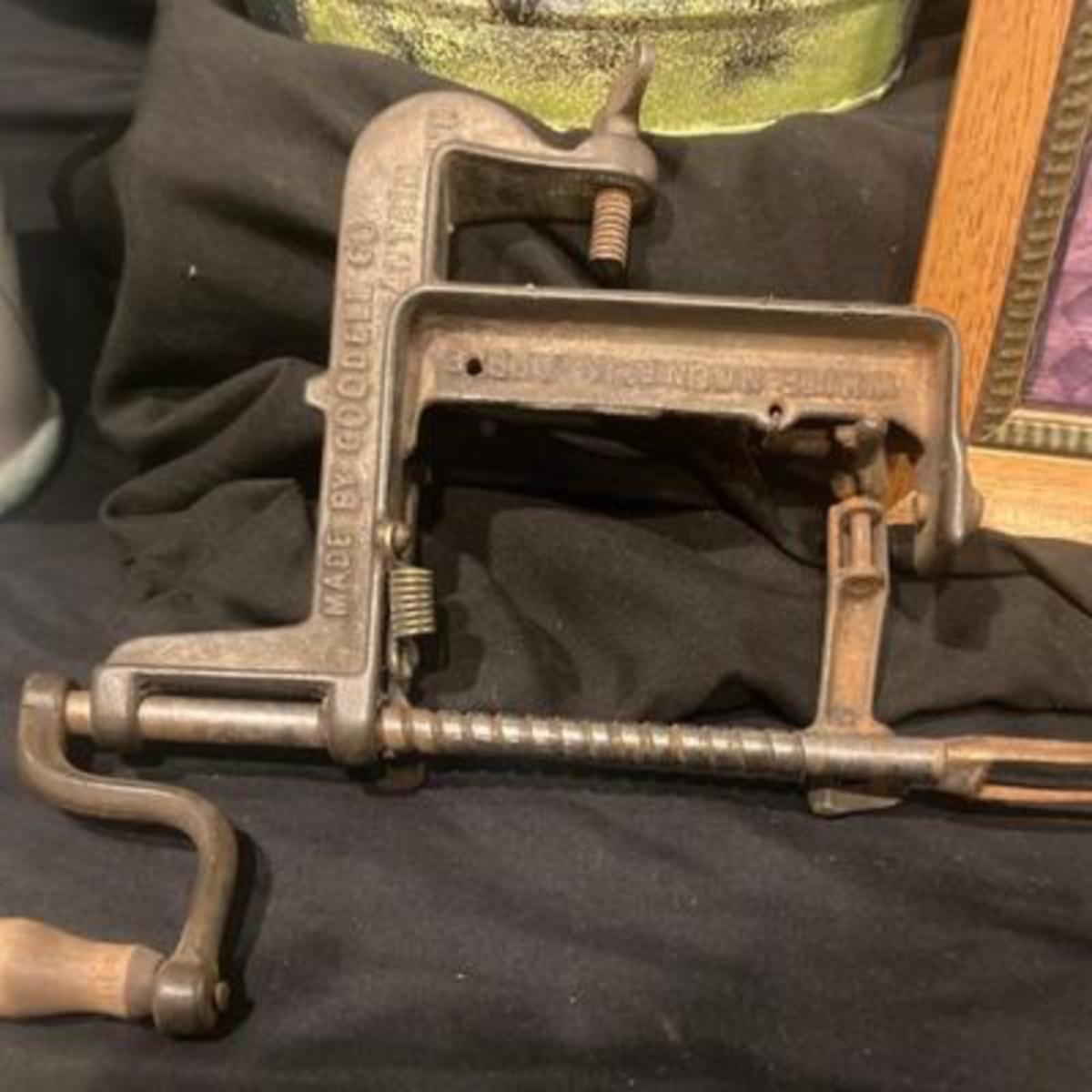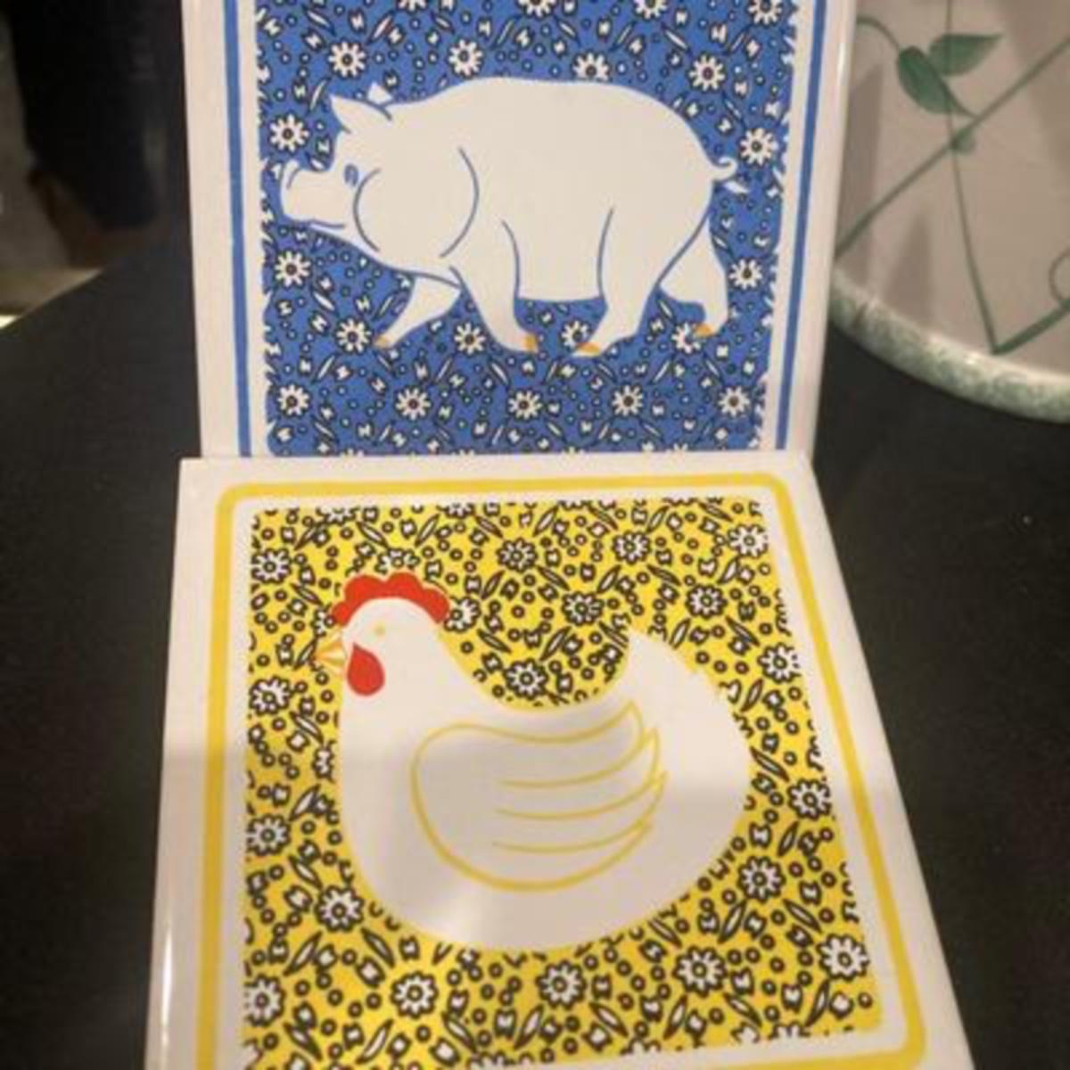 Metal apple peeler, Candle apples, painted metal bucket, pictures, candle lamp and tile hot plates.