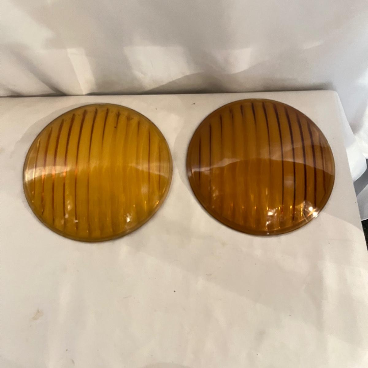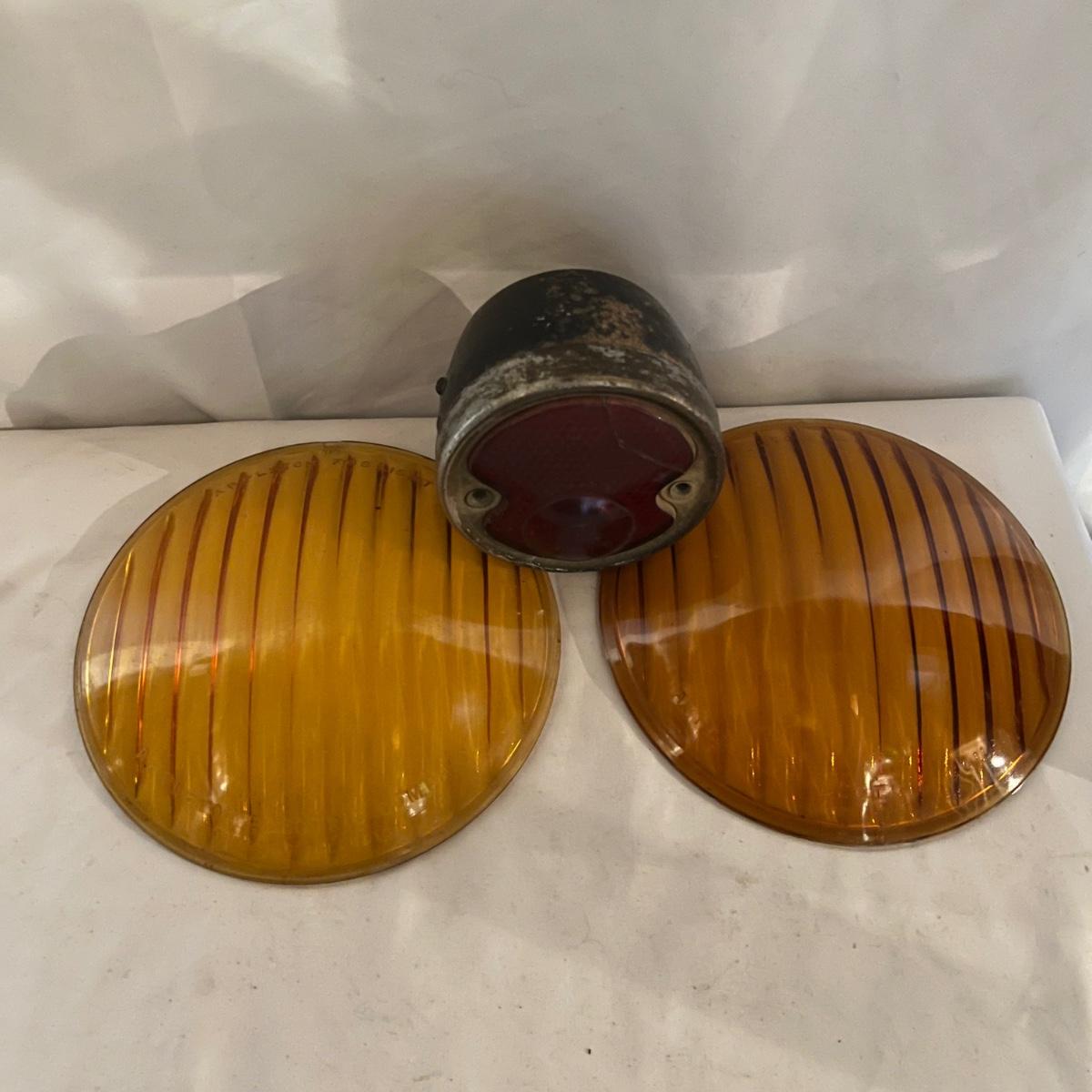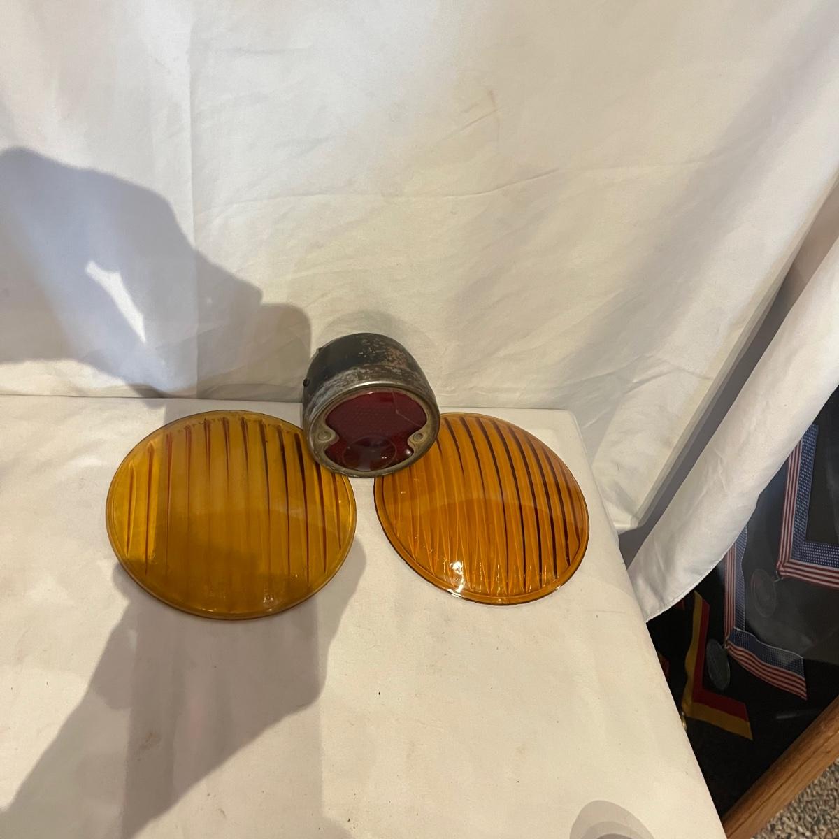 Lot includes a pair of Appleton glass fog light lenses and one taillight with glass lense that has a crack, see pictures. Fog light lenses measure 6.25”D.