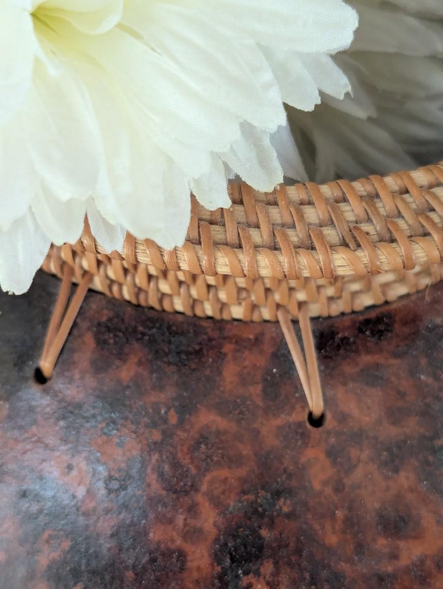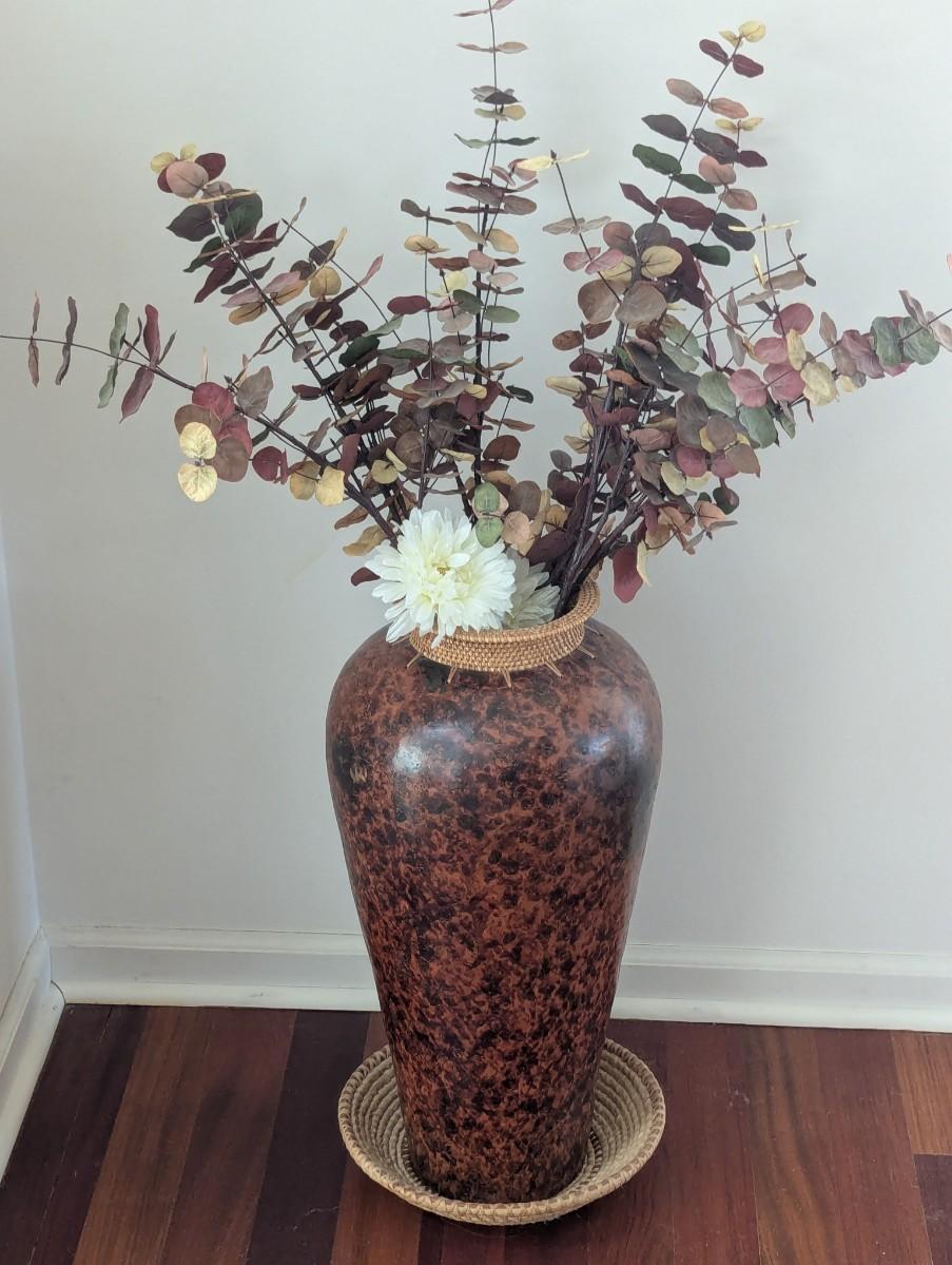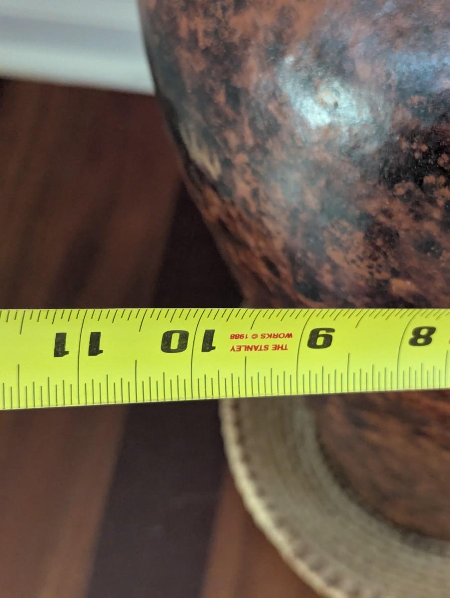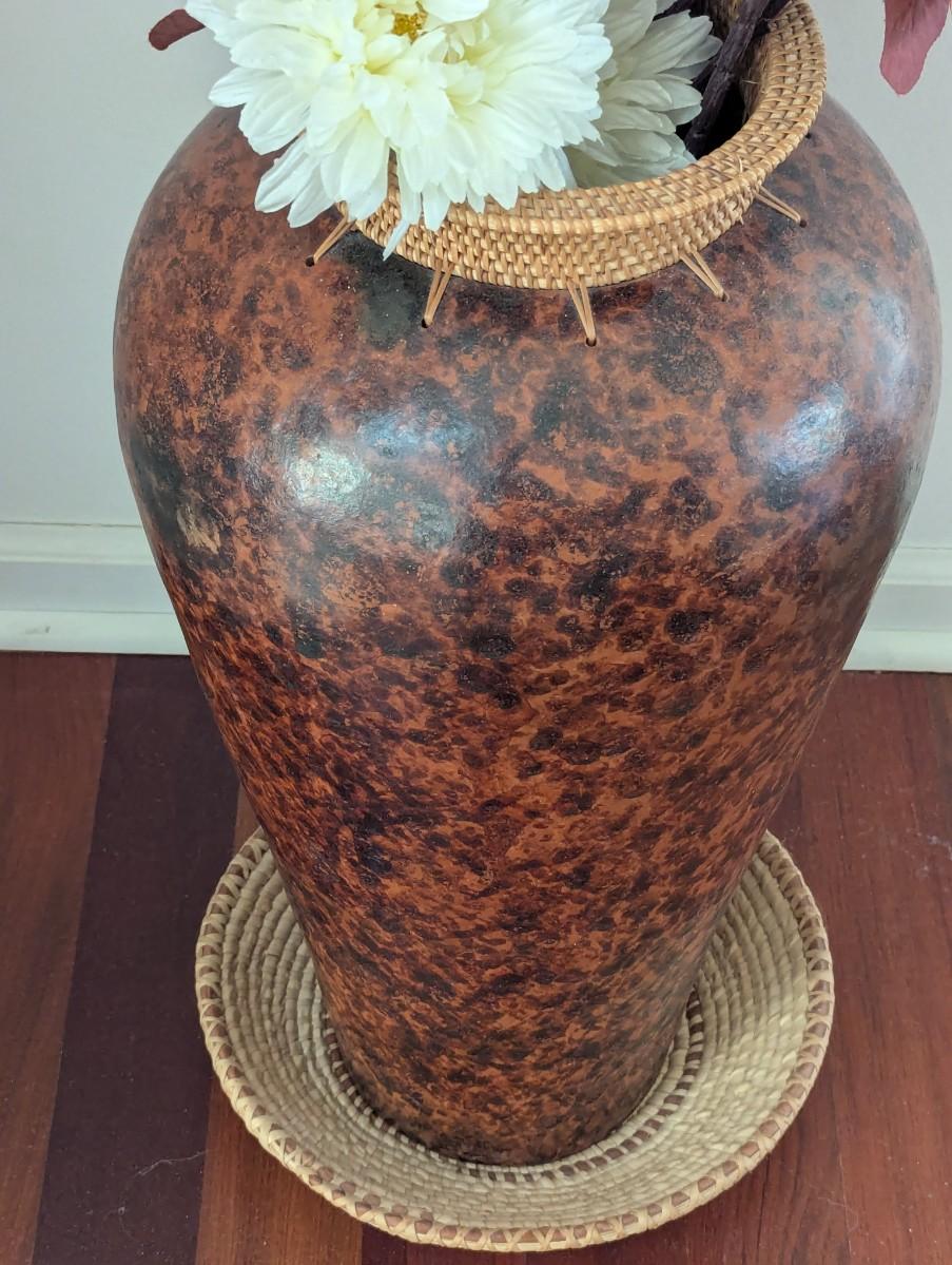 Approx 25" Tall Sharp Tribal Clay Fired Vase With Coiled Grass & Rattan Woven Top