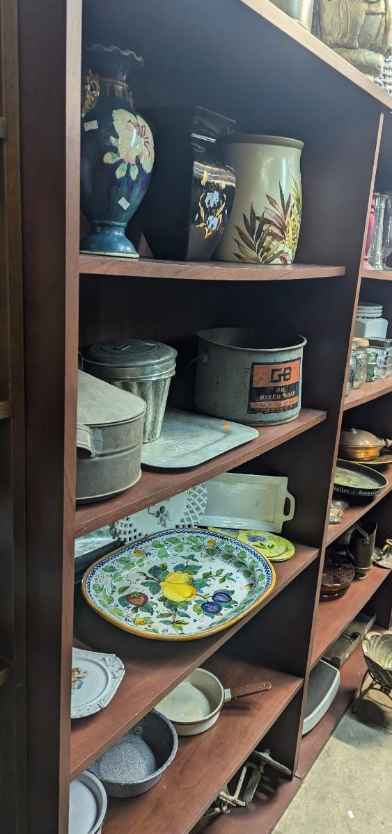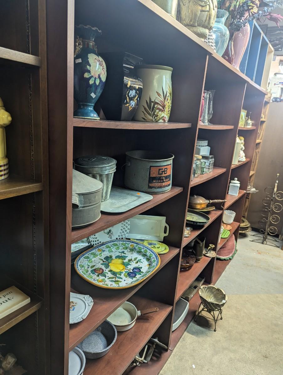 Shelfs have bowed a bit from item. Contents not included. Those bidders who win Shelving units must schedule a pickup time on Saturday, as the shelves will not be available until that day