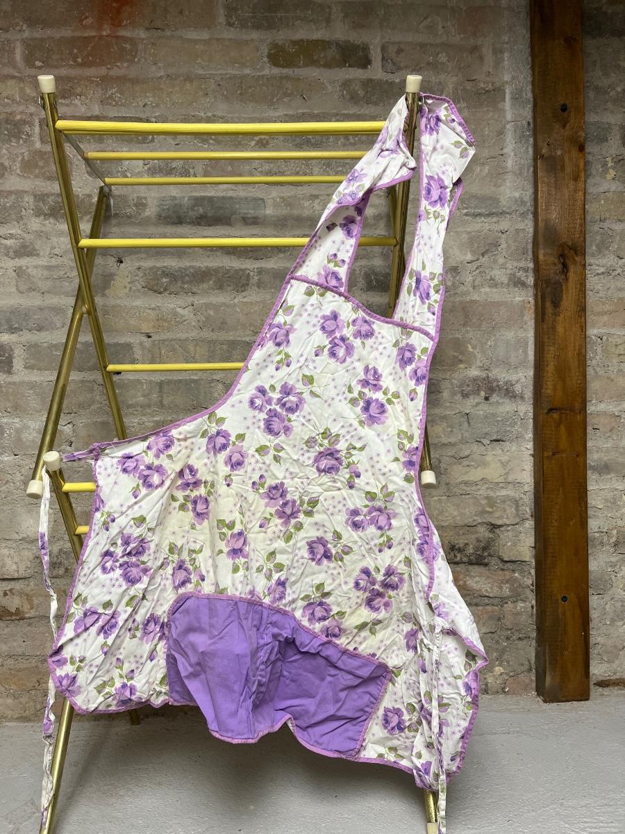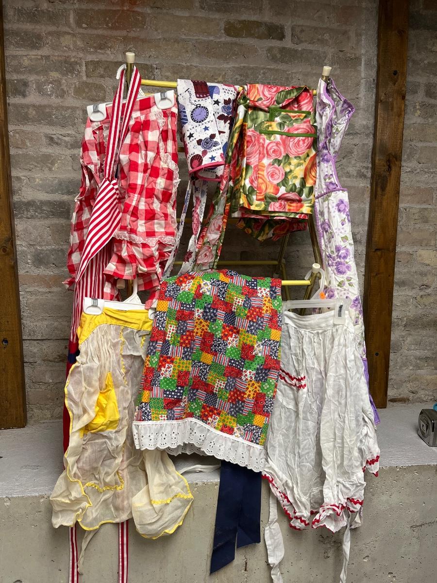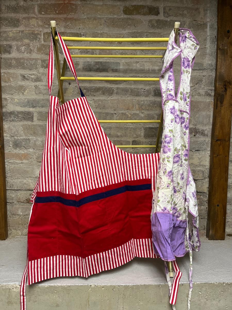 Wedding waitress aprons, cook’s aprons, a children’s apron, and even two with matching pot holders, all on a vintage metal laundry rack