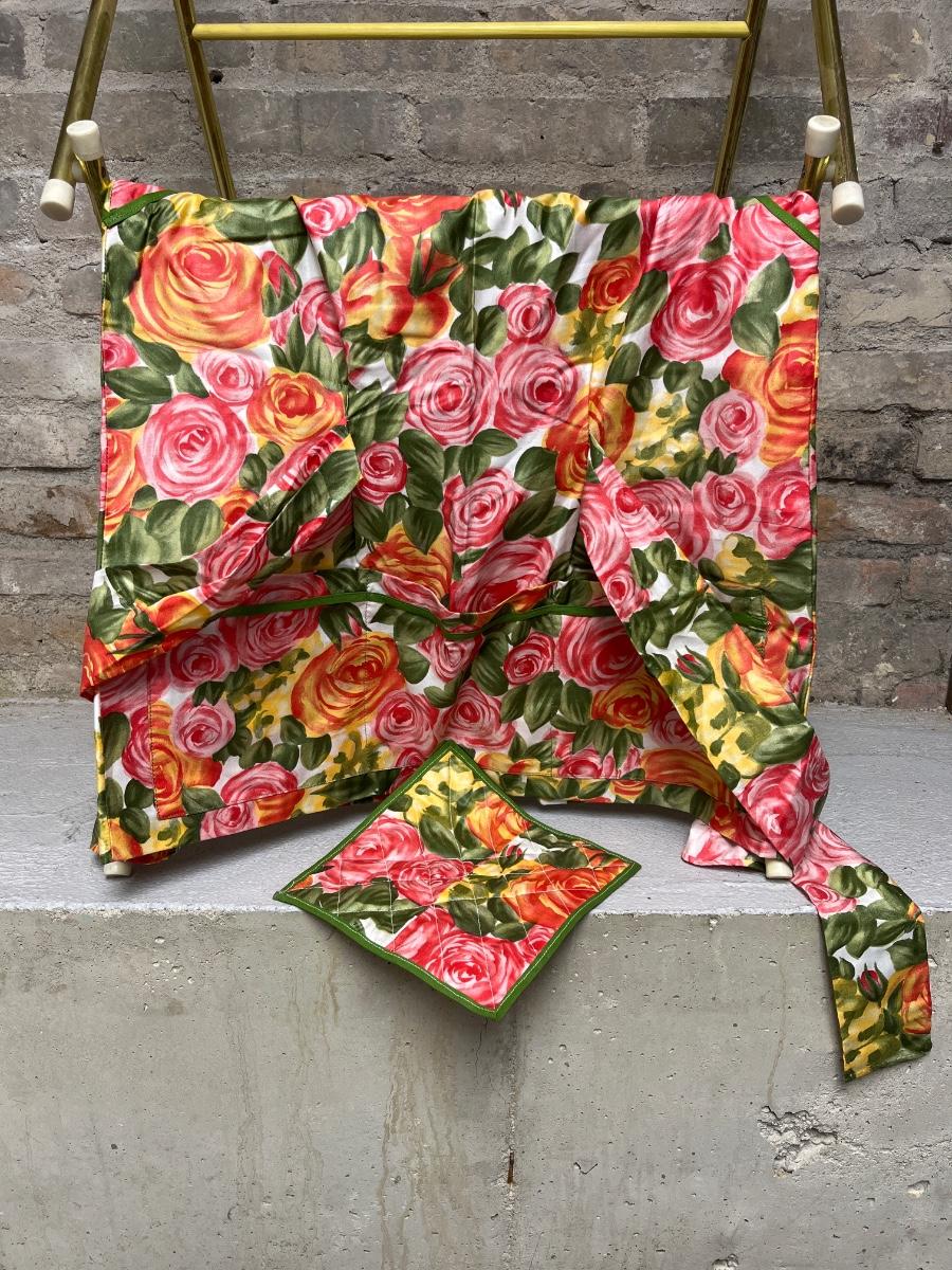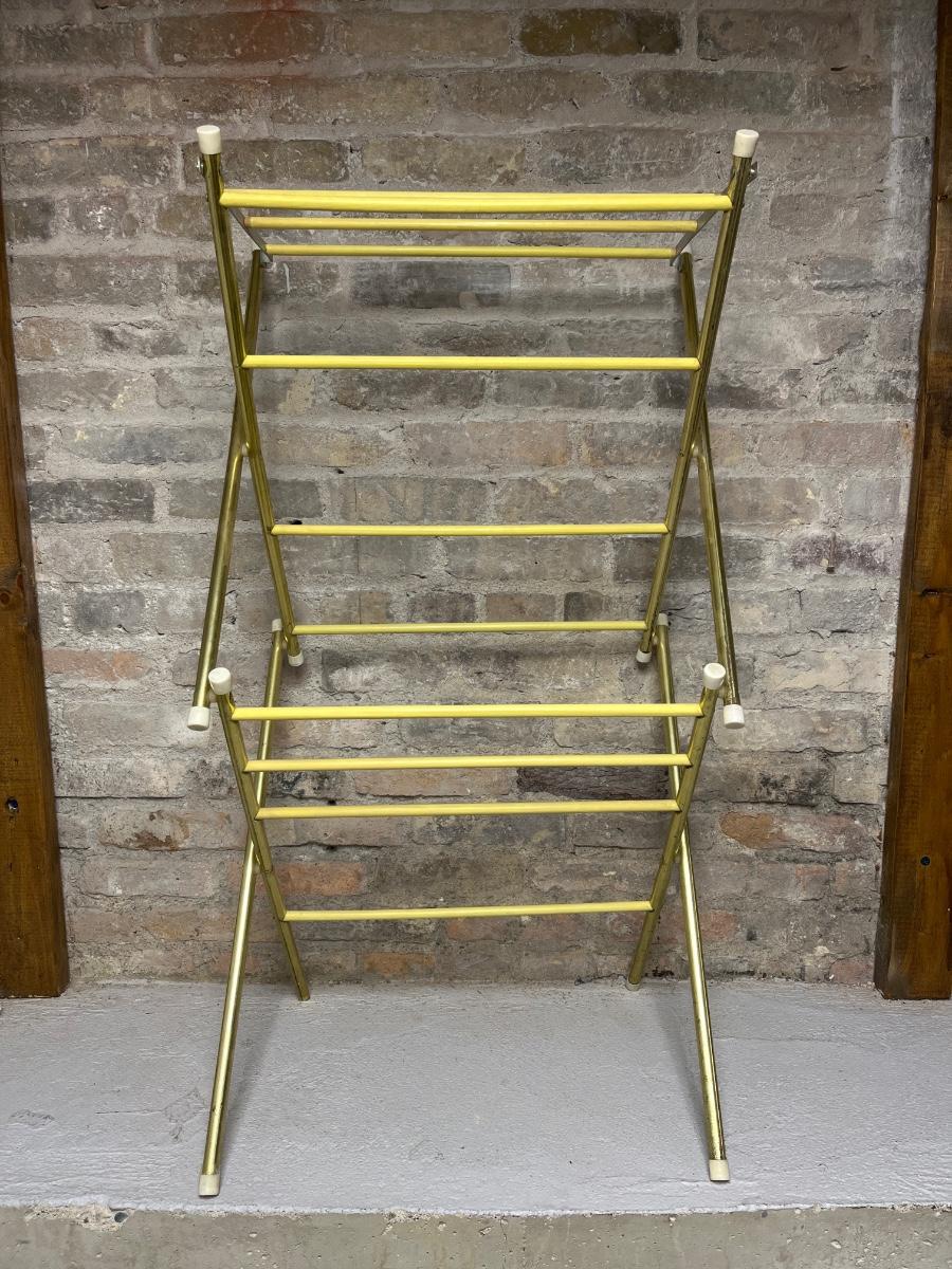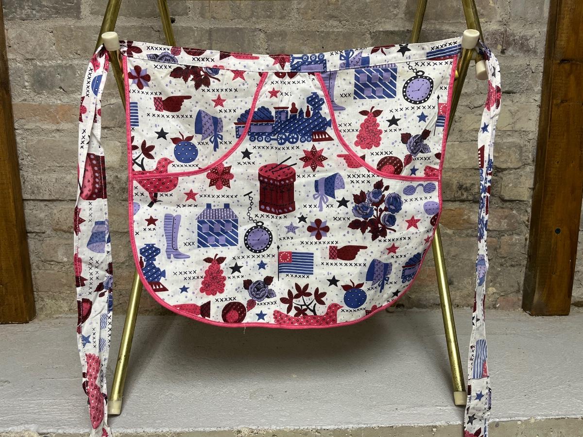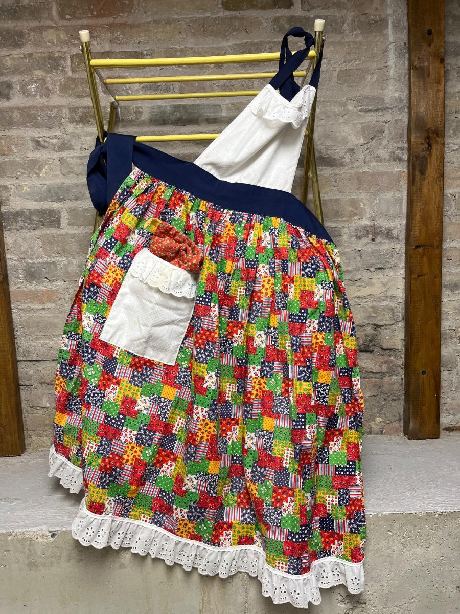 Wedding waitress aprons, cook’s aprons, a children’s apron, and even two with matching pot holders, all on a vintage metal laundry rack