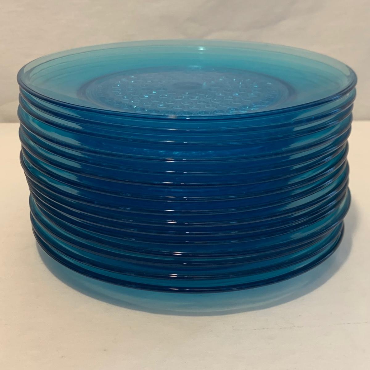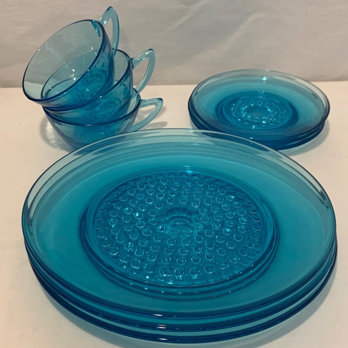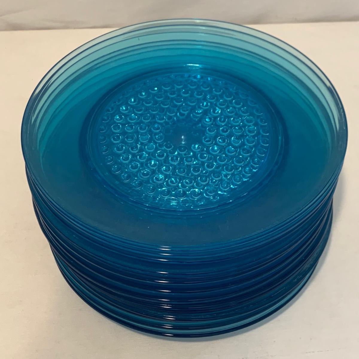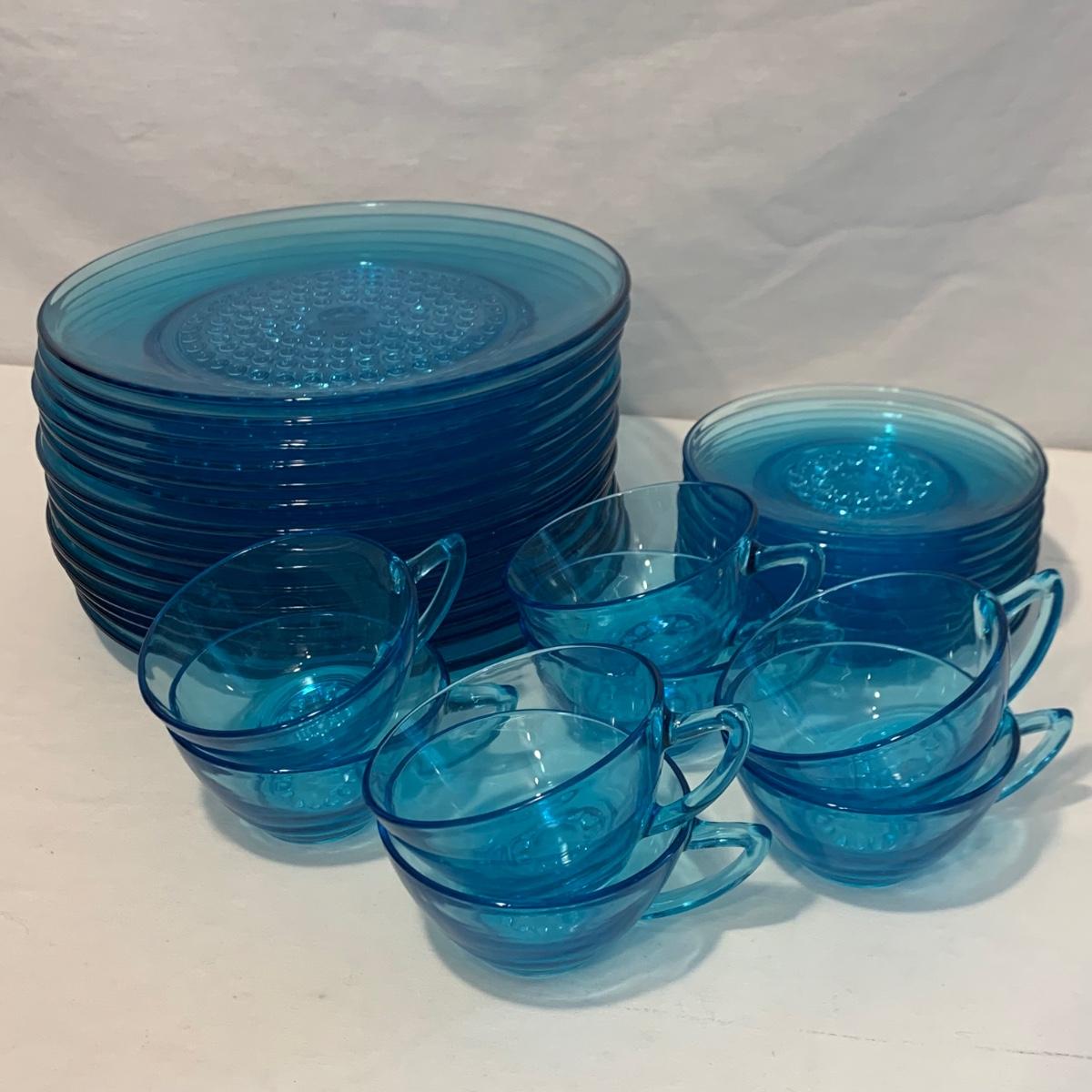A set of 15 dinner plates that are 10”D, with eight cups and eight saucers. They are a light aqua blue color and have a fun bubble look on the bottom. No chips or cracks seen, but a few dinner plates have light scratches and the set needs to be cleaned.