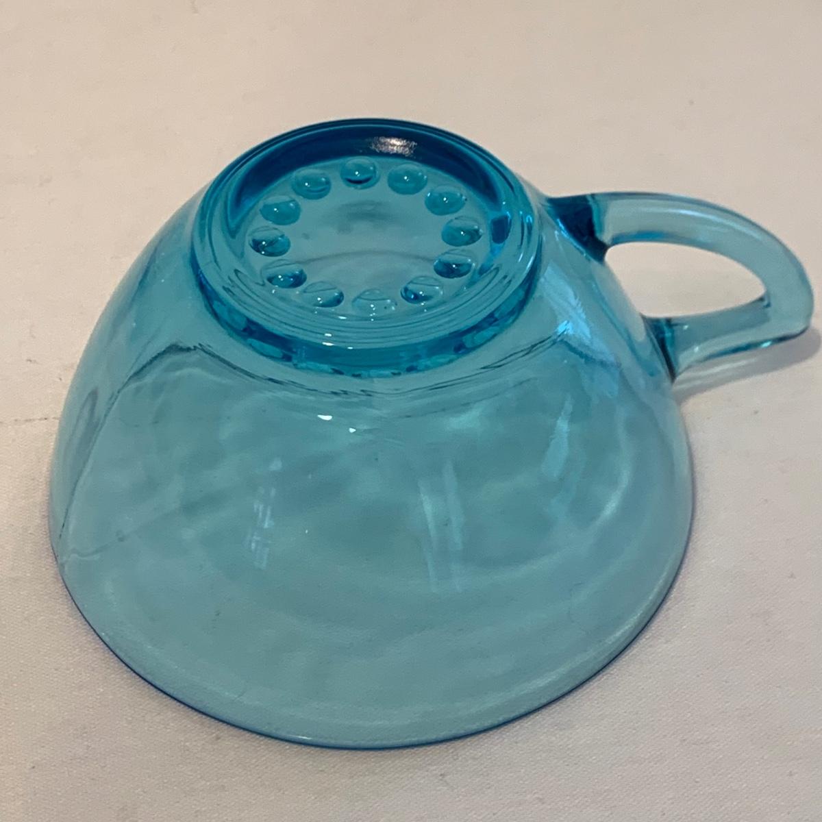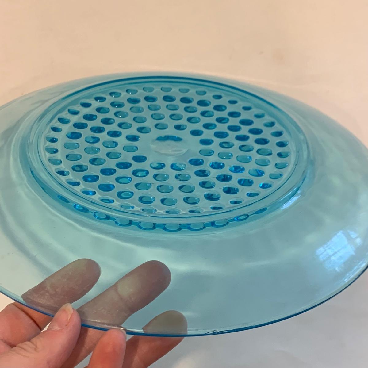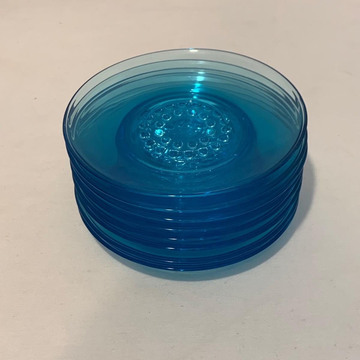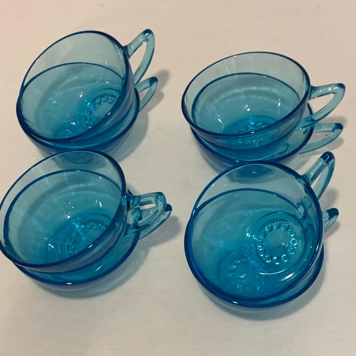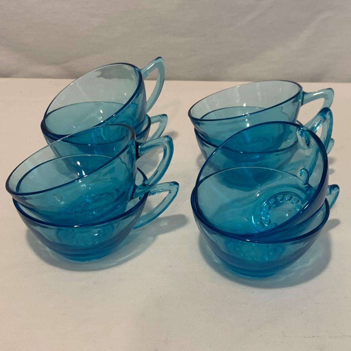 A set of 15 dinner plates that are 10”D, with eight cups and eight saucers. They are a light aqua blue color and have a fun bubble look on the bottom. No chips or cracks seen, but a few dinner plates have light scratches and the set needs to be cleaned.