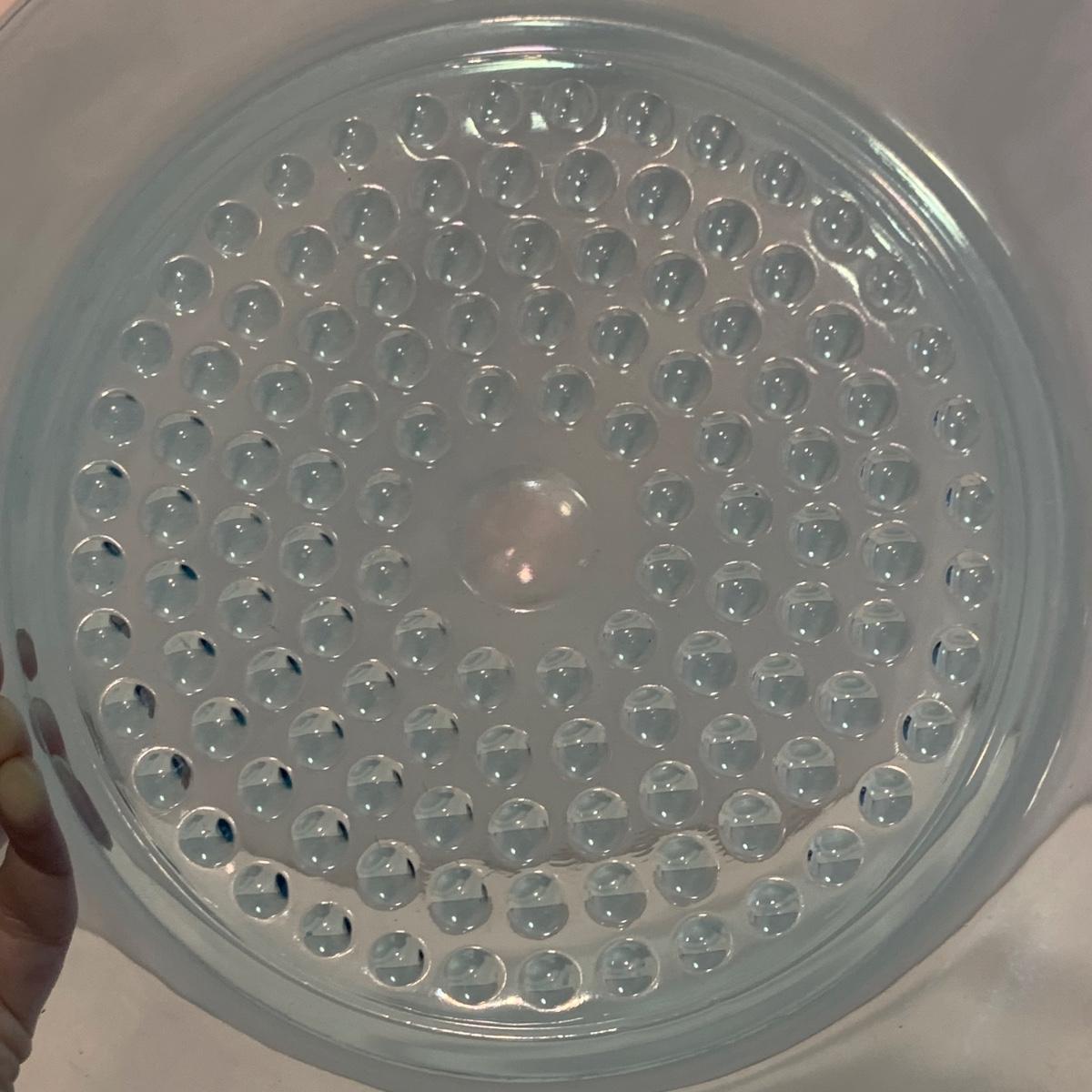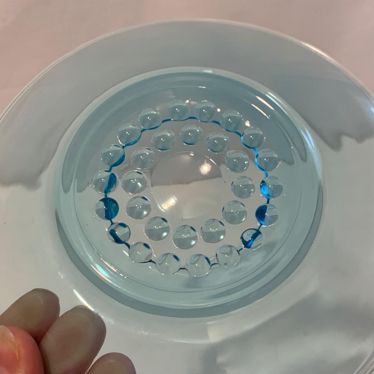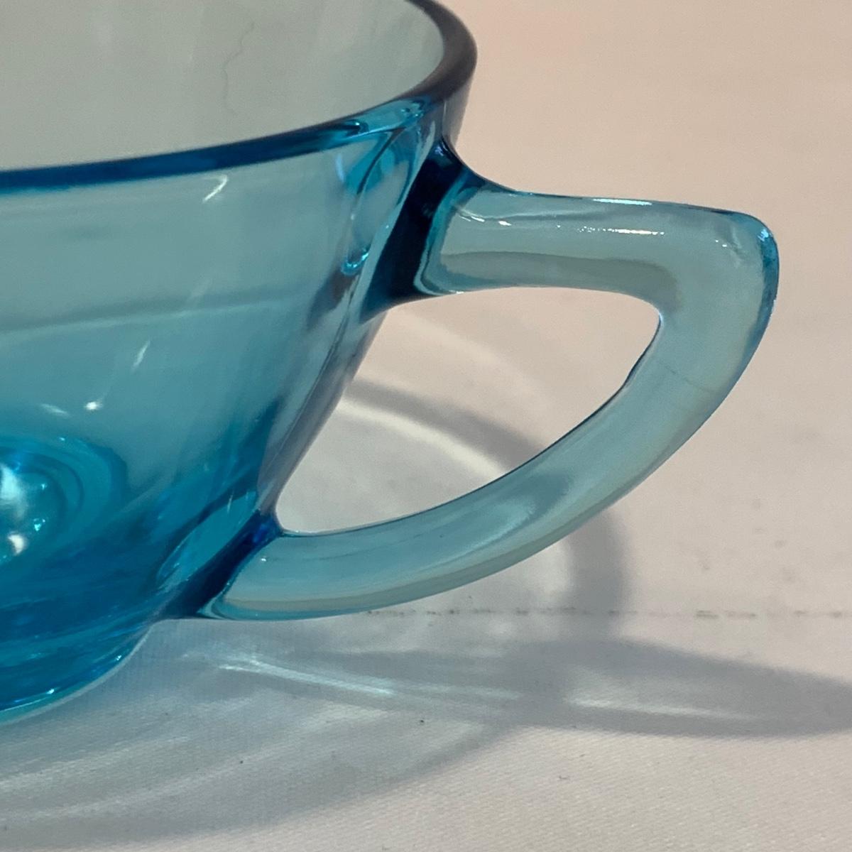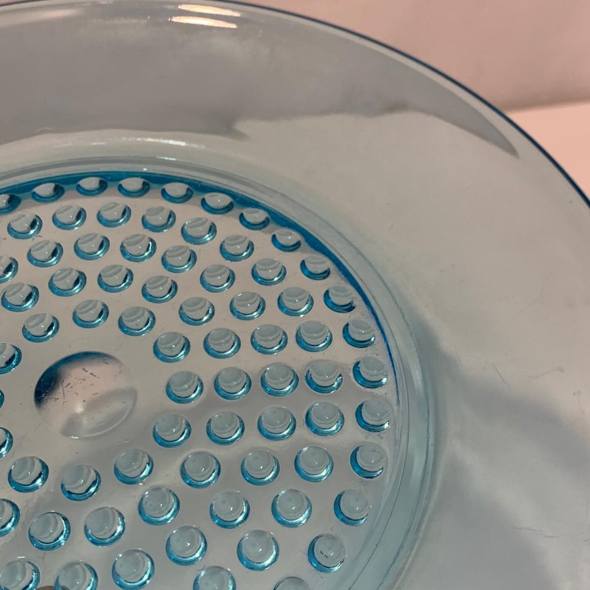 A set of 15 dinner plates that are 10”D, with eight cups and eight saucers. They are a light aqua blue color and have a fun bubble look on the bottom. No chips or cracks seen, but a few dinner plates have light scratches and the set needs to be cleaned.