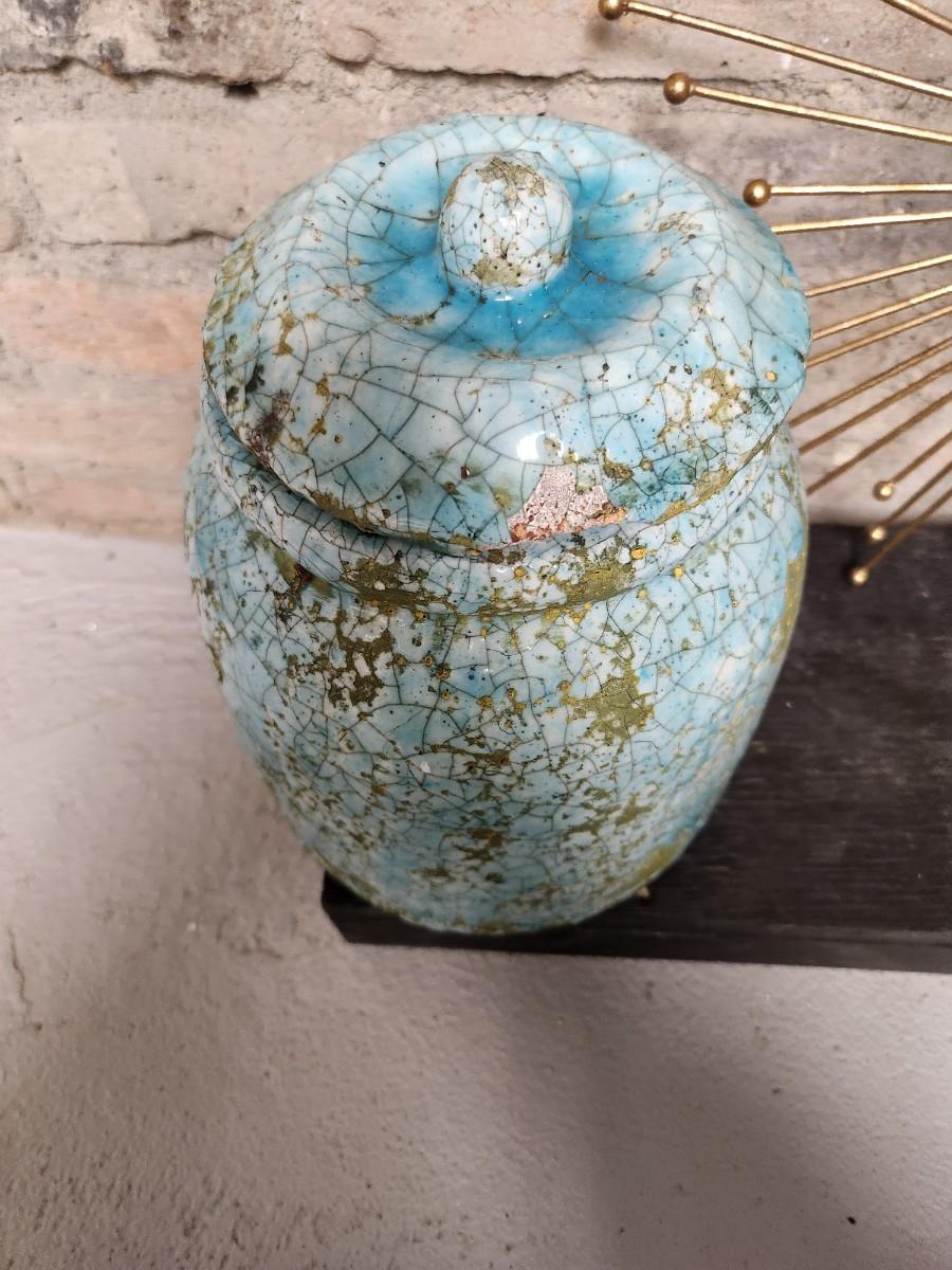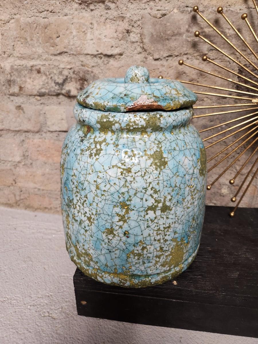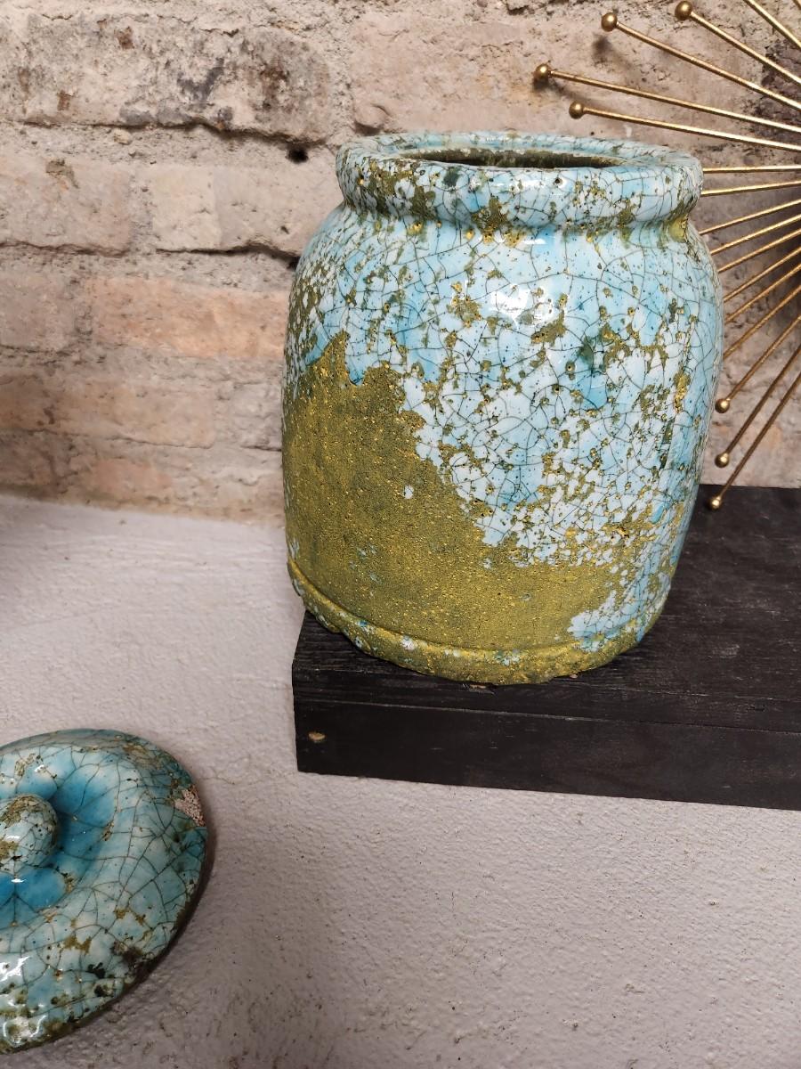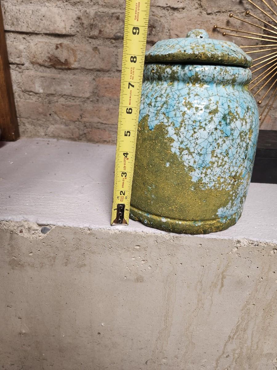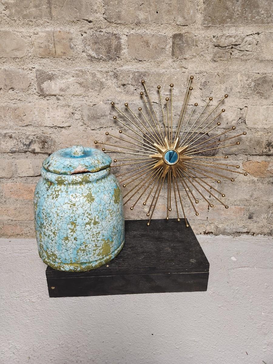 Newer from Scheels. Jar is terra cotta and crackle glazed in turquoise and aqua and green. The starburst decor has a small mirror in the middle