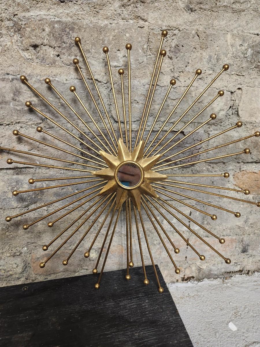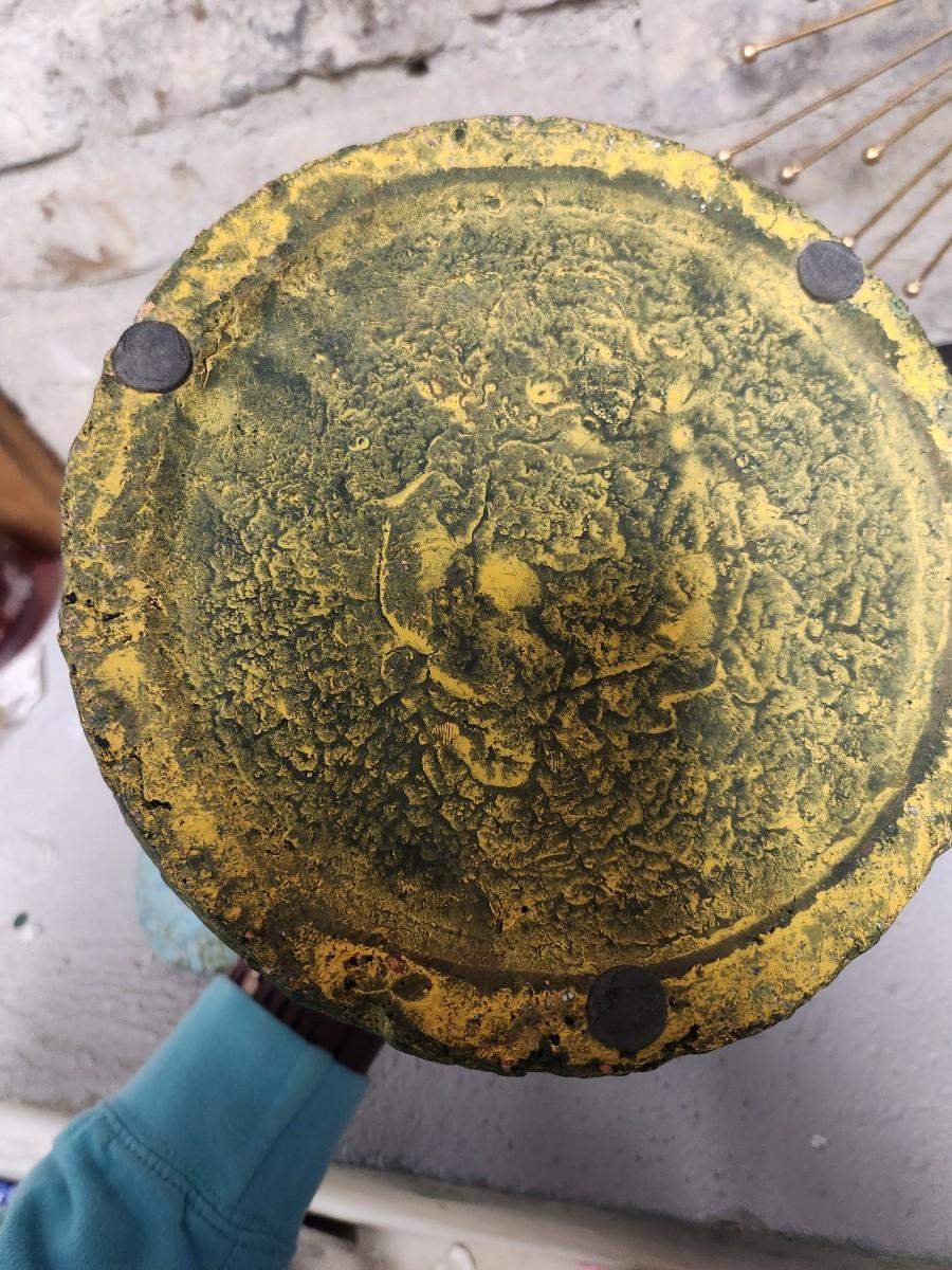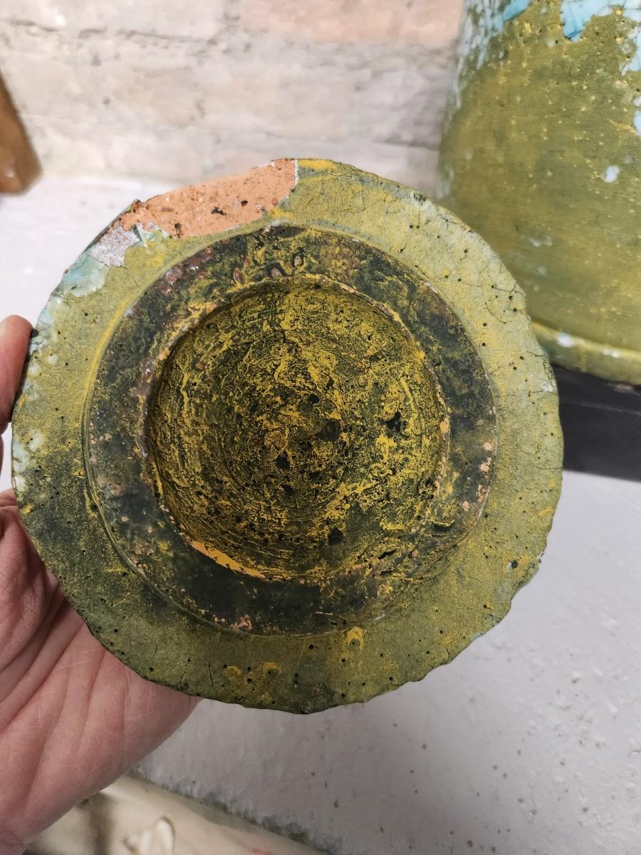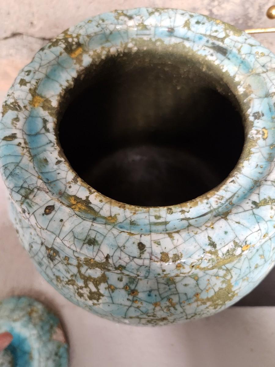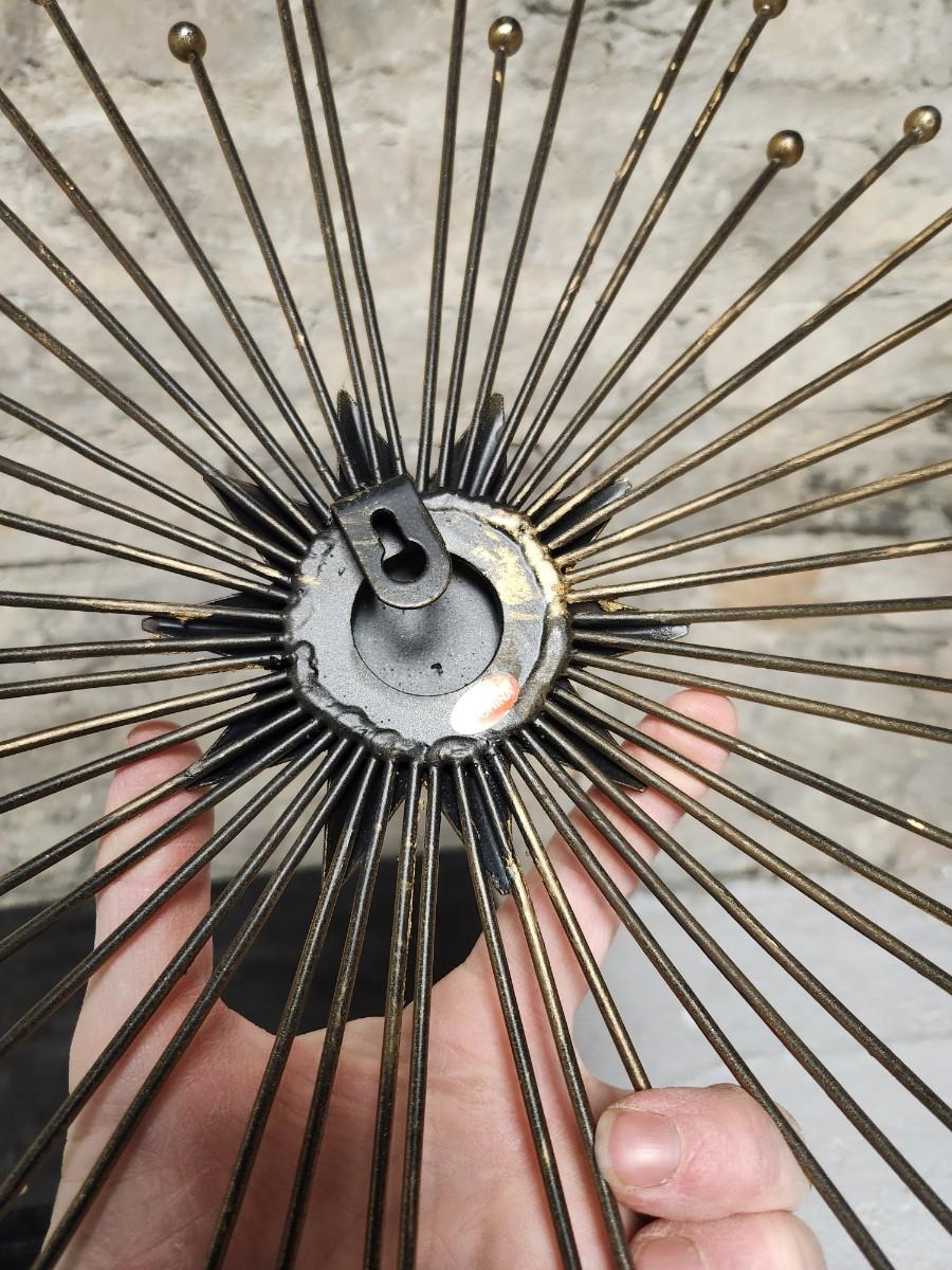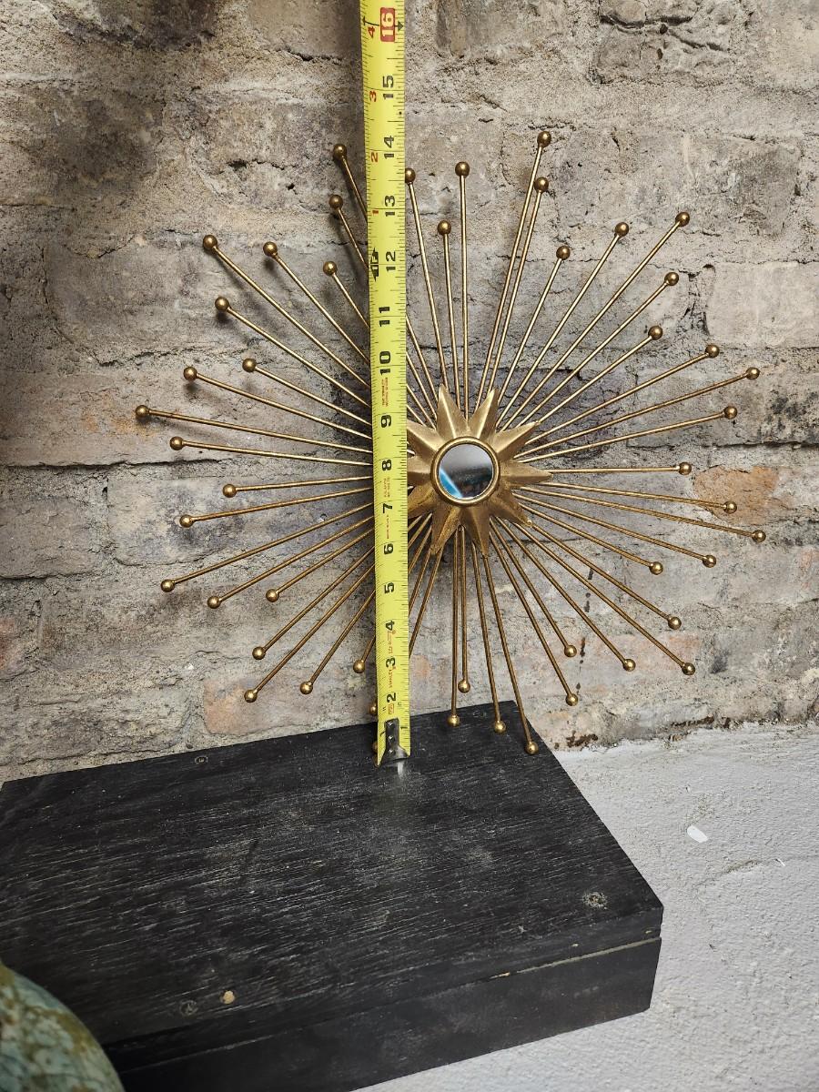 Newer from Scheels. Jar is terra cotta and crackle glazed in turquoise and aqua and green. The starburst decor has a small mirror in the middle