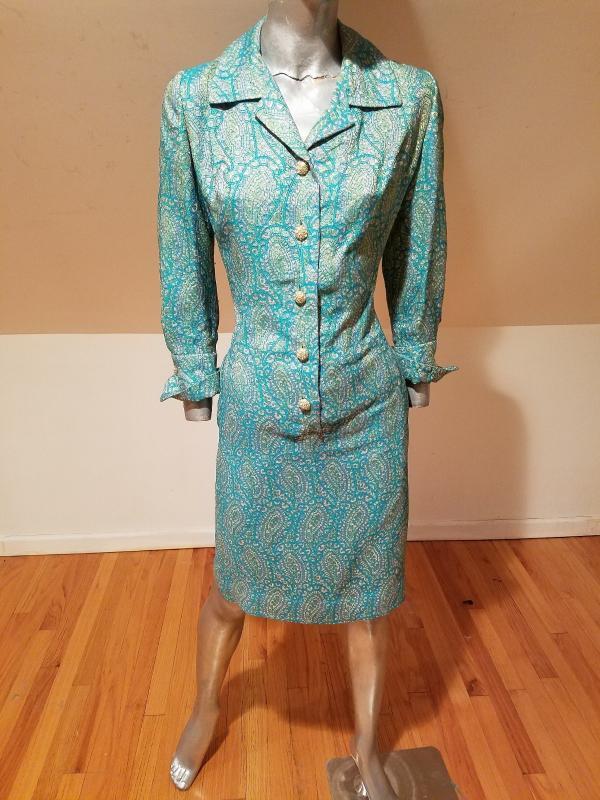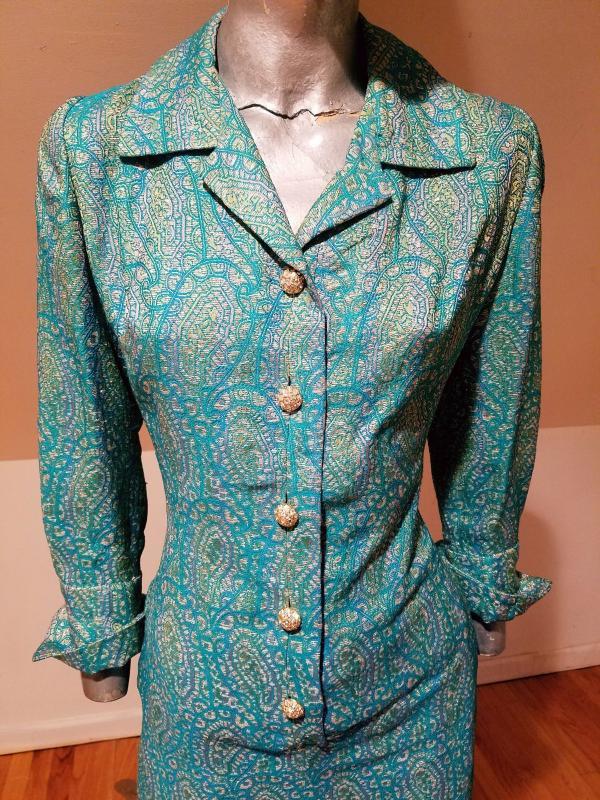 A fantastic Trapeze brocade metallic coat dress with amazing gold rhinestone buttons