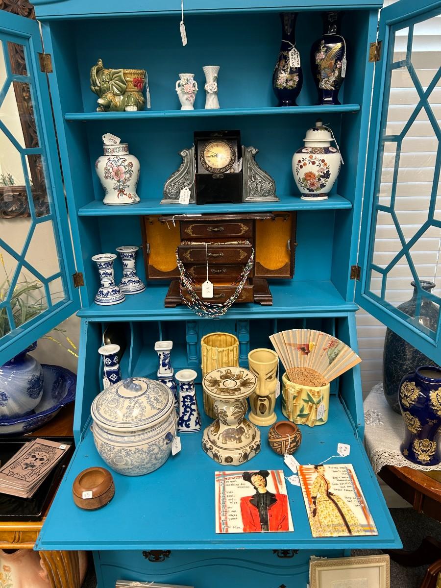 Antique solid secretary w/ hutch, painted aqua, brass serpentine design on hutch, ball feet, Chippendale top. Three wooden shelves, letter holder drawers and drop down desktop, three large drawers. Approx. 6.5' tall x 2.5' wide, 18" deep. VERY GOOD - some flecking on paint.