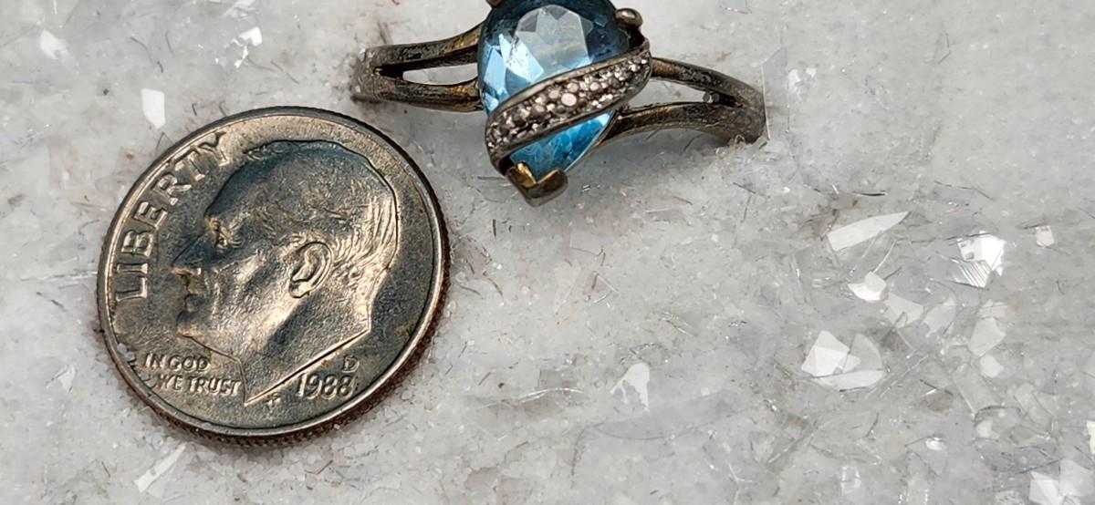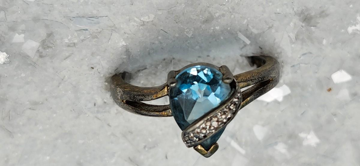 The aquamarine is lovely, with a sash of diamonds across the front. Size 8