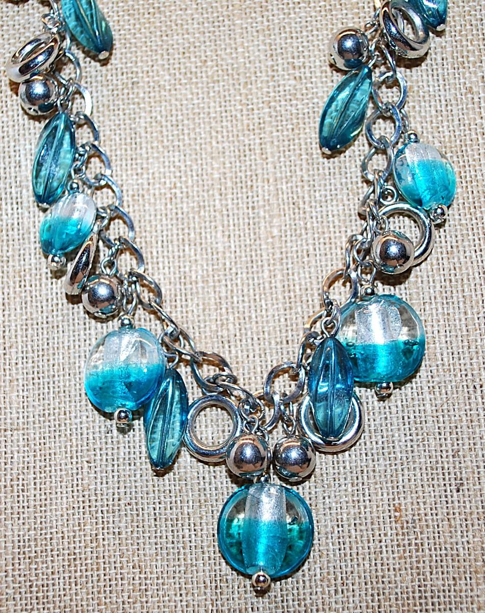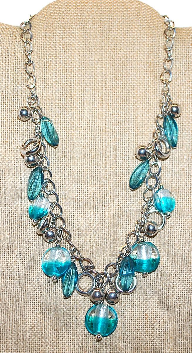 Aquamarine Colored "DISKS & SWIRLS" NECKLACE with Silver Tone Loops, Circles and Globes Accents and Lobster Clasp 19" L