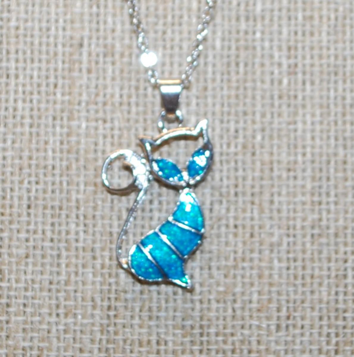 Aquamarine "Fancy Cat" PENDANT (1¼" x ¾") on a Silver Tone ADJUSTABLE Chain 17"-19" L