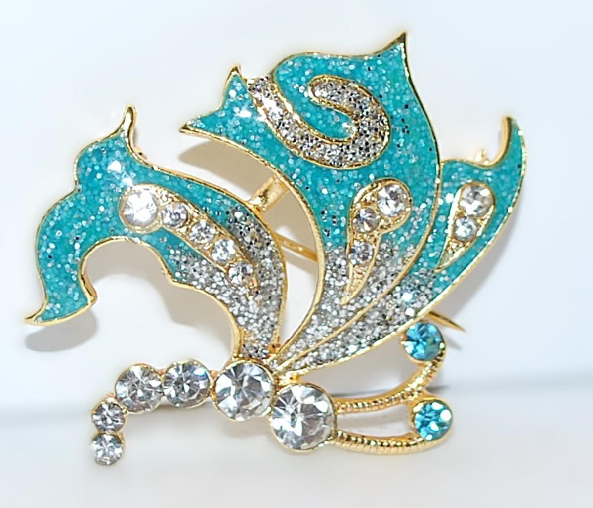 AQUAMARINE "Jumping Dolphins" BROOCH (1½" x 1½") with Body & "Waves" Jeweled Accent Stones on a Gold Tone Setting