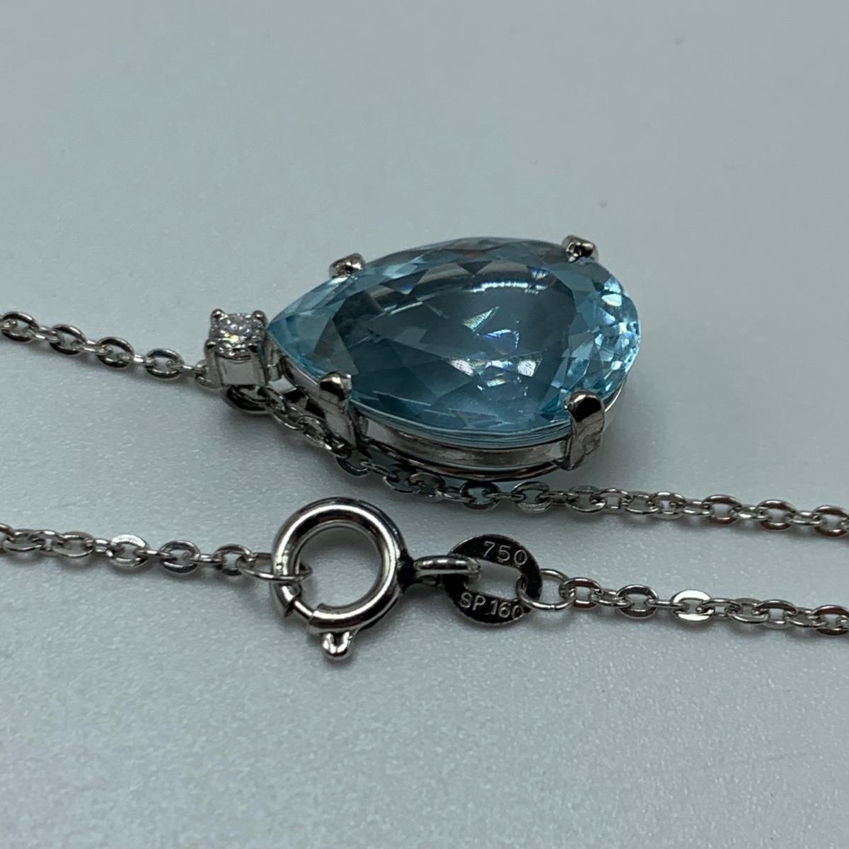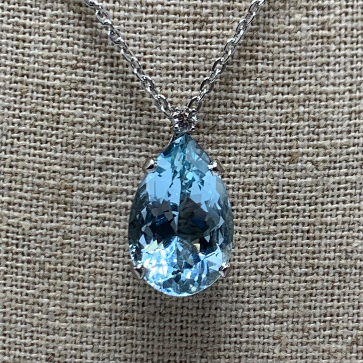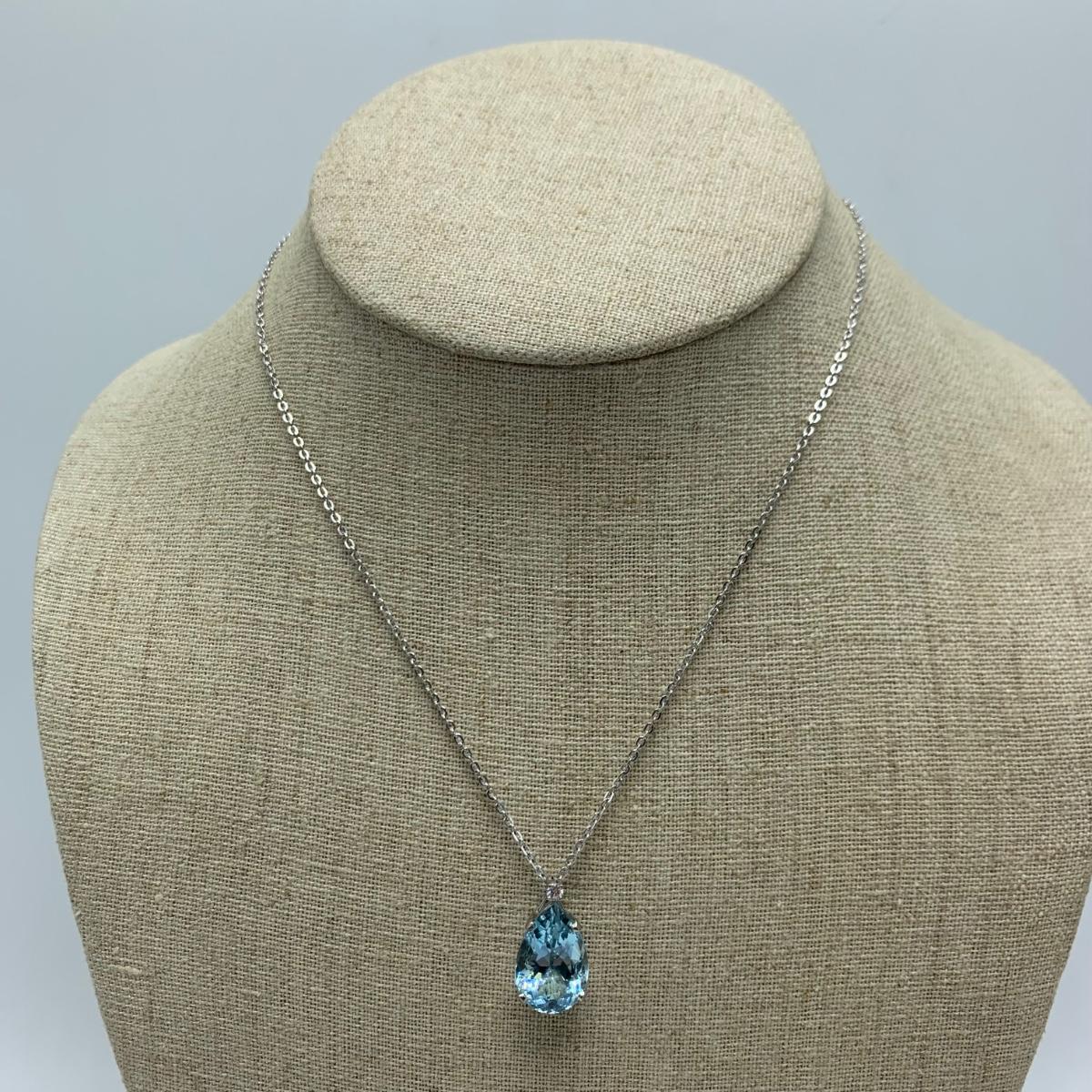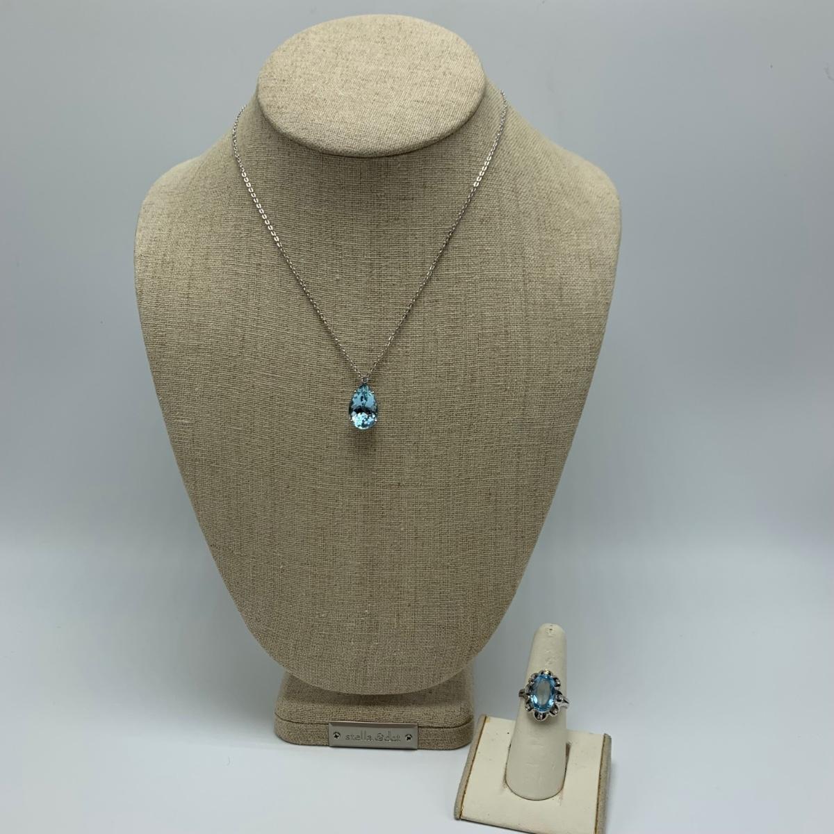 Gorgeous pear cut faceted gemstone that is aquamarine in color, with a small rhinestone sitting on top. Pendant is on a 15.5” chain marked 750 (signifying 18K). The gemstone on the ring is also aquamarine colored and is surrounded by eight small rhinestones in a floral shaped setting. Ring is stamped 18K. All sales are final. No returns or refunds. Please bid accordingly.