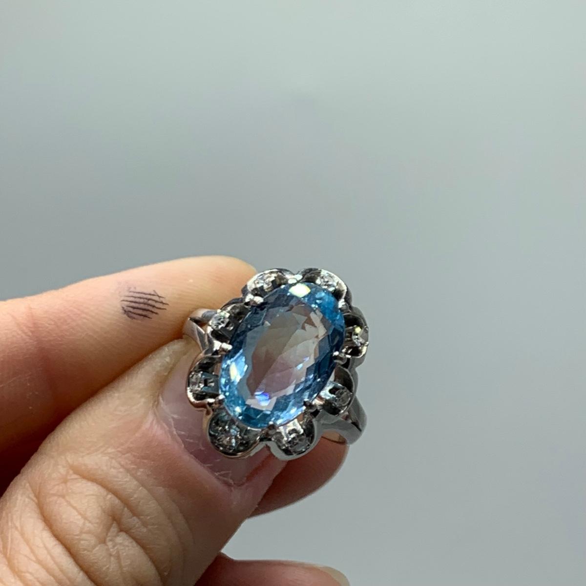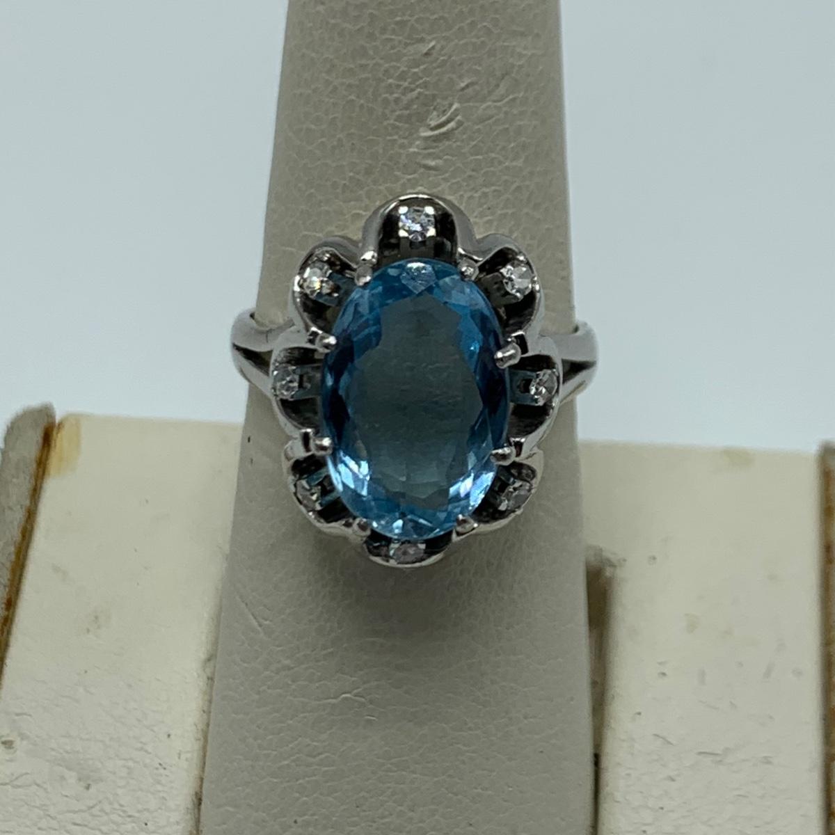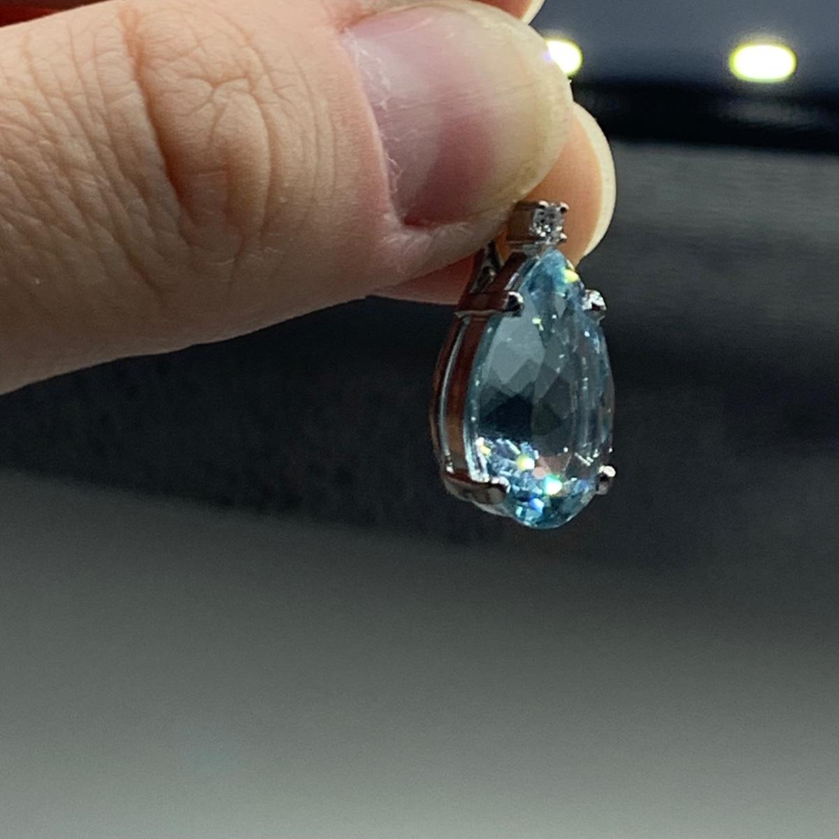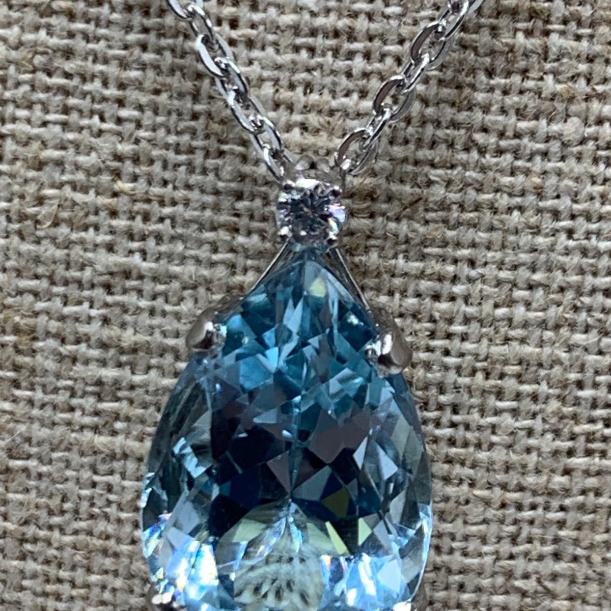 Gorgeous pear cut faceted gemstone that is aquamarine in color, with a small rhinestone sitting on top. Pendant is on a 15.5” chain marked 750 (signifying 18K). The gemstone on the ring is also aquamarine colored and is surrounded by eight small rhinestones in a floral shaped setting. Ring is stamped 18K. All sales are final. No returns or refunds. Please bid accordingly.