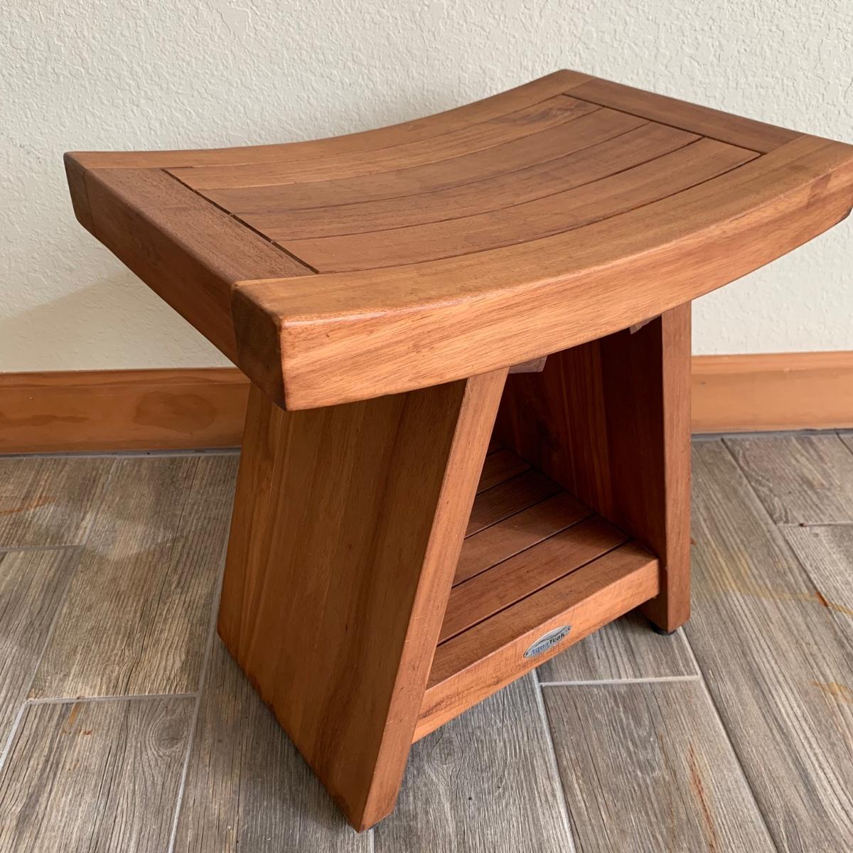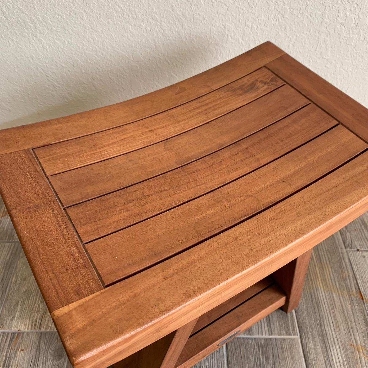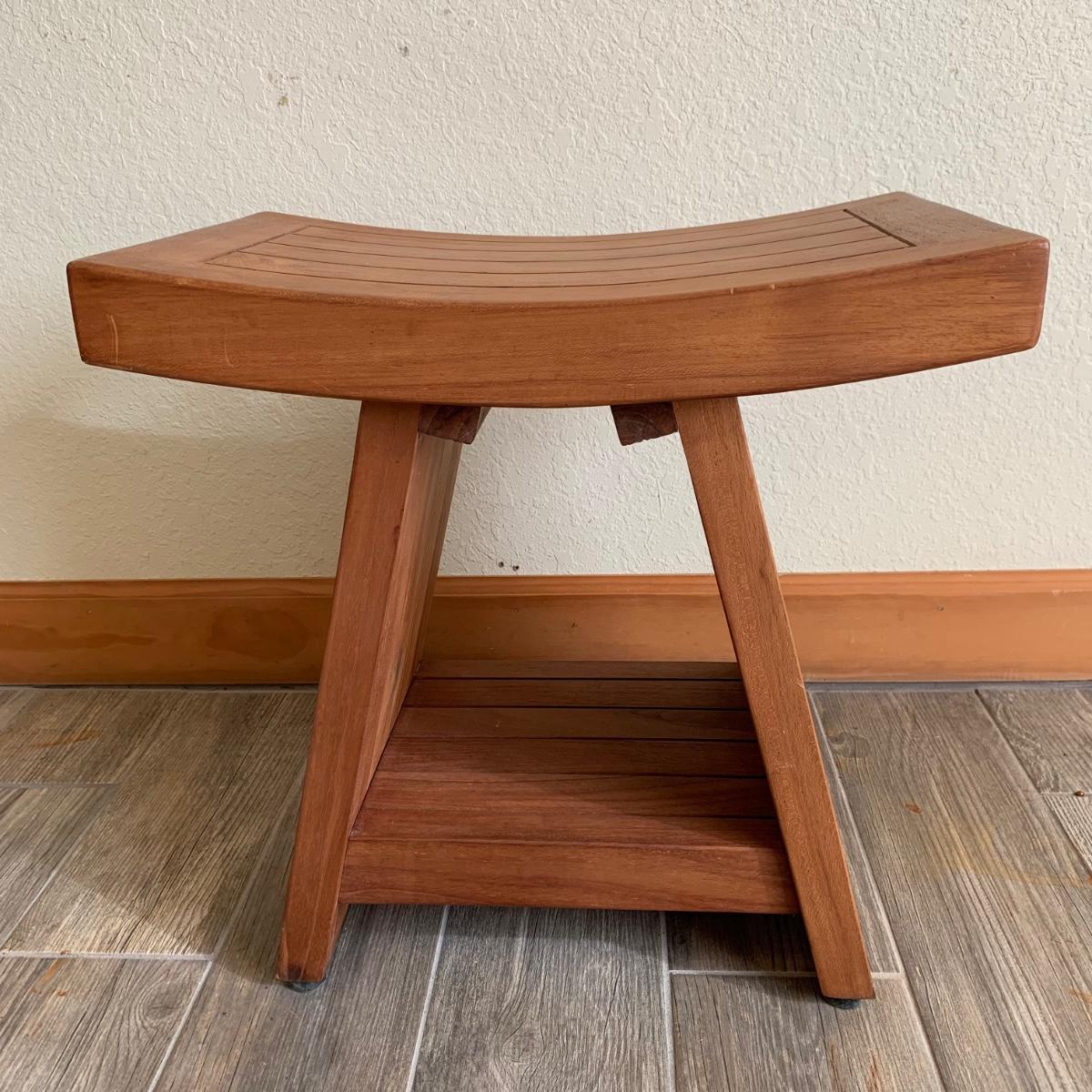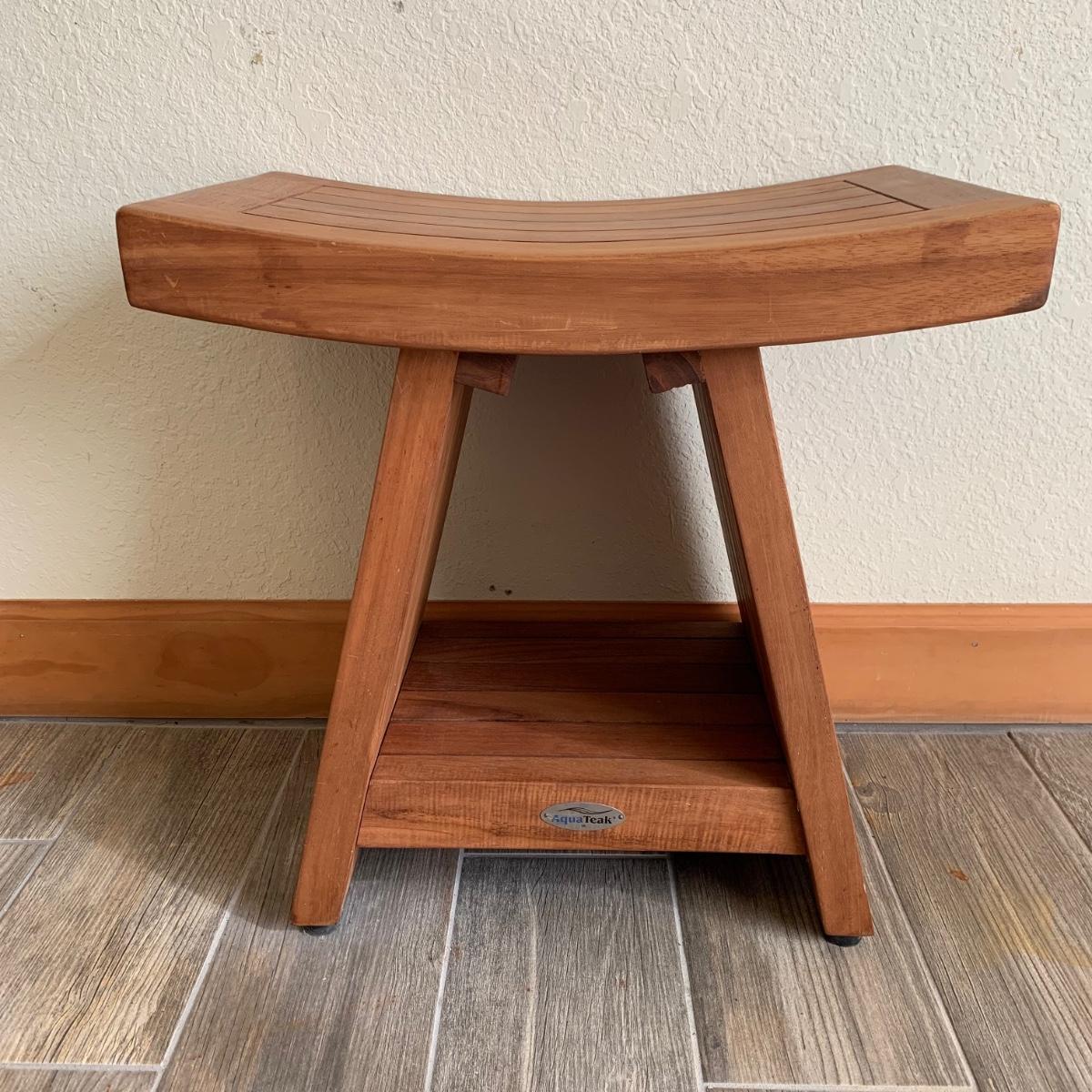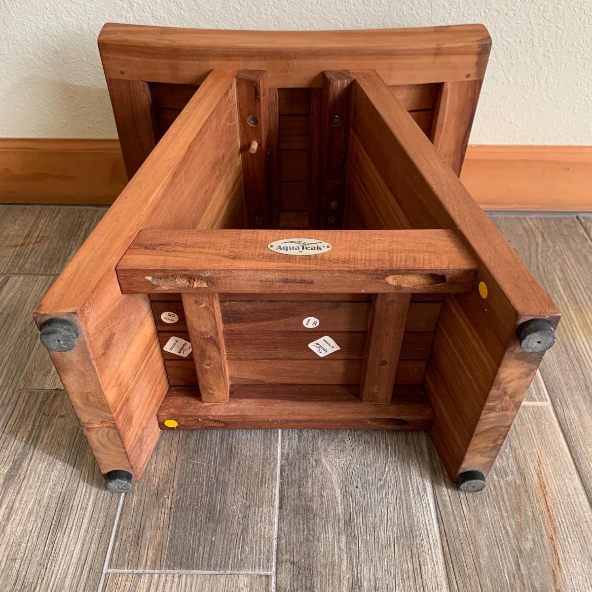 Aquateak brand wooden shower bench with shelf. Item measures 18” x 12” x 18.5”. It shows some signs of use, but is very sturdy and in good condition.