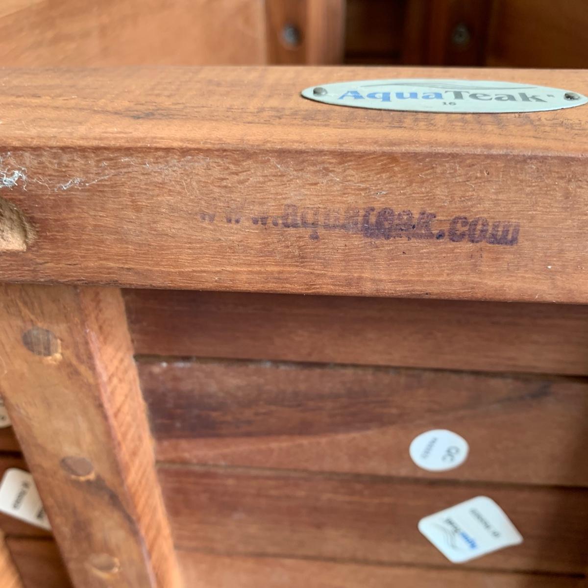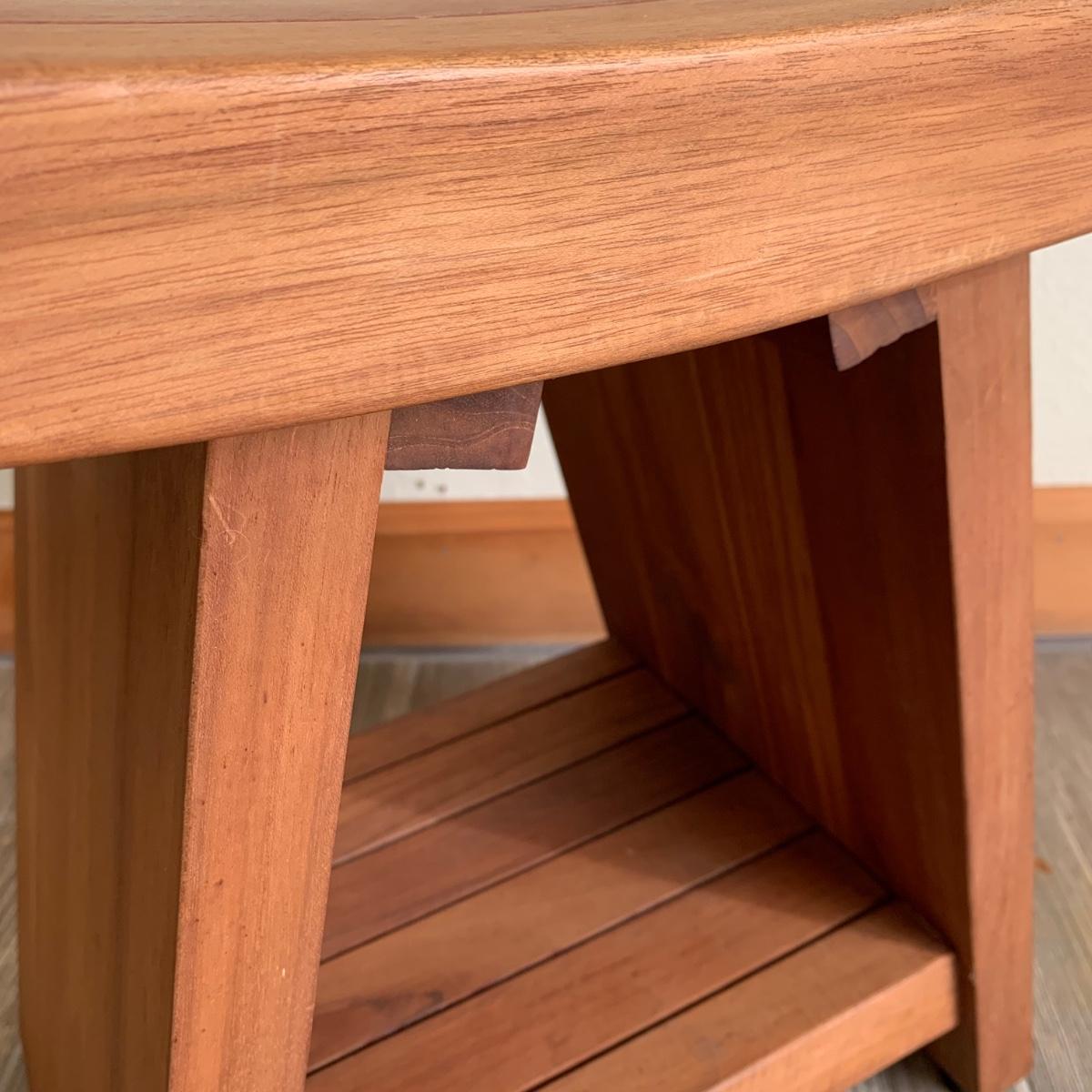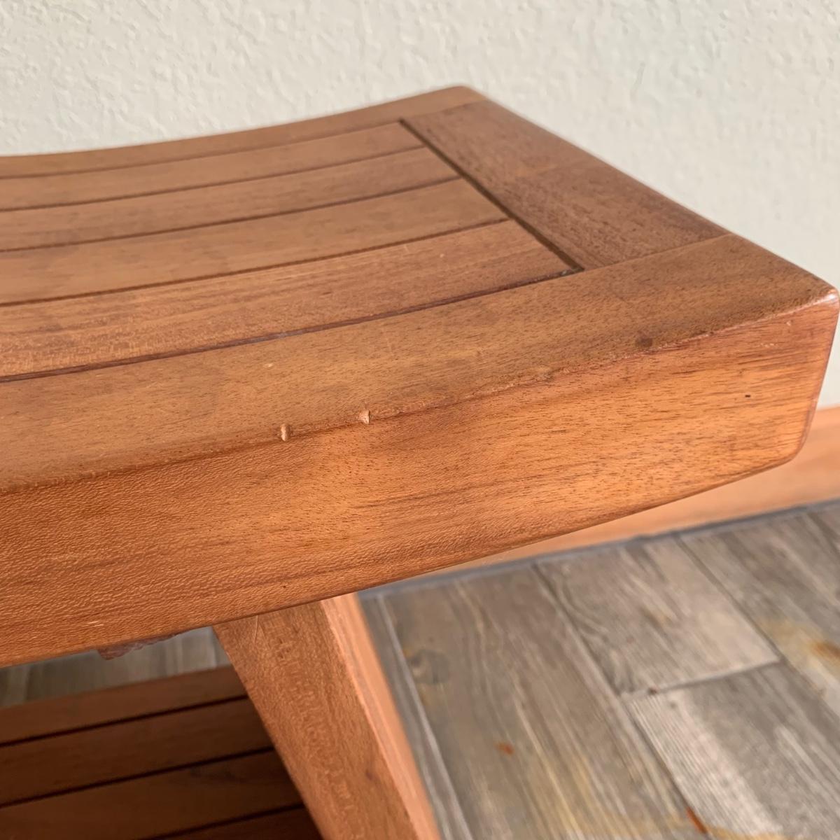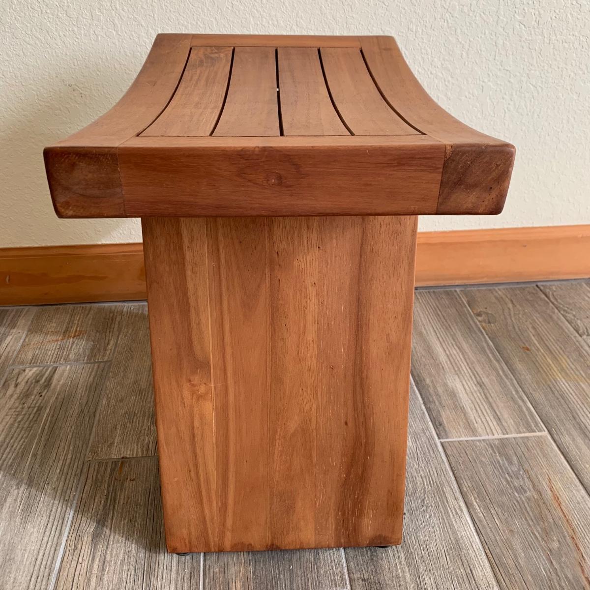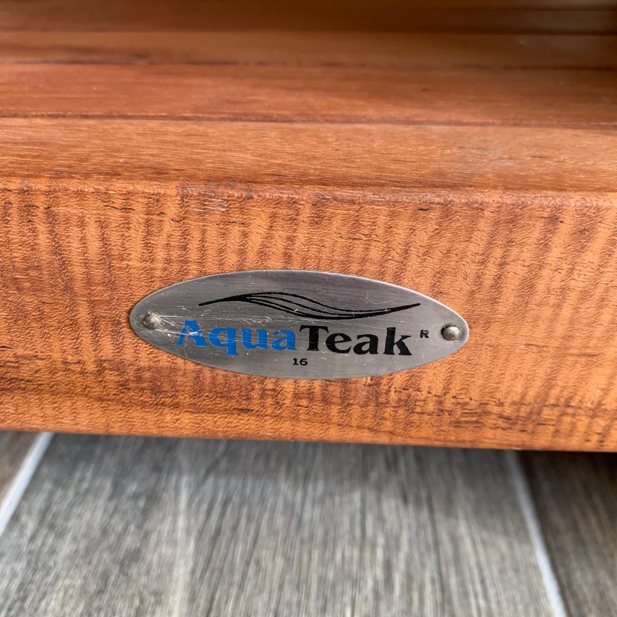 Aquateak brand wooden shower bench with shelf. Item measures 18” x 12” x 18.5”. It shows some signs of use, but is very sturdy and in good condition.