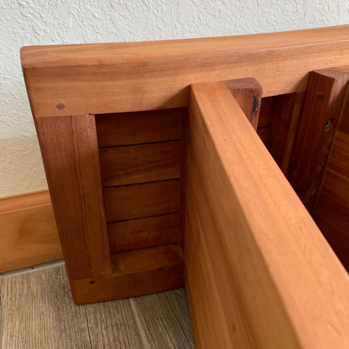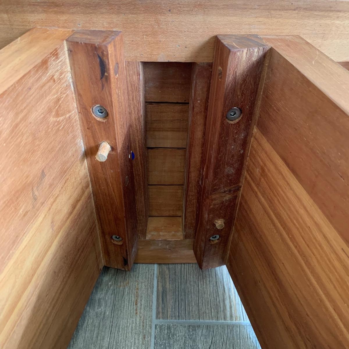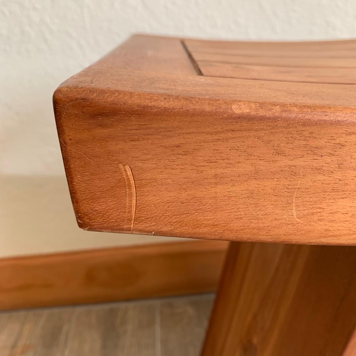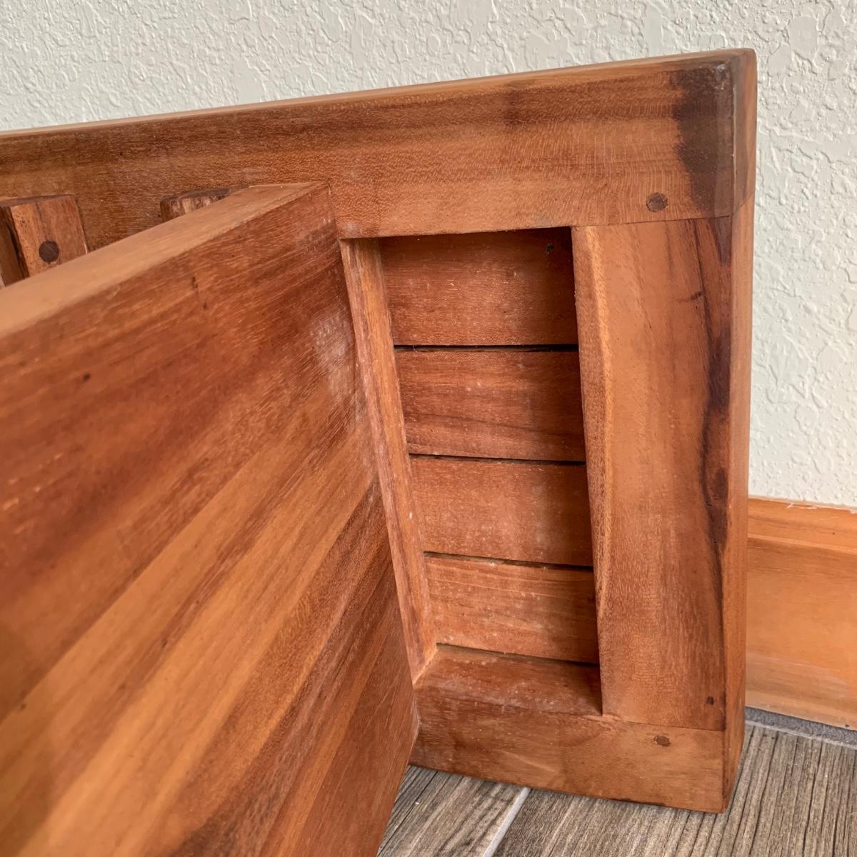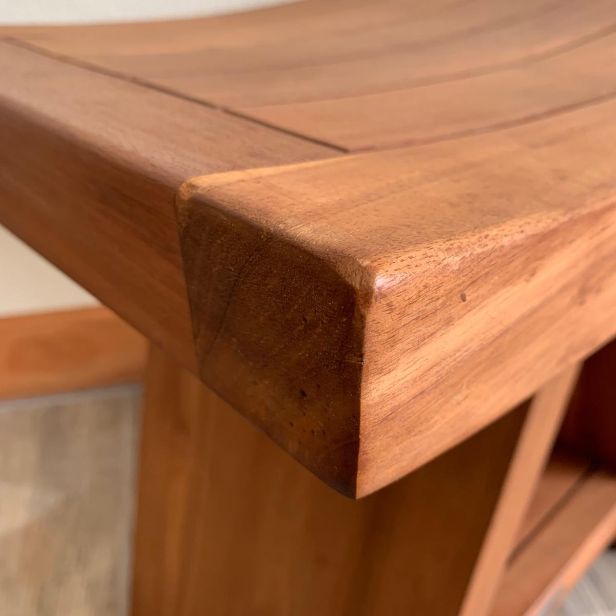 Aquateak brand wooden shower bench with shelf. Item measures 18” x 12” x 18.5”. It shows some signs of use, but is very sturdy and in good condition.
