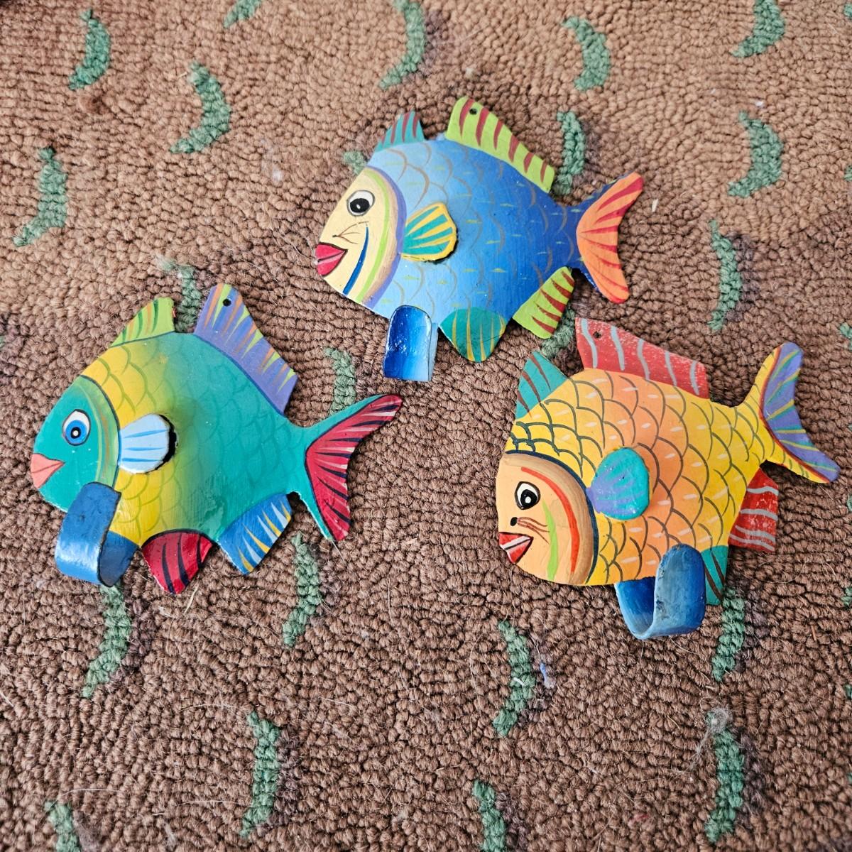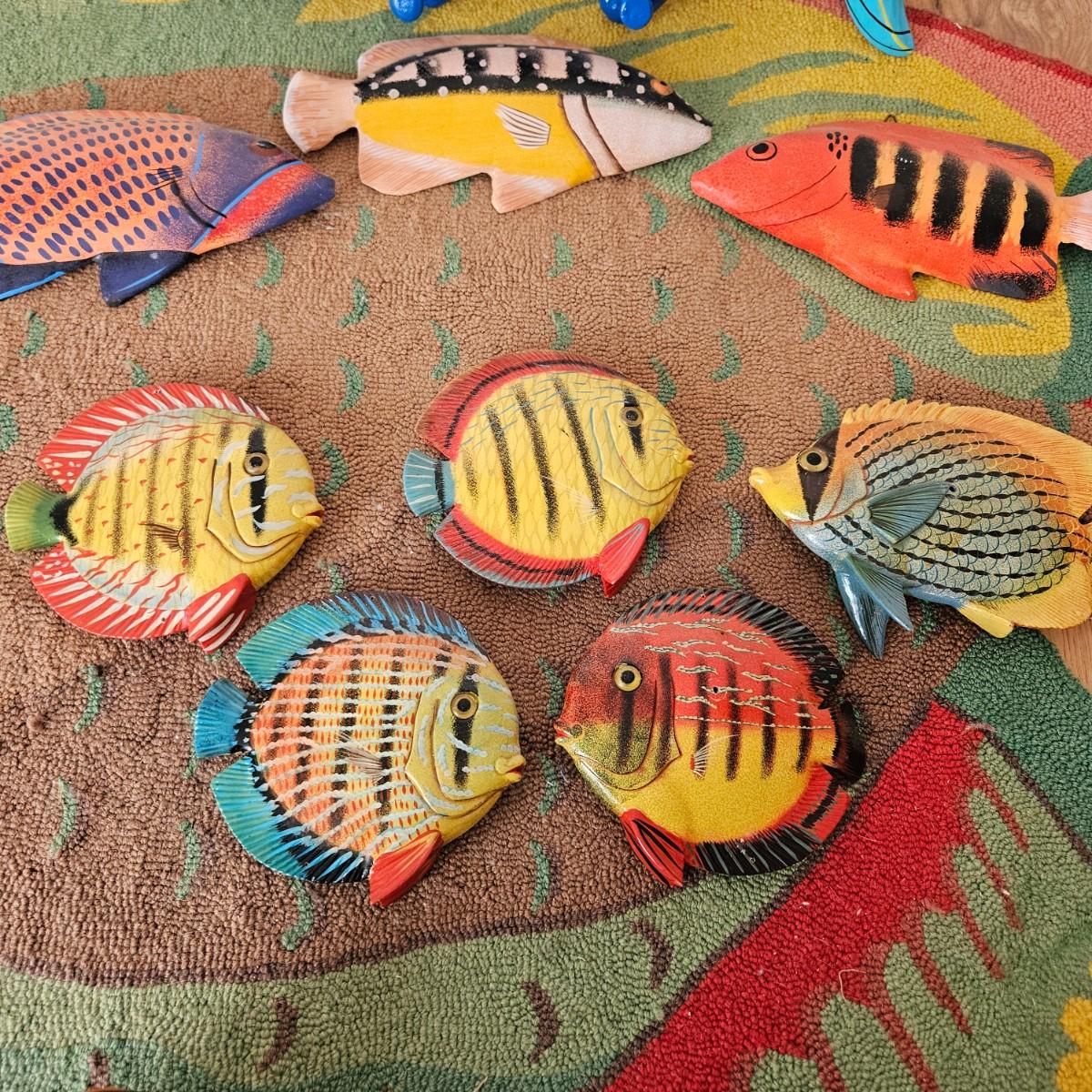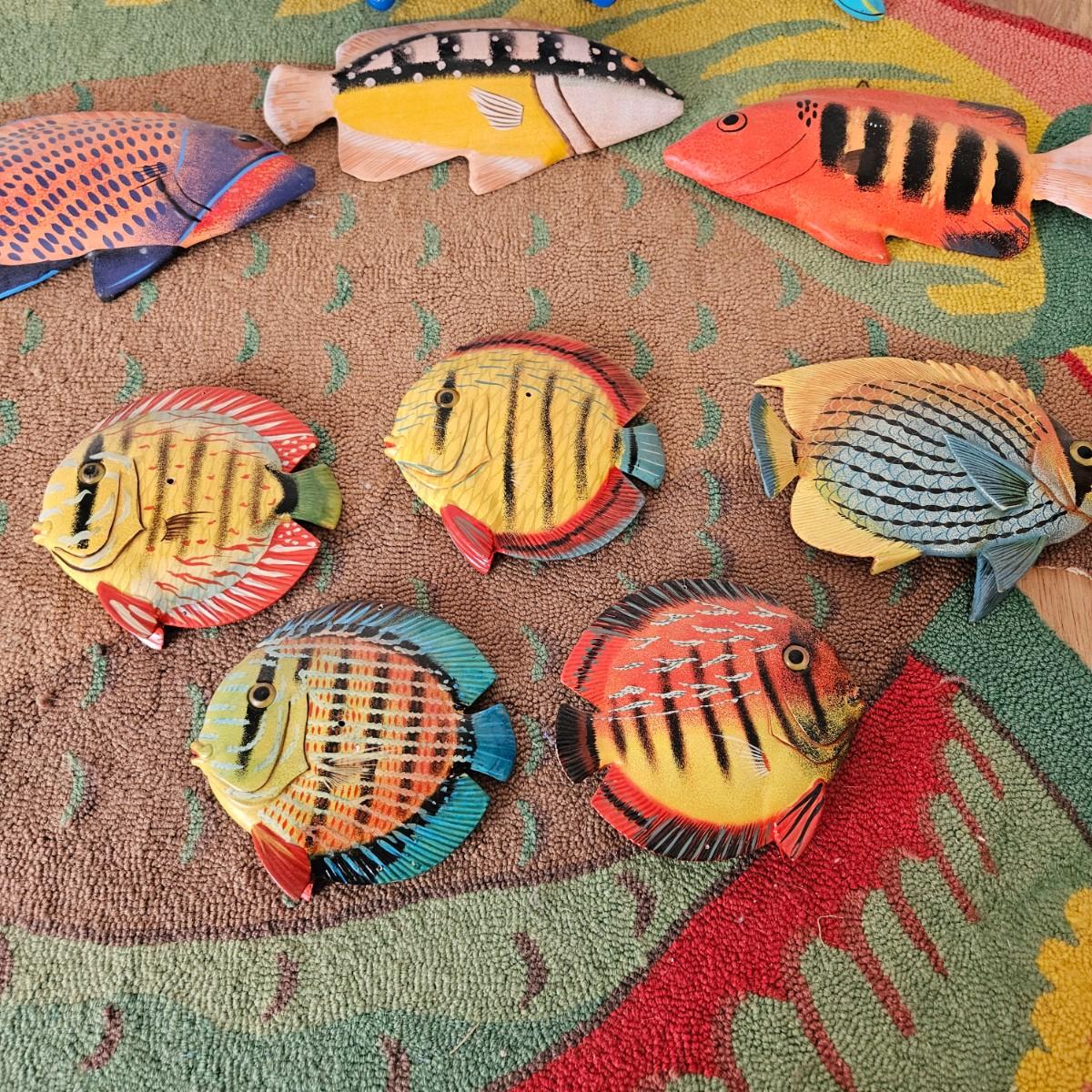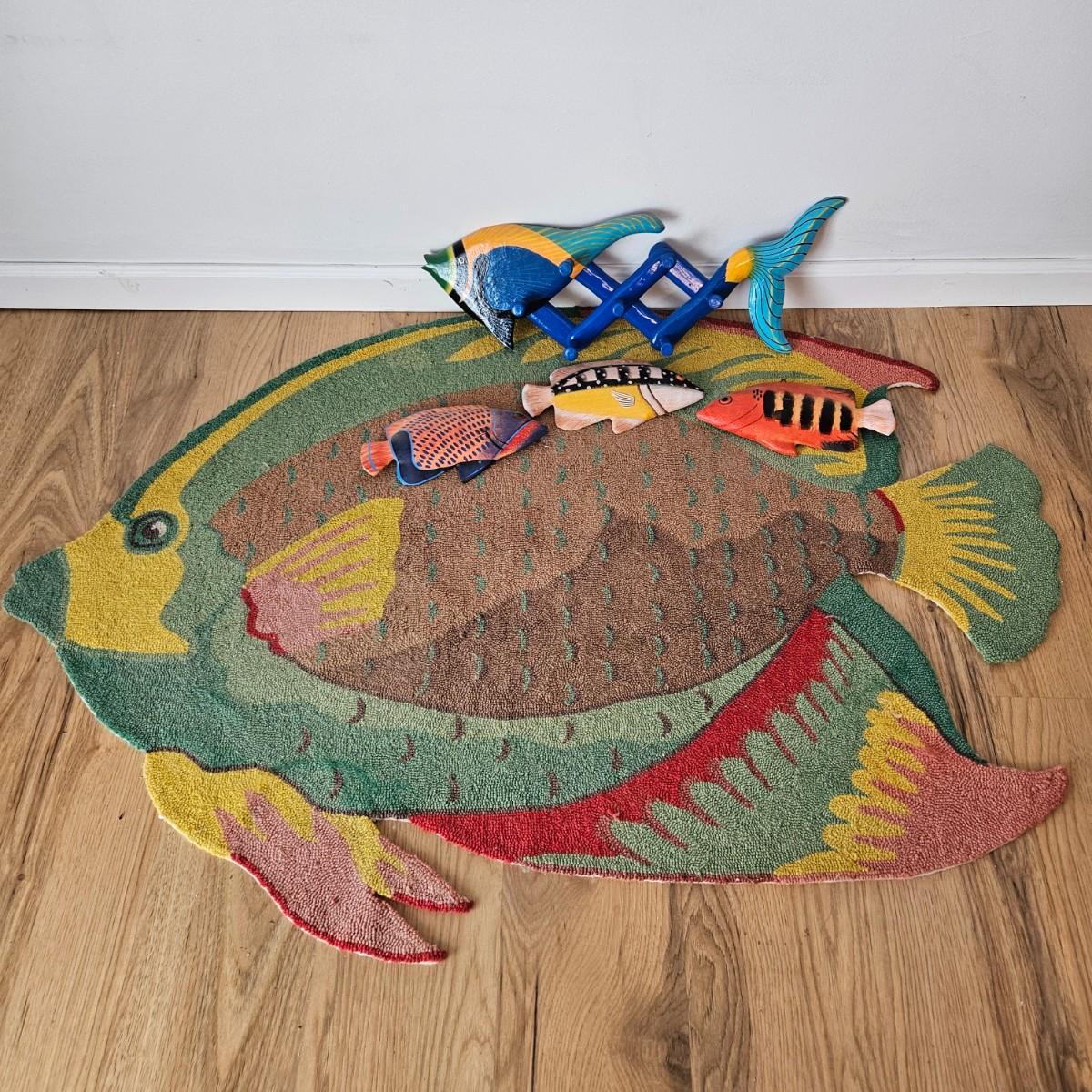 An assortment of fish decor that includes napkin rings, shower curtain hooks, a towel hanger, wall art pieces and more. See attached pictures for full inventory. Also includes a fish rug that measures approximately 53" x 37". Local pickup only