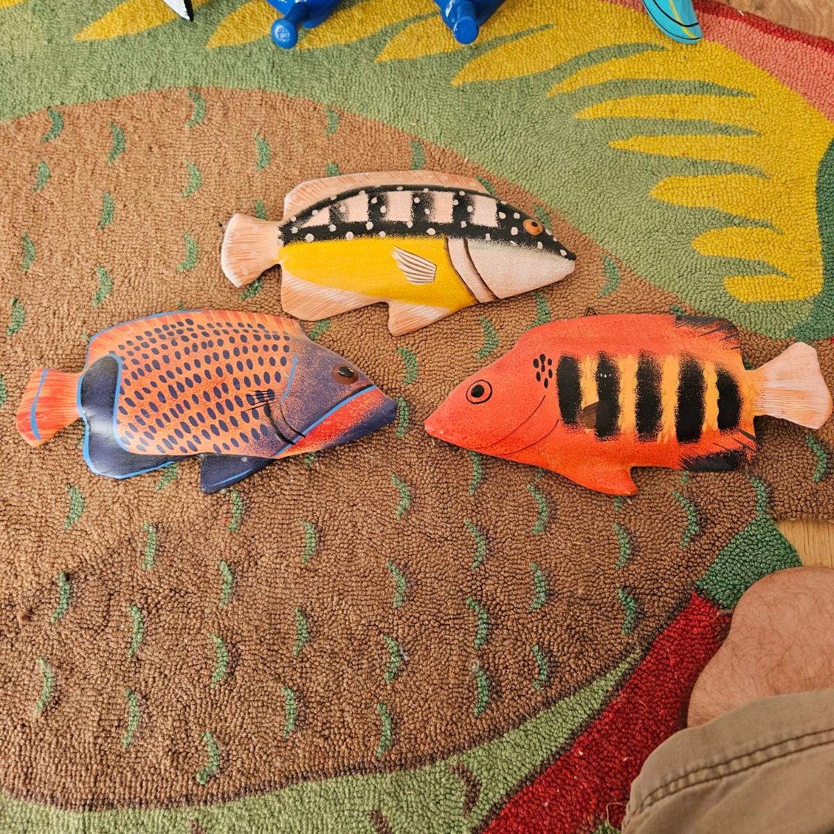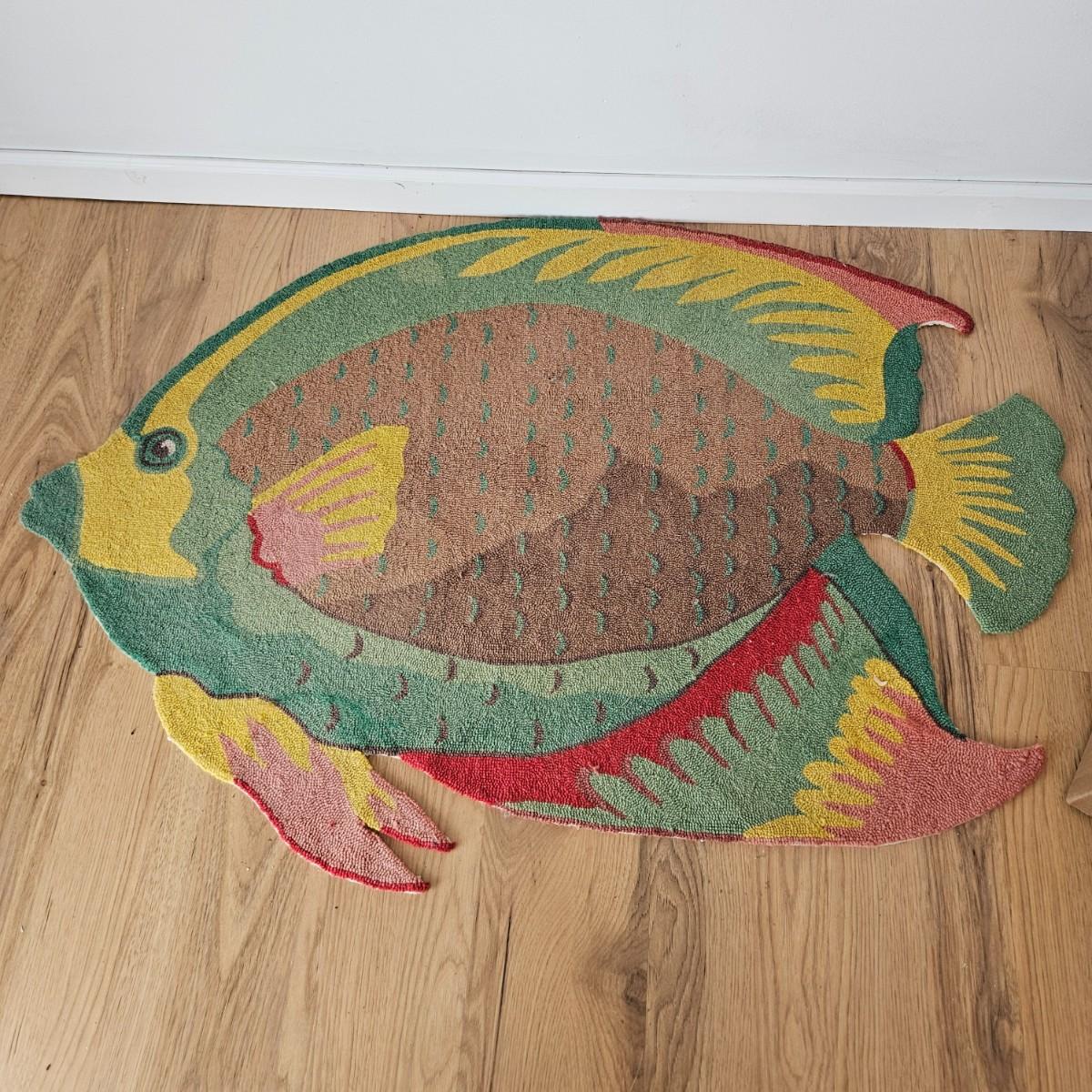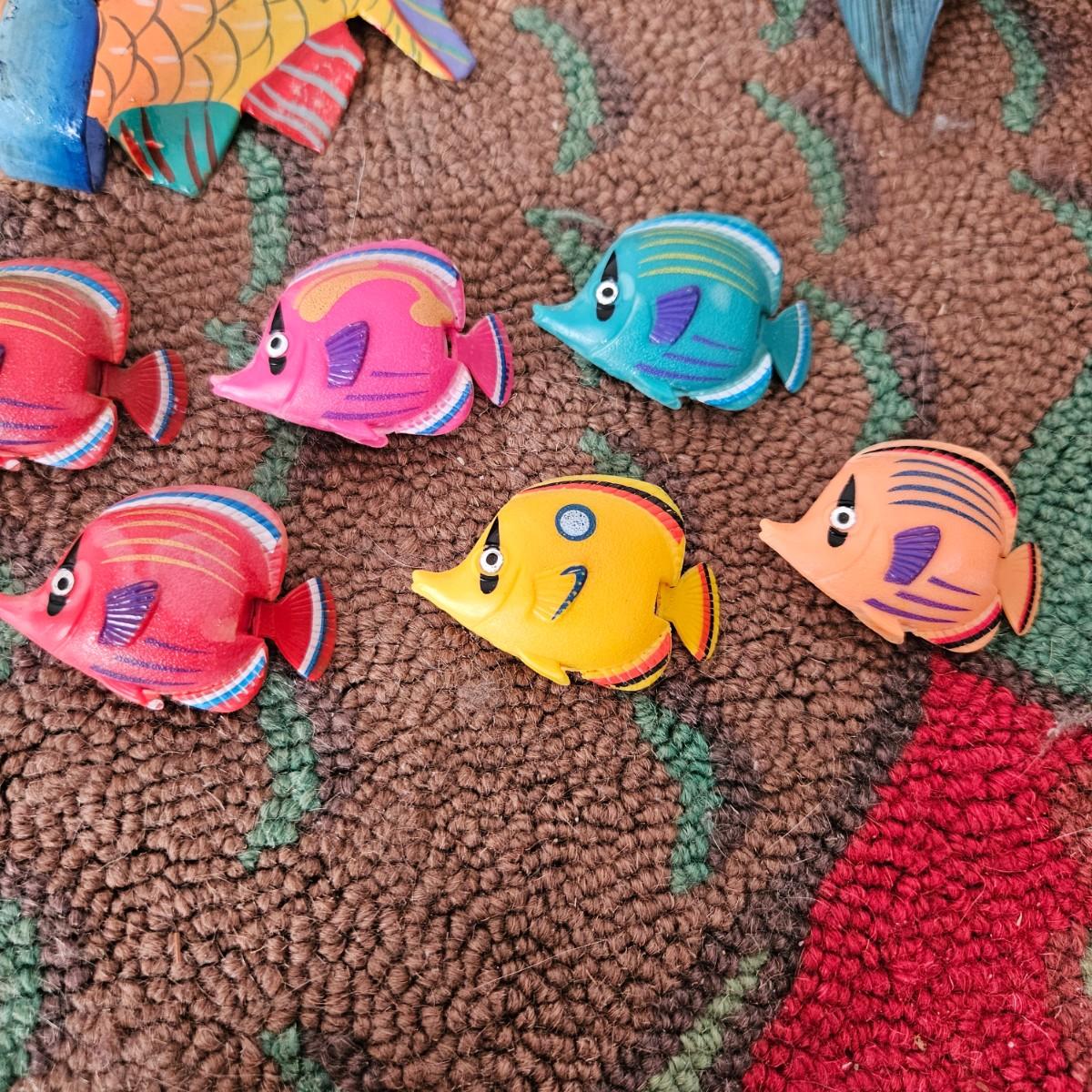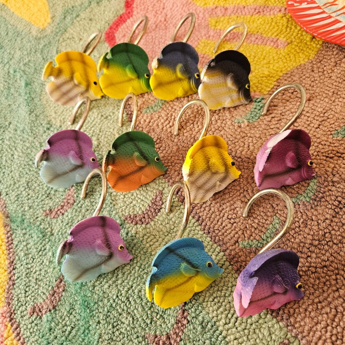 An assortment of fish decor that includes napkin rings, shower curtain hooks, a towel hanger, wall art pieces and more. See attached pictures for full inventory. Also includes a fish rug that measures approximately 53" x 37". Local pickup only