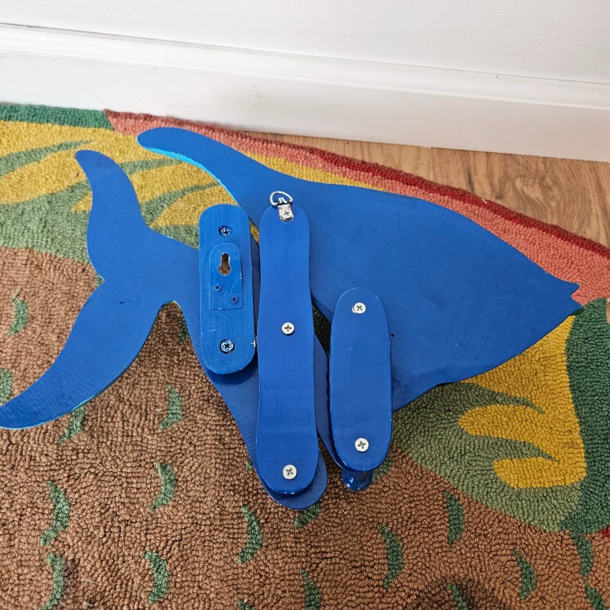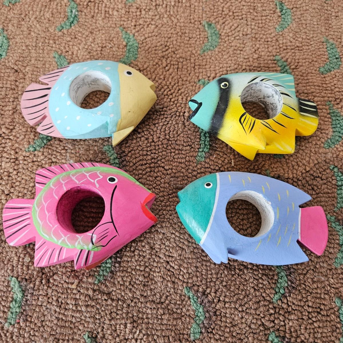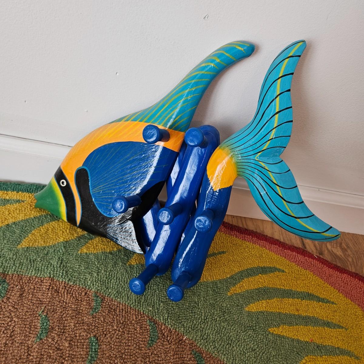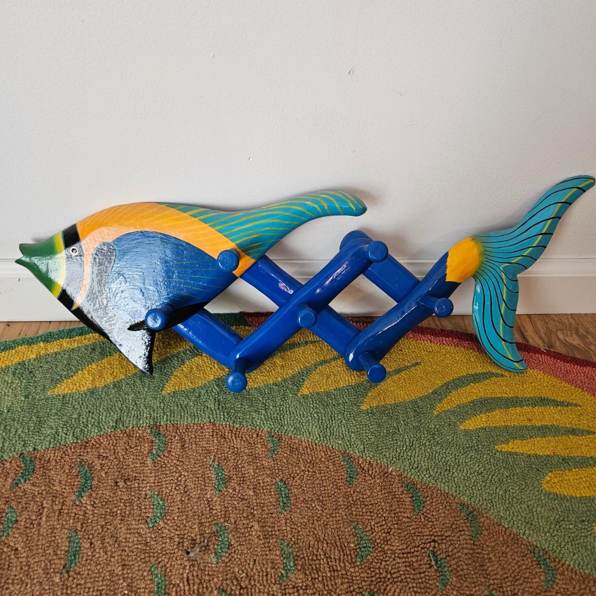 An assortment of fish decor that includes napkin rings, shower curtain hooks, a towel hanger, wall art pieces and more. See attached pictures for full inventory. Also includes a fish rug that measures approximately 53" x 37". Local pickup only