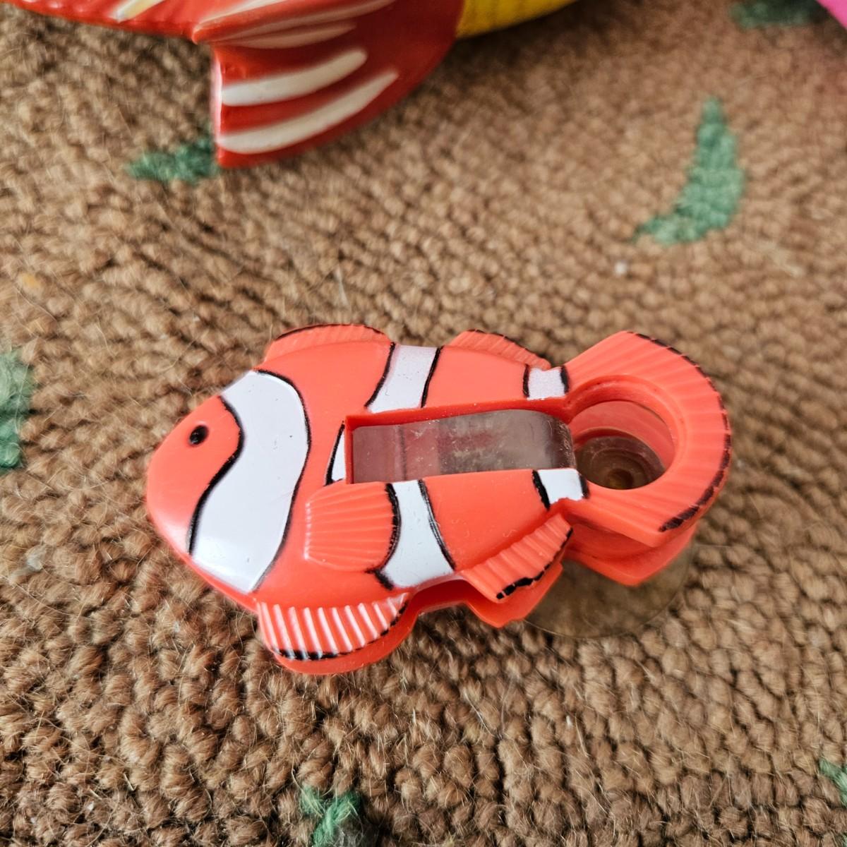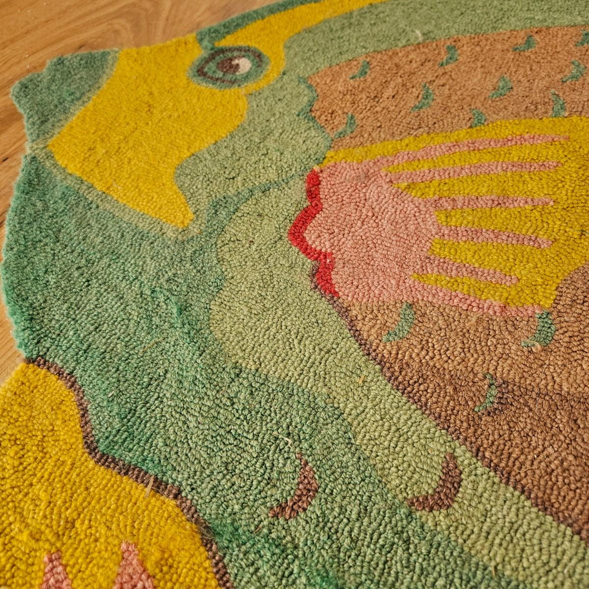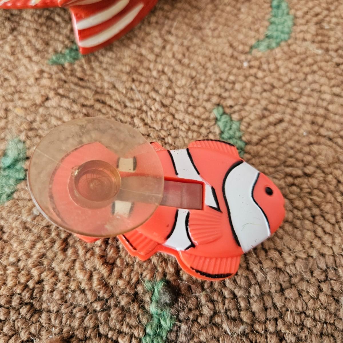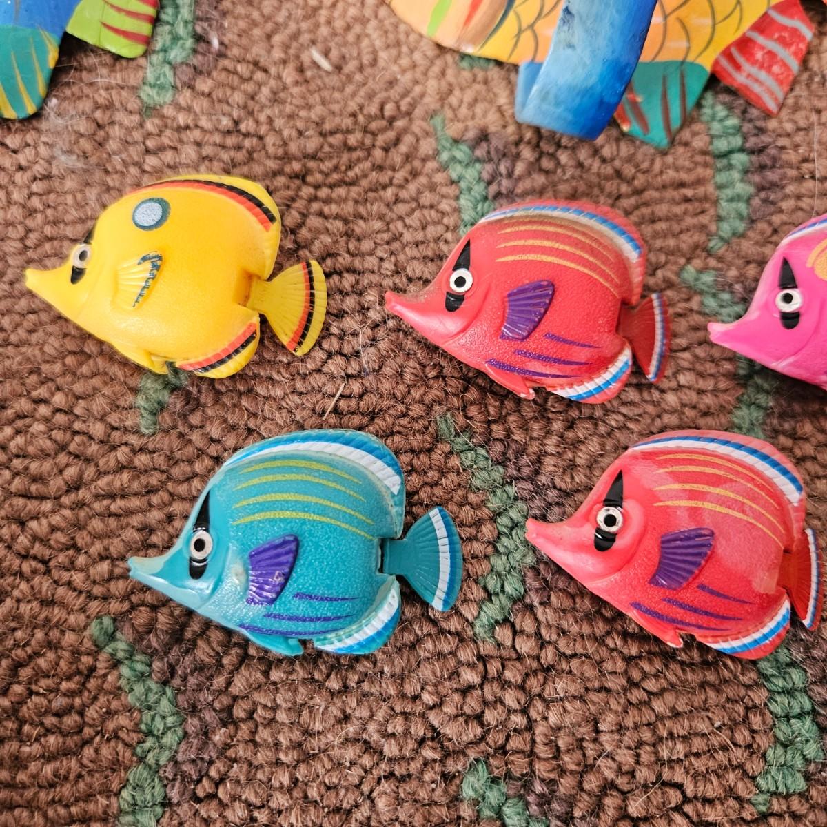 An assortment of fish decor that includes napkin rings, shower curtain hooks, a towel hanger, wall art pieces and more. See attached pictures for full inventory. Also includes a fish rug that measures approximately 53" x 37". Local pickup only
