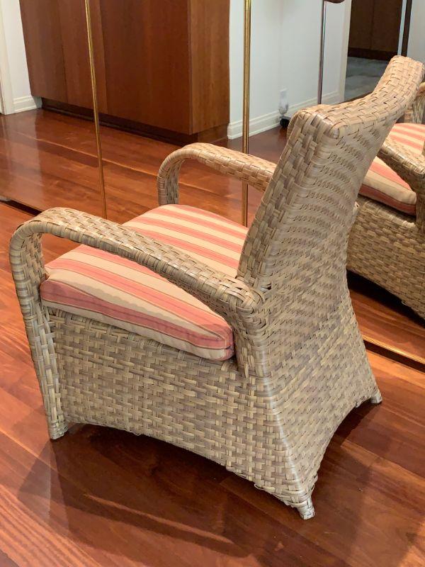 Woven wicker club chair with upholstered seat cushion. Vintage design. Indoor or outdoors.