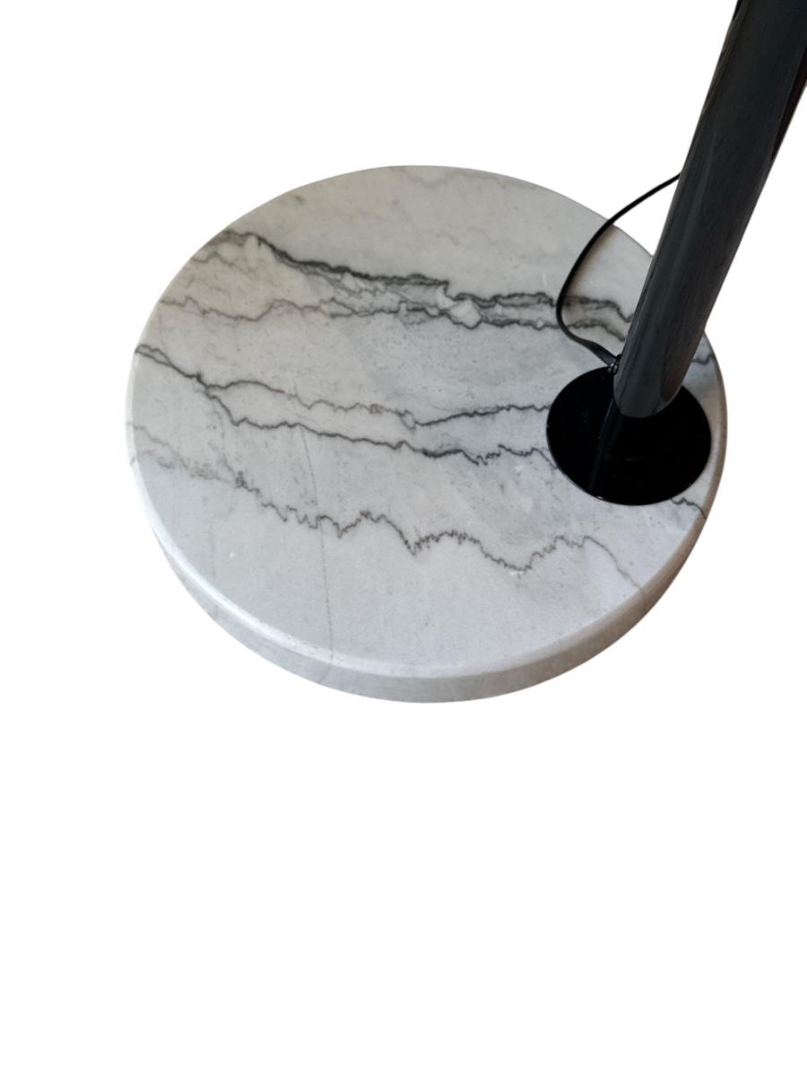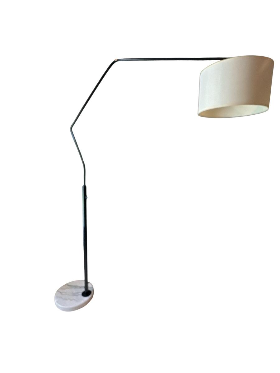 Modern arc floor lamp with a sculptural black metal frame, an off-white asymmetrical fabric drum shade, and a solid round marble base. The slender angled arm provides extended overhead lighting—ideal for reading corners or contemporary seating areas. The elegant marble base adds stability and a touch of luxury. A sleek and stylish lighting solution for modern interiors.