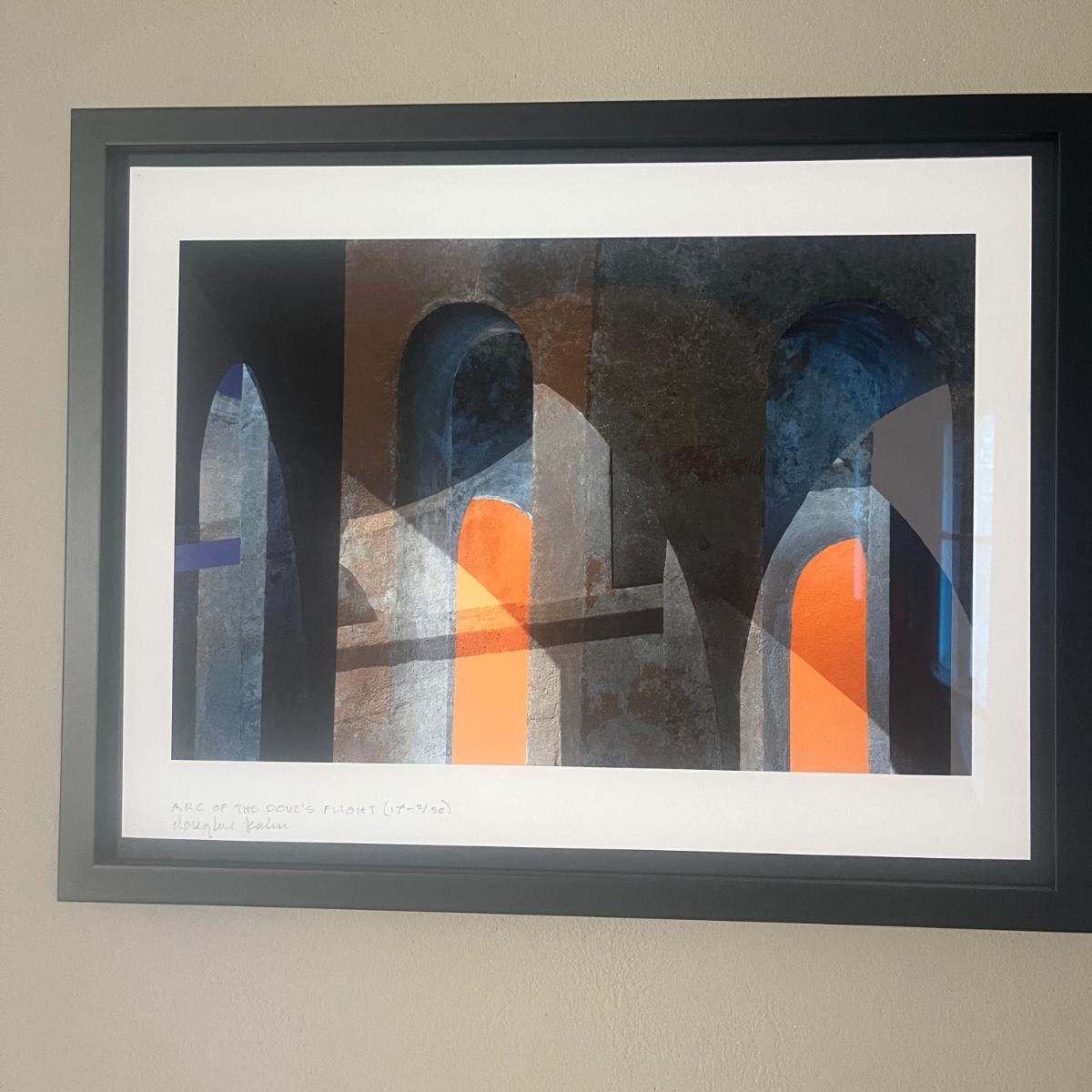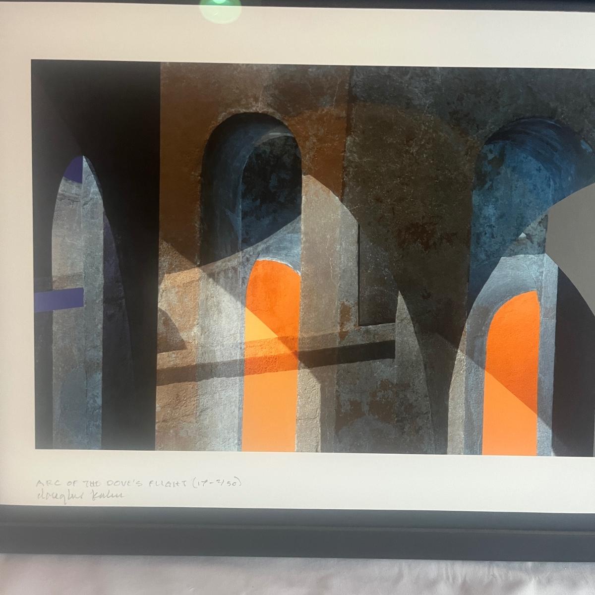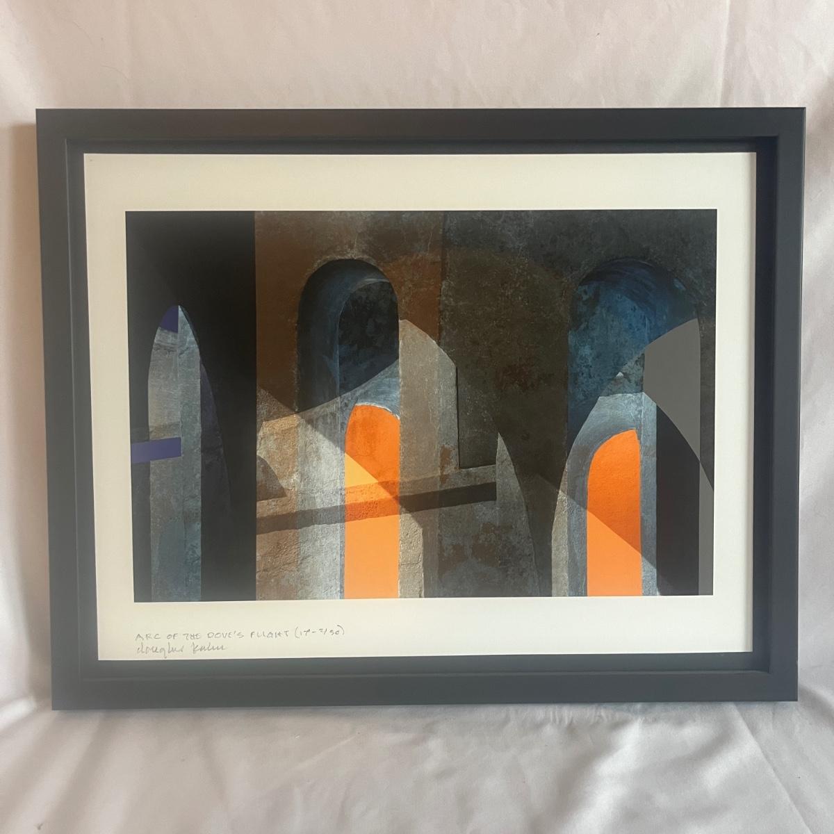This print is titled “Arc of the Dove Flight” by artist Douglas Kuhn. It is in a wooden frame and under UV protective art glass. Frame measures 19” x 15”H.