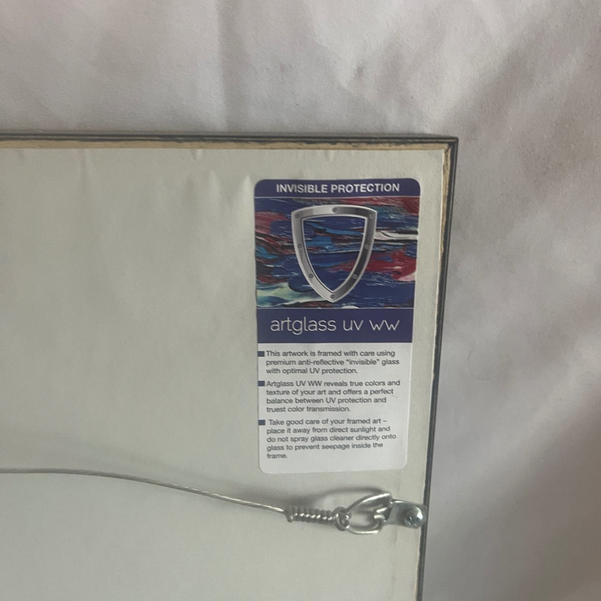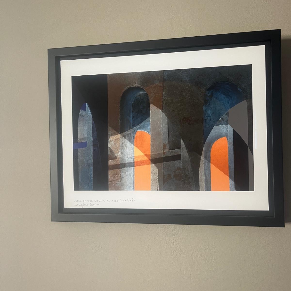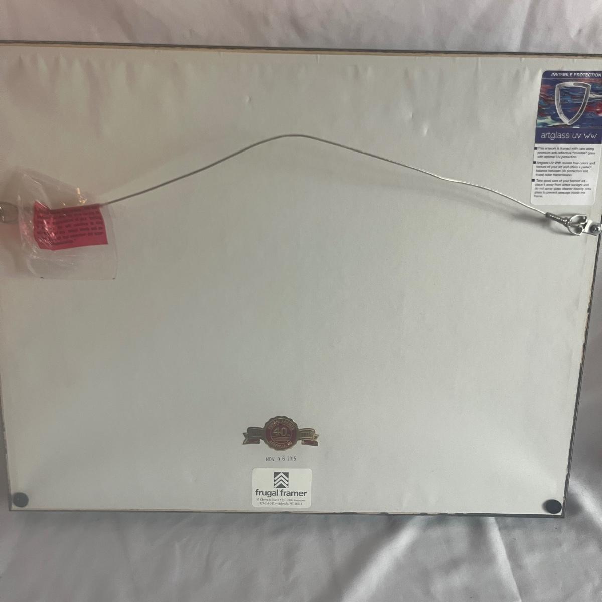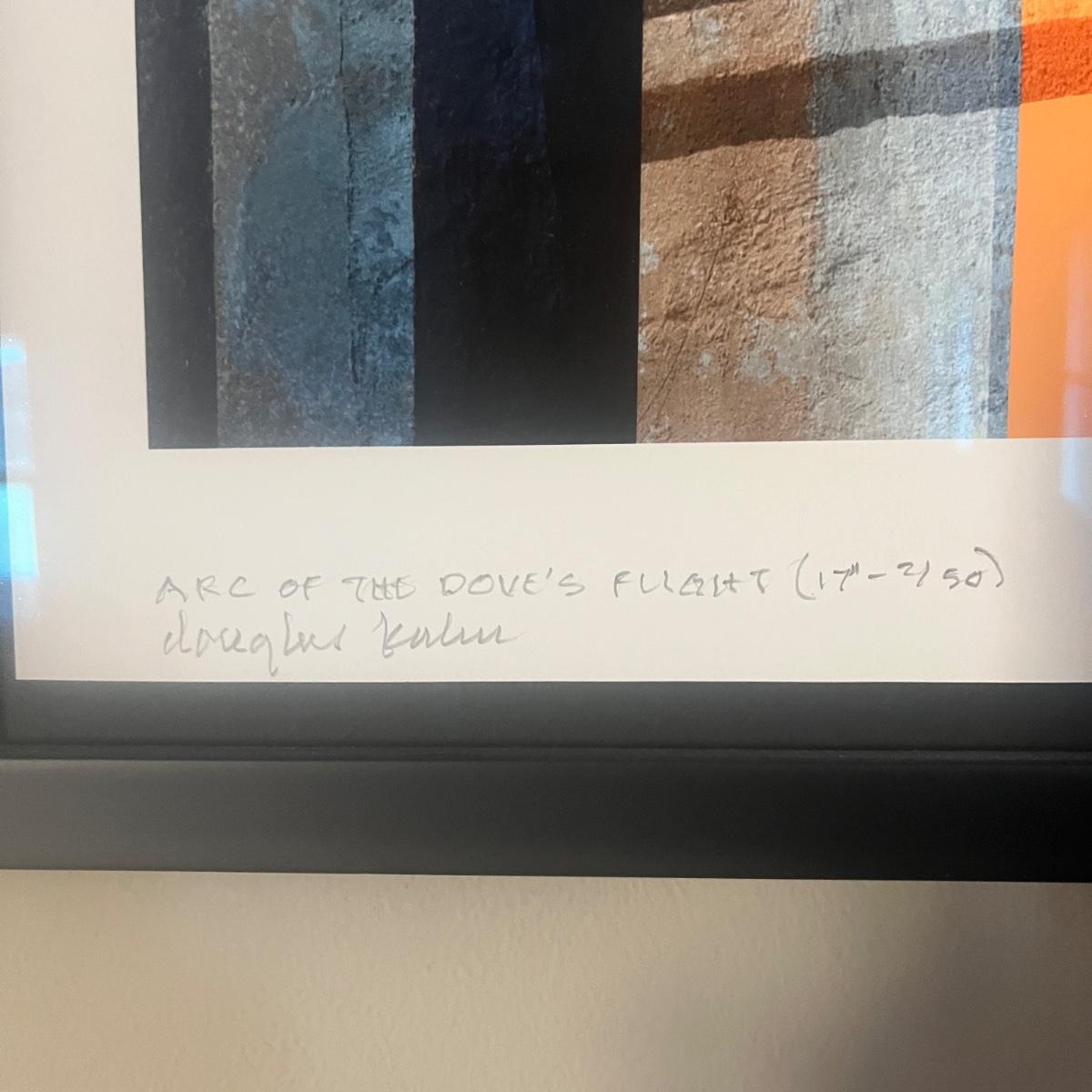 This print is titled “Arc of the Dove Flight” by artist Douglas Kuhn. It is in a wooden frame and under UV protective art glass. Frame measures 19” x 15”H.