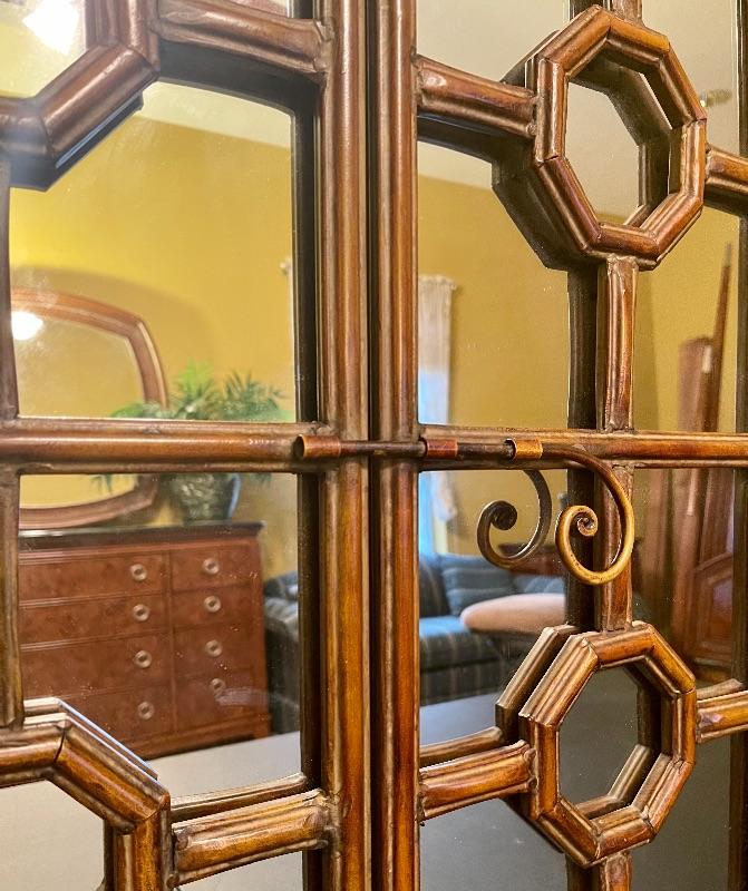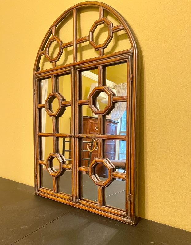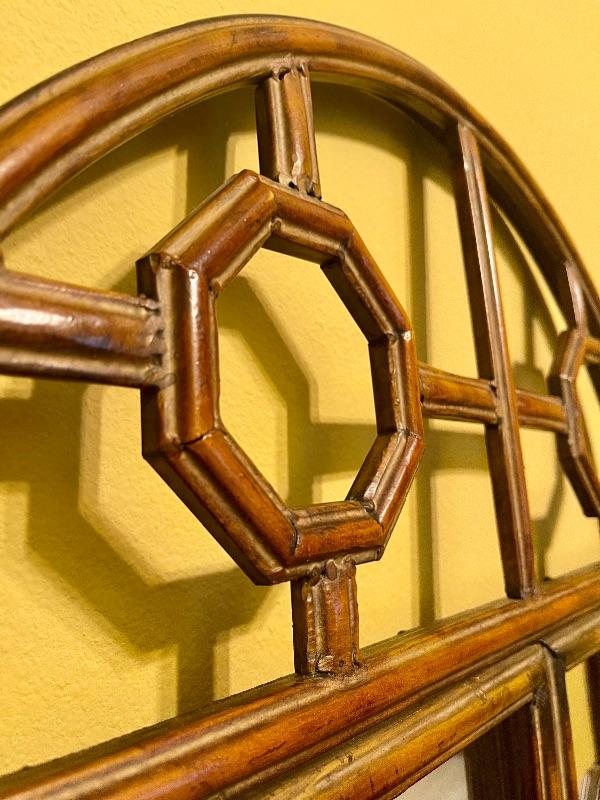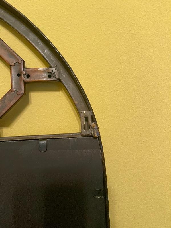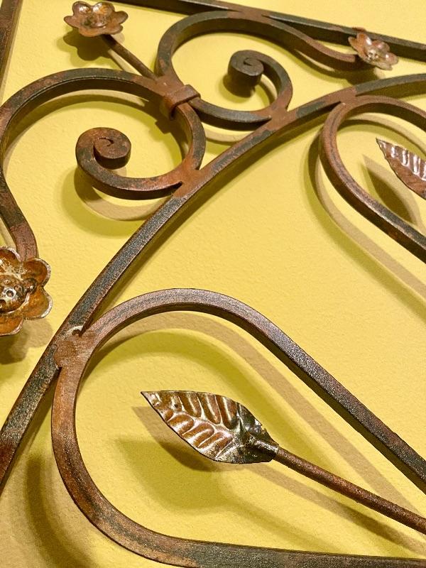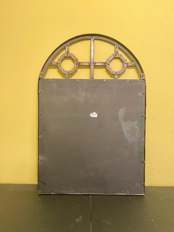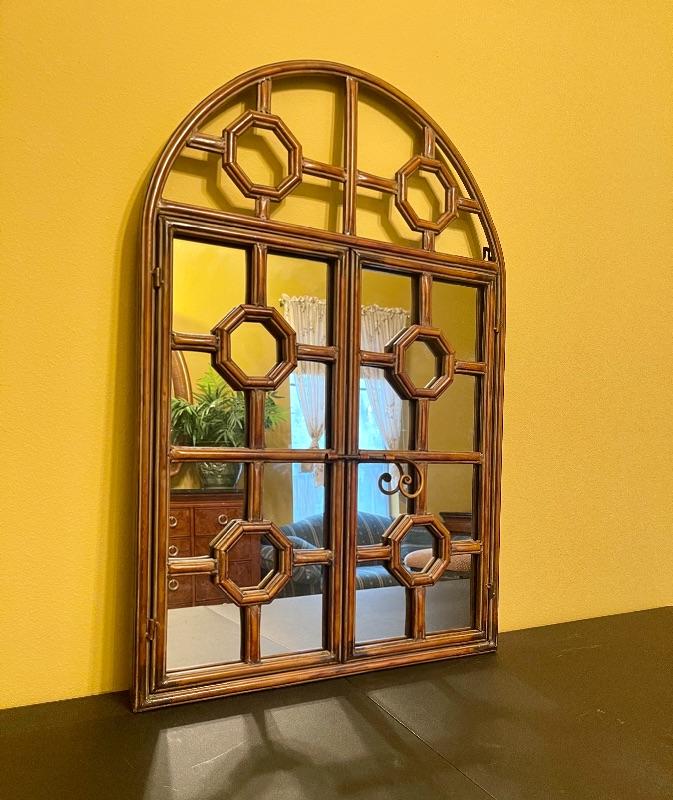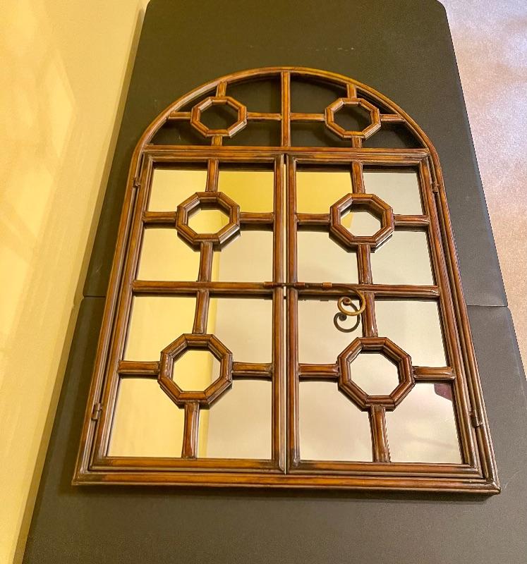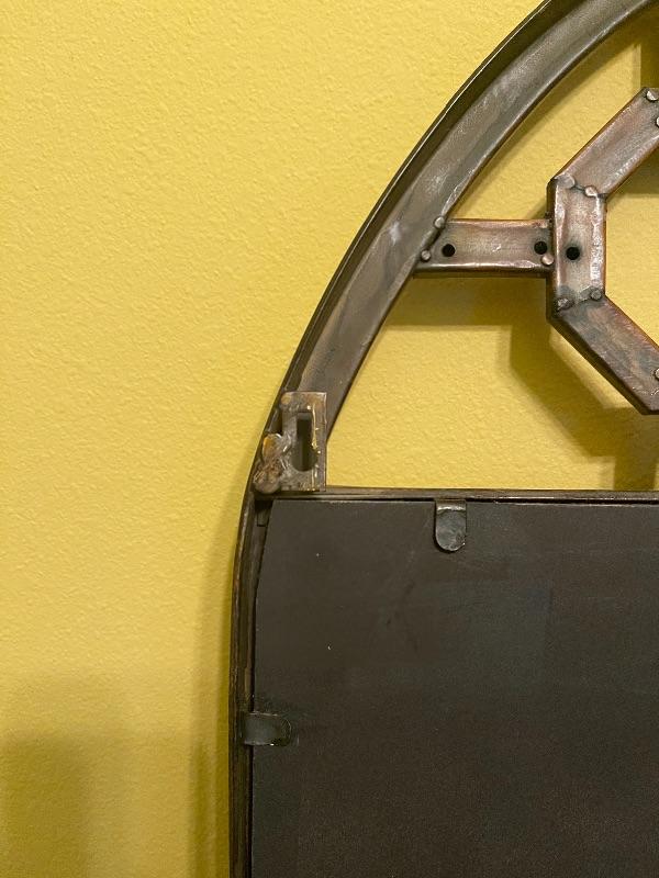 Stunning! Heavy Metal with dark wood (rattan) overlay make this suitable for many decor styles. Curved faux latch, octagon shapes, and airy arched top.