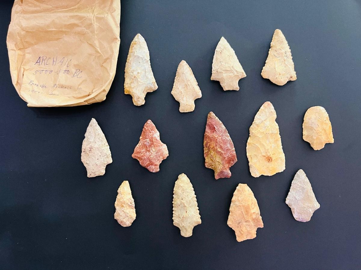 Coming from a world traveler, is this lot of arrowheads. These are specifically in a bag marked, ARCHAIC 5000-50 BC Probable Archaic in inner bay, see handwritten note. Although we have no way of verifying that, it's completely likely! 13 total arrowheads.
