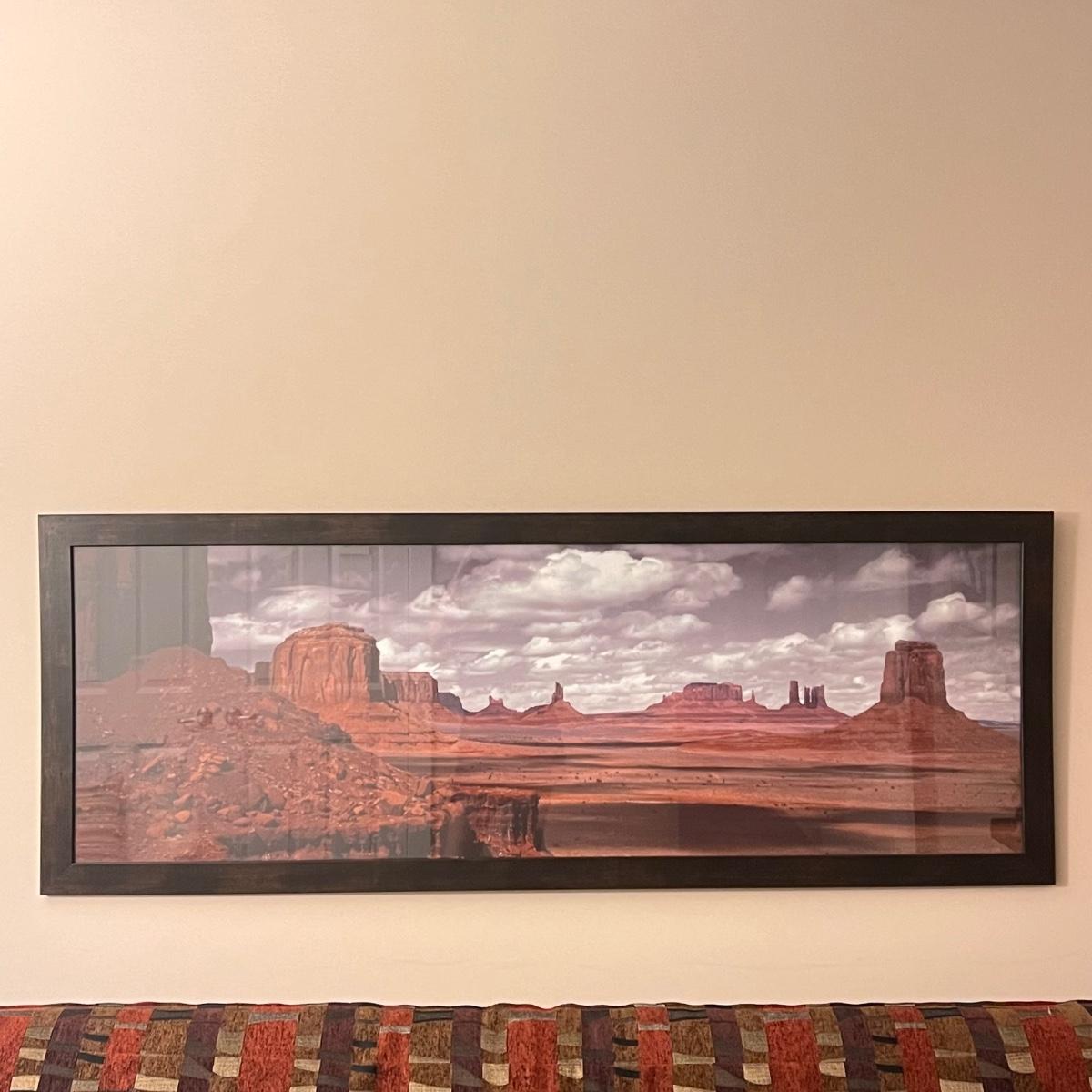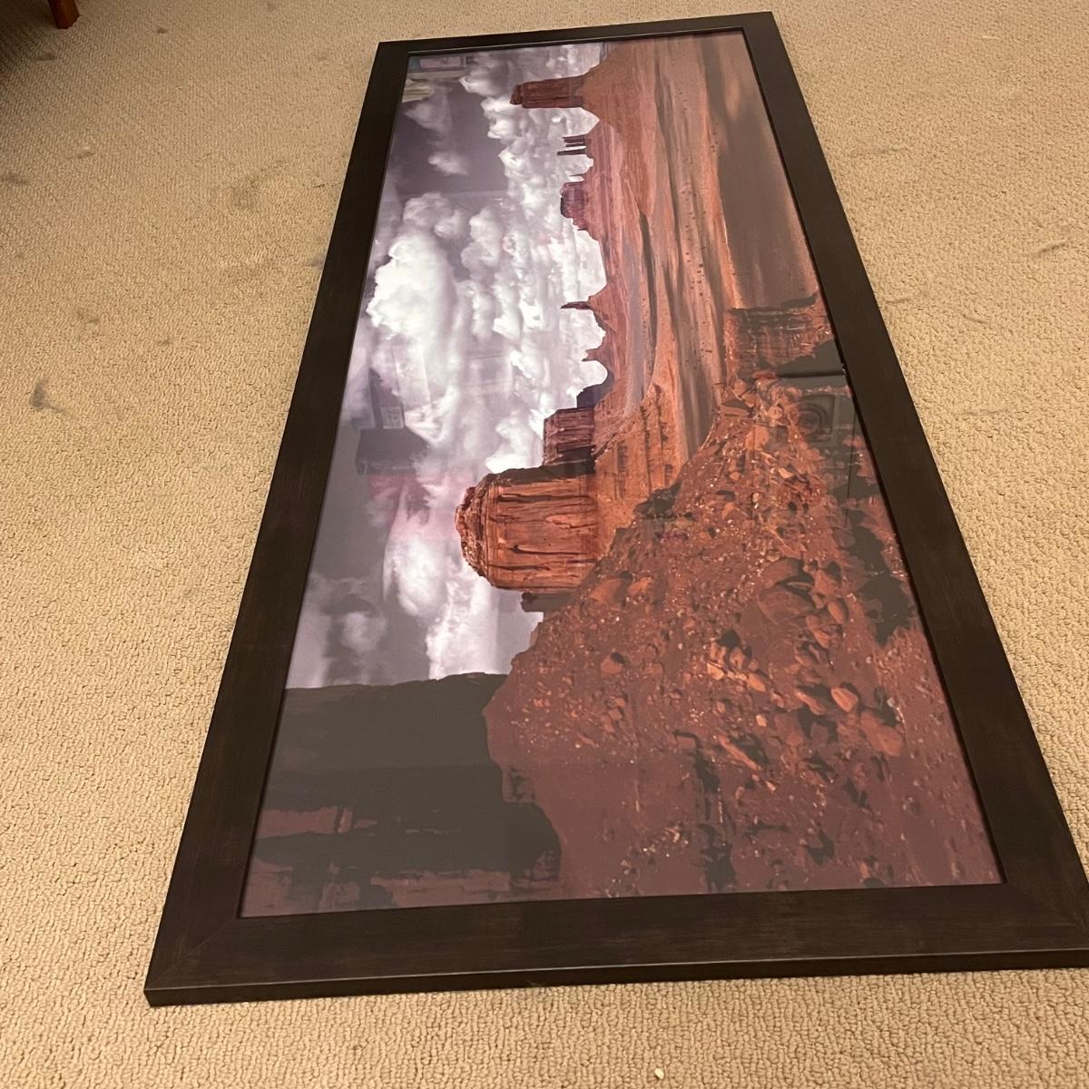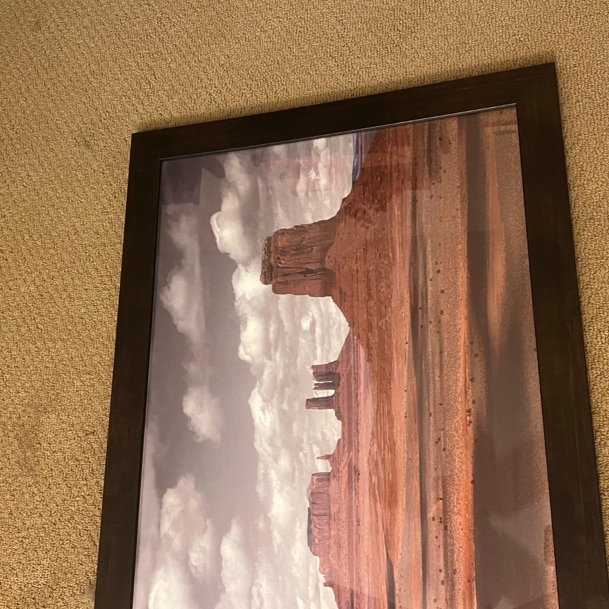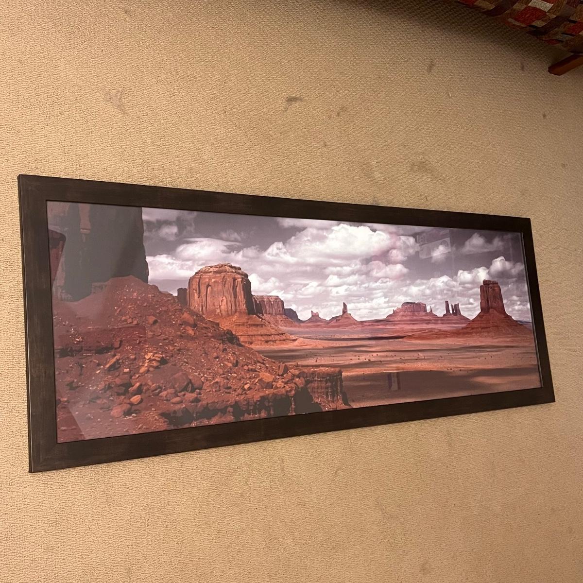 Lot includes one large framed print of the Monument Valley in Arizona. It measures 65” x 24”H in wood frame with either glass or plexiglass. Shipping available. Shipping can be costly. We suggest contacting our preferred local shipping provider, Postage Express, with dimensions and getting an estimate before bidding: (828) 255-9250 or shipping@postageexpressnc.com.