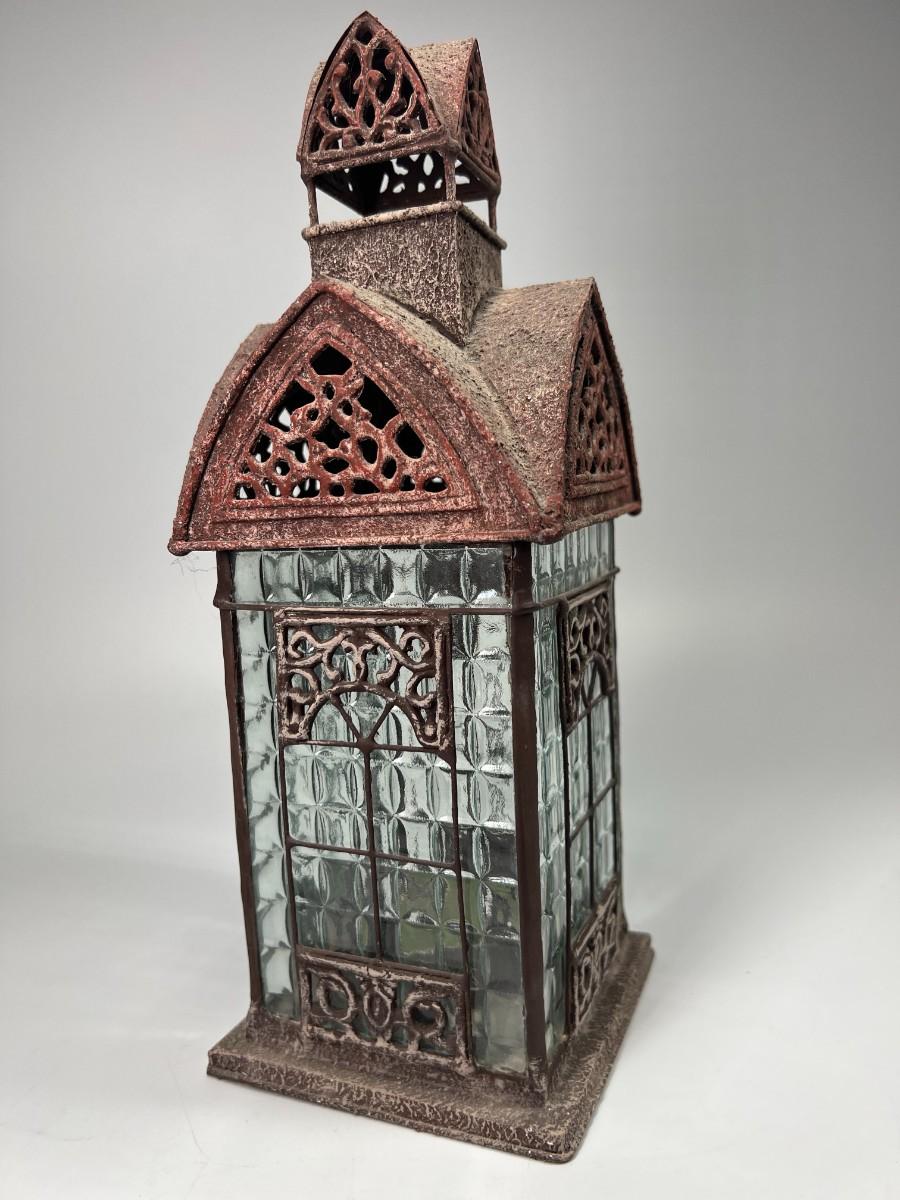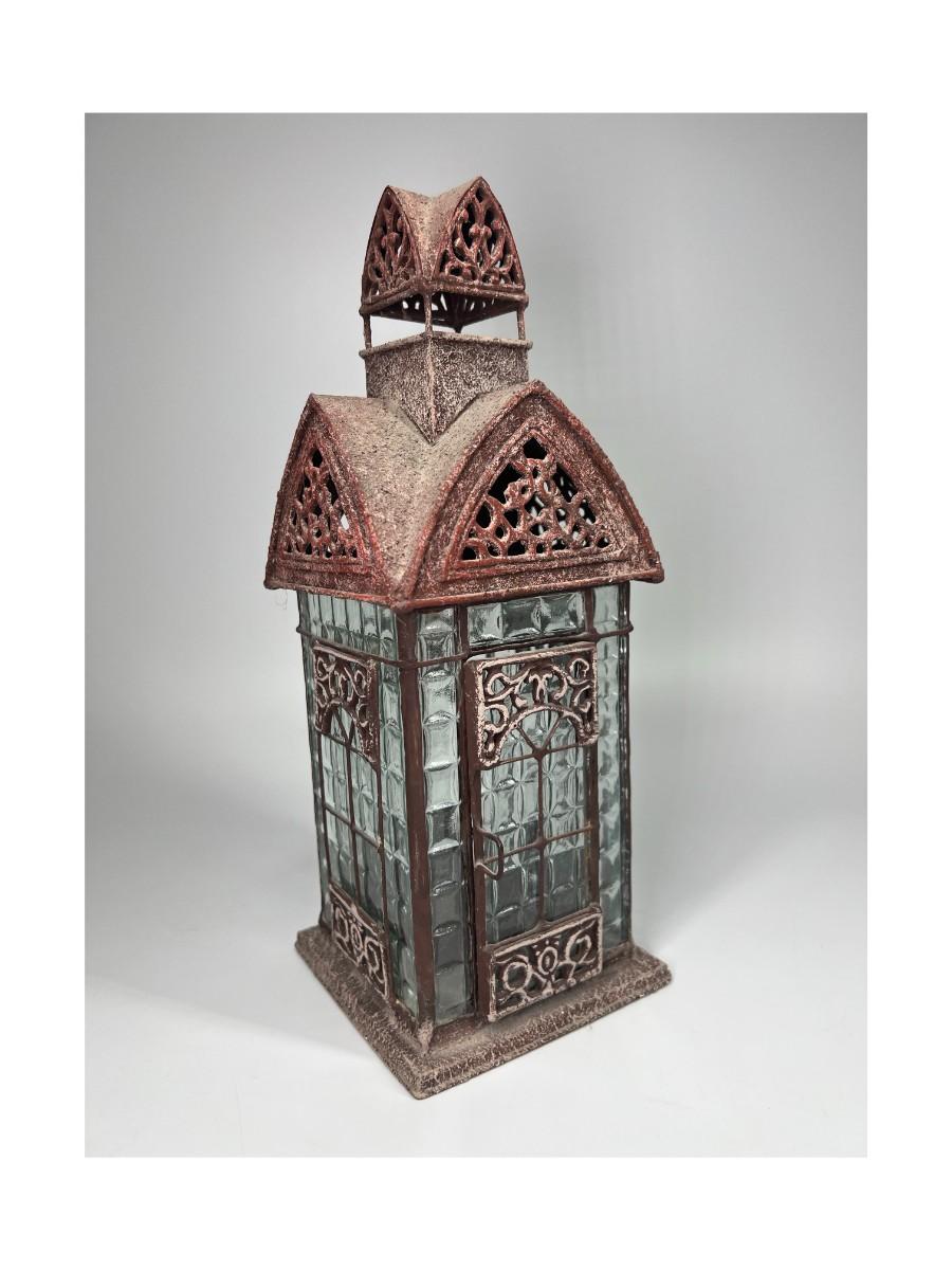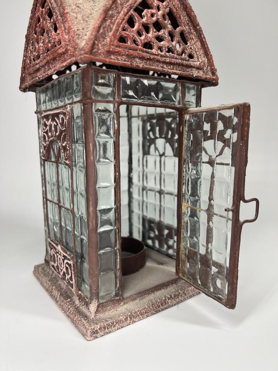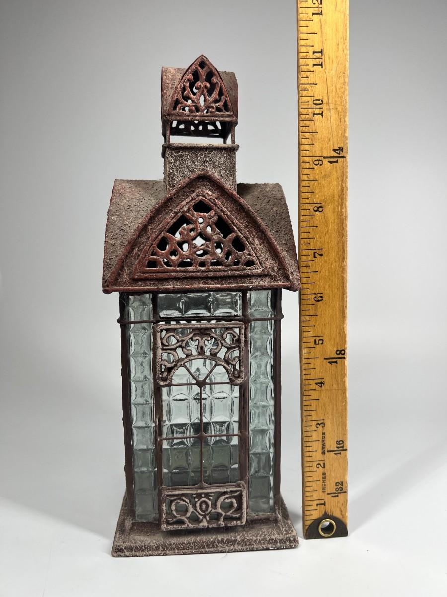 Architectural Church Cathedral Style Gazebo Red Patina & Glass Tealight Candle Holder, there is no significant damage to the metal or glass and is in good displayable condition. Check pictures for more details and for sizing.