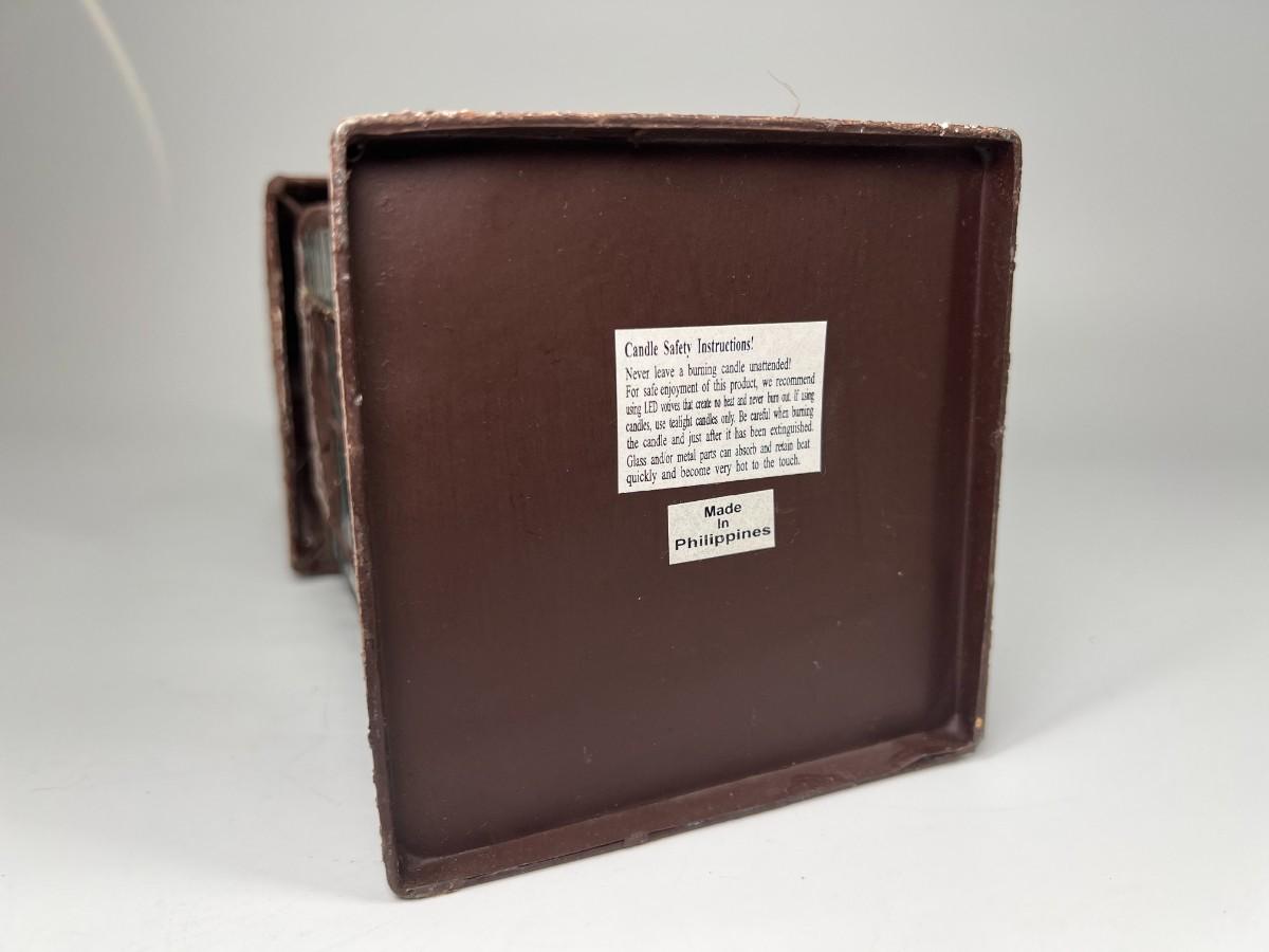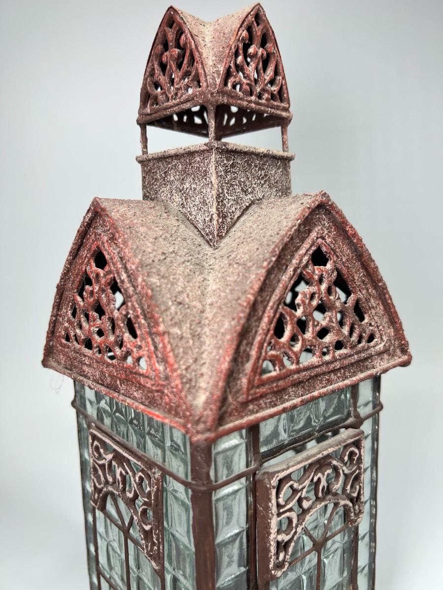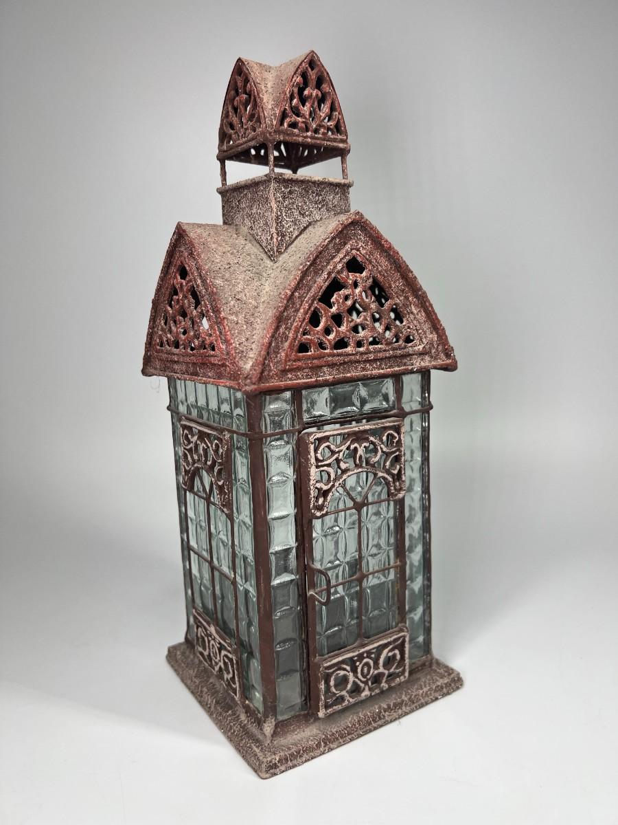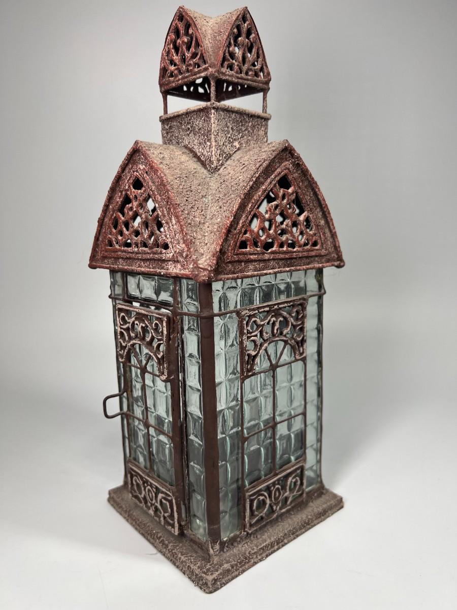 Architectural Church Cathedral Style Gazebo Red Patina & Glass Tealight Candle Holder, there is no significant damage to the metal or glass and is in good displayable condition. Check pictures for more details and for sizing.