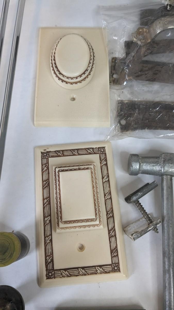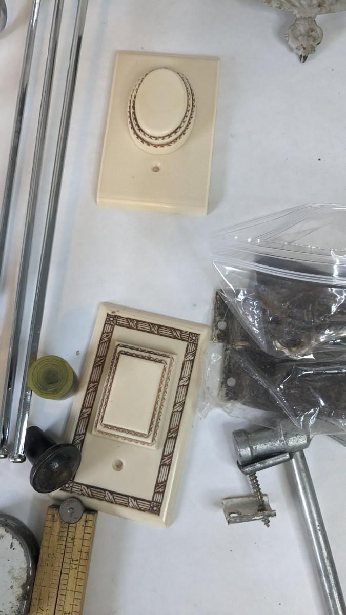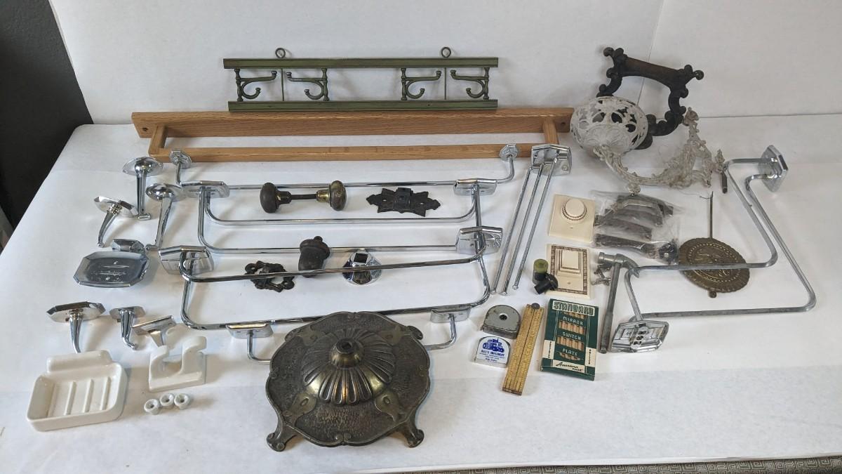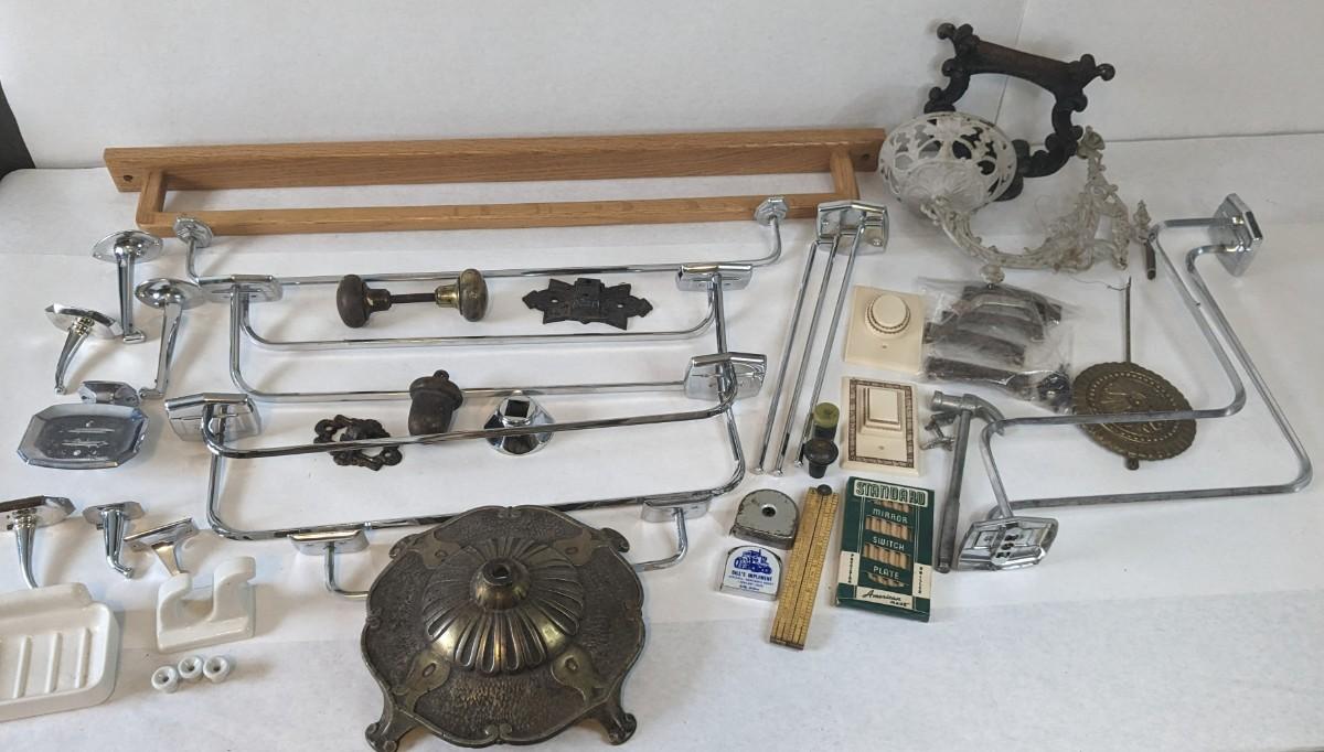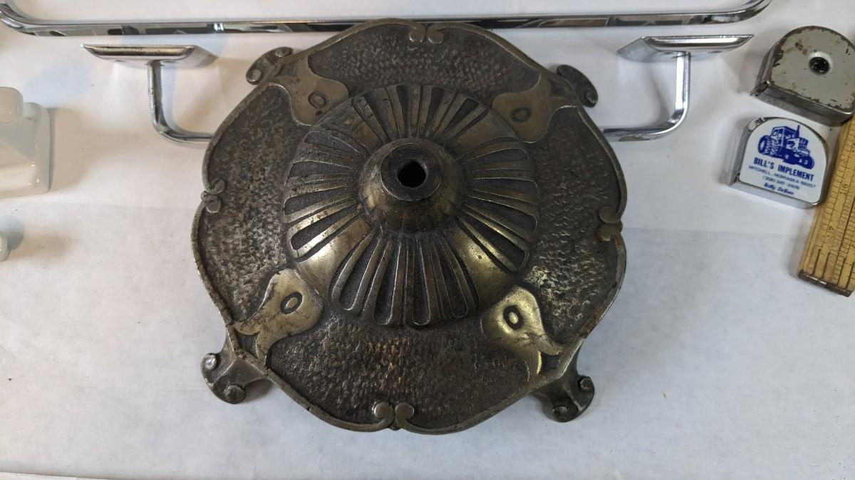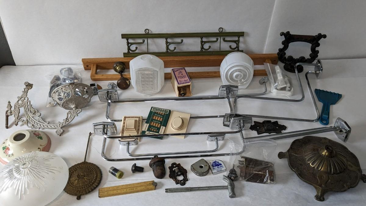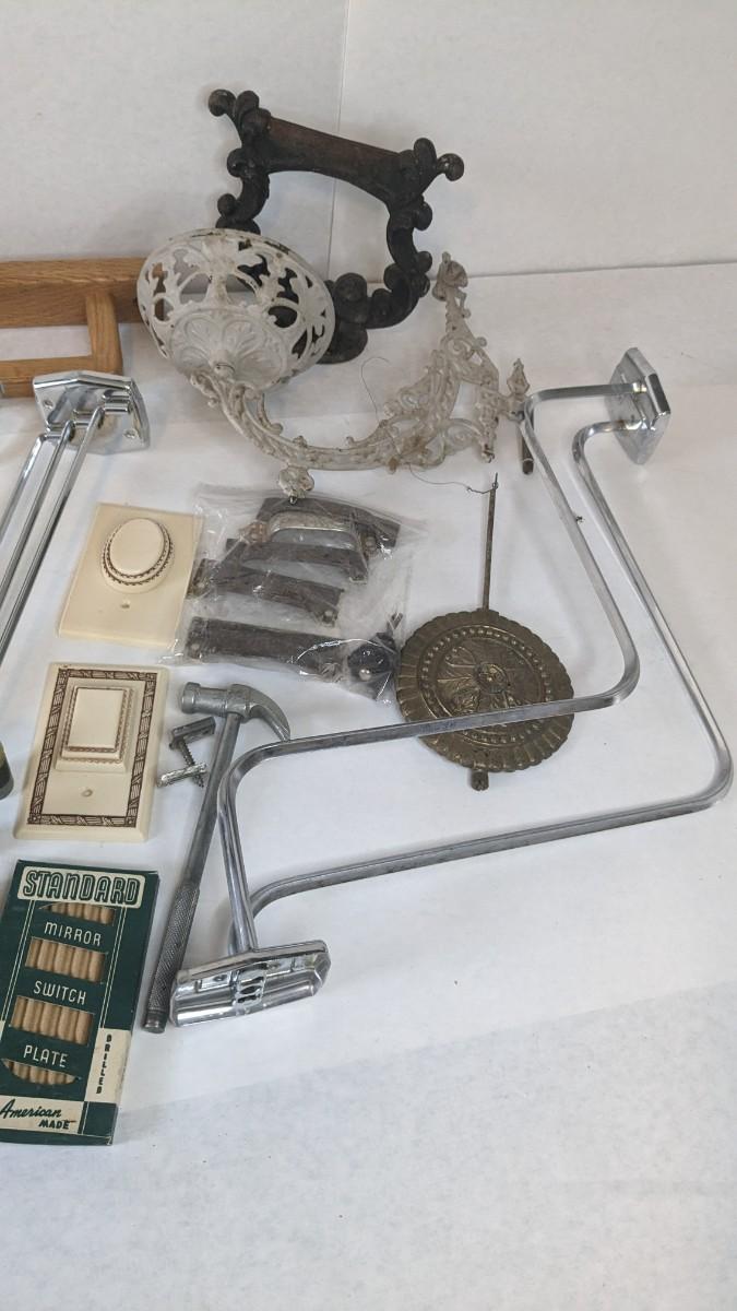 A small totes worth of salvaged pieces from cookhouse and bunk house and some other parts along the way including beautiful brass pendulum, Aerolux electric flowers light bulb, acorn weight for a clock, one snowflake pattern light cover dome, one 6" rose patterned ceiling fixture, varied switch plates, a few tools, and more! Noted in photos is a stress fracture in one of the white globes. This is a fantastic assortment full of practical use or upcycle potential