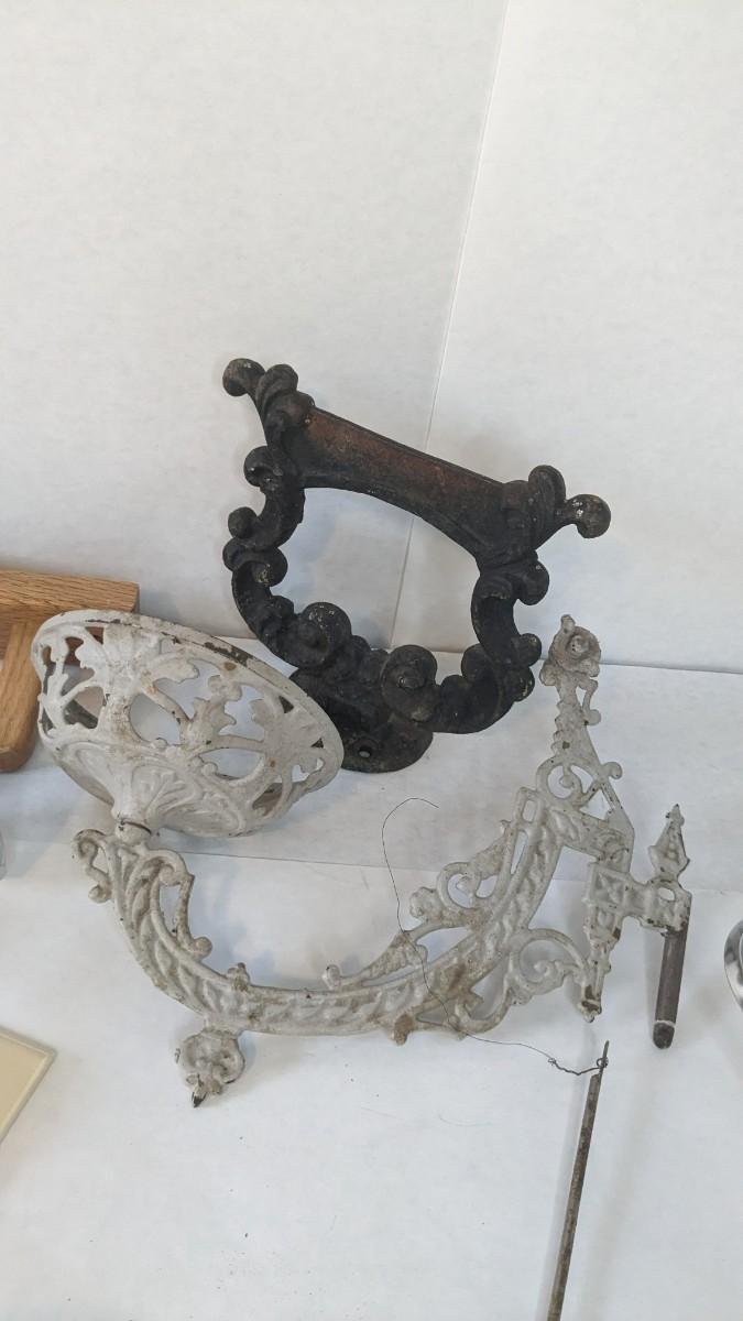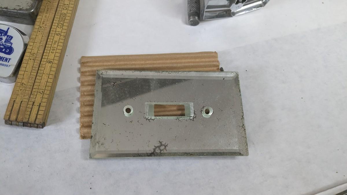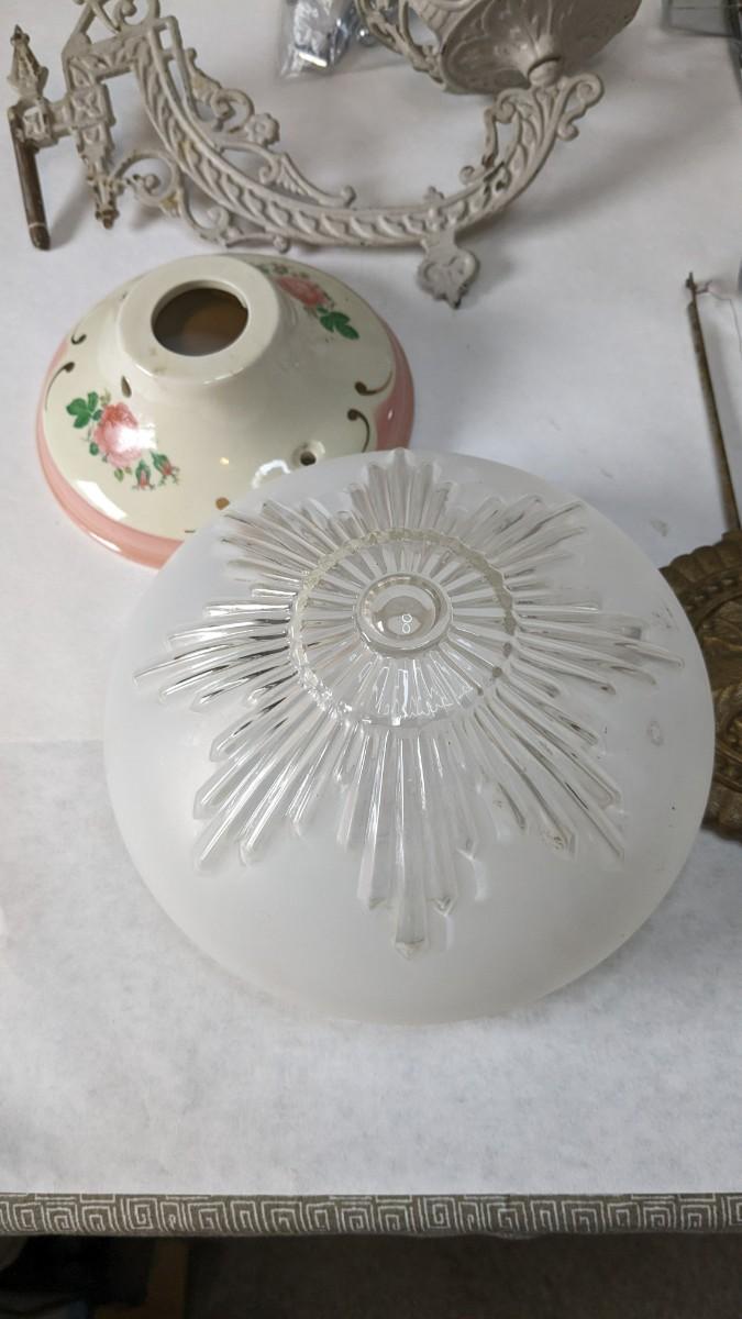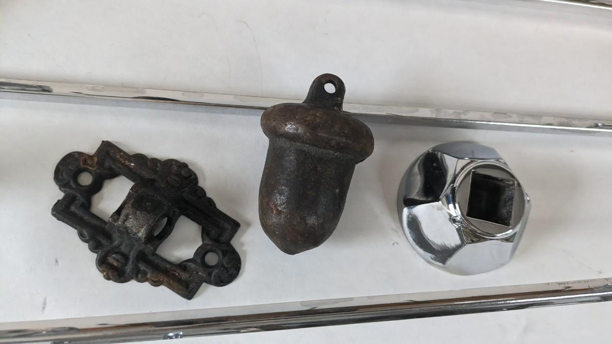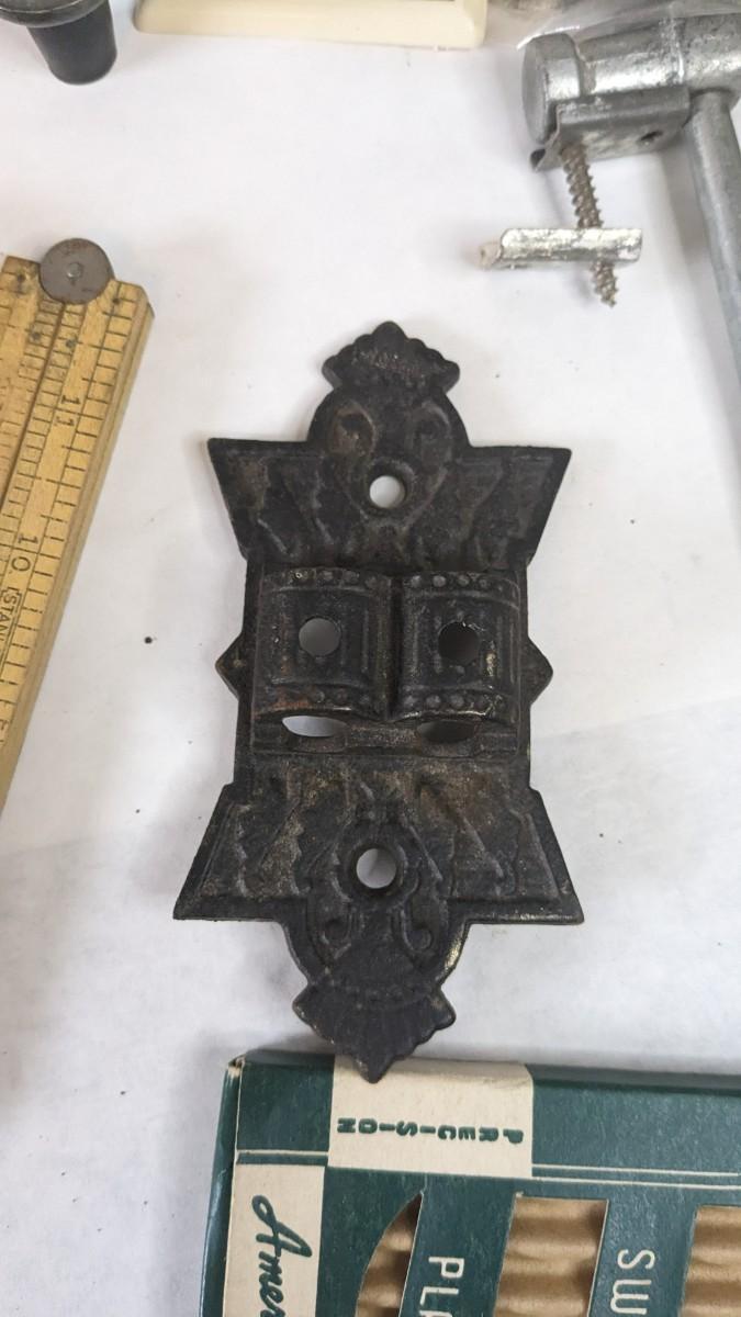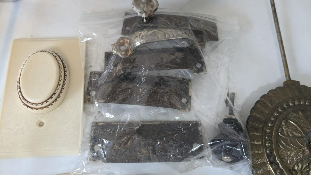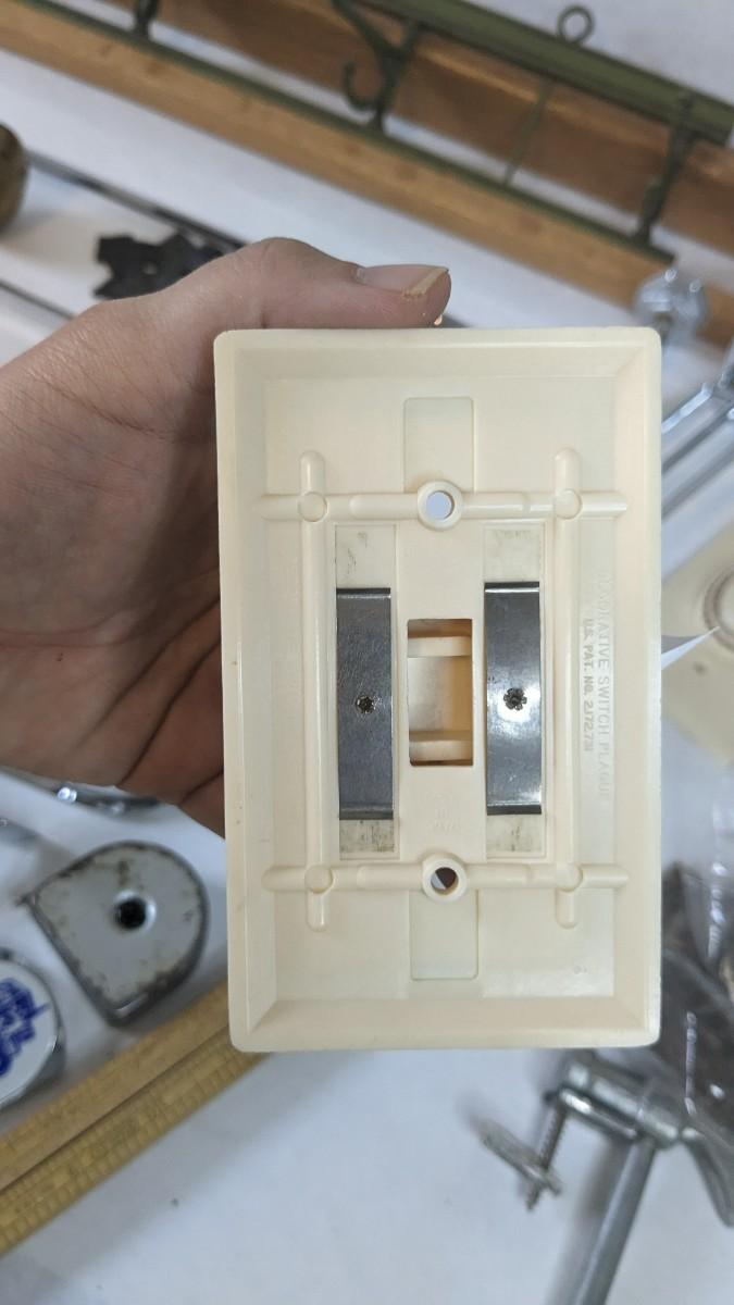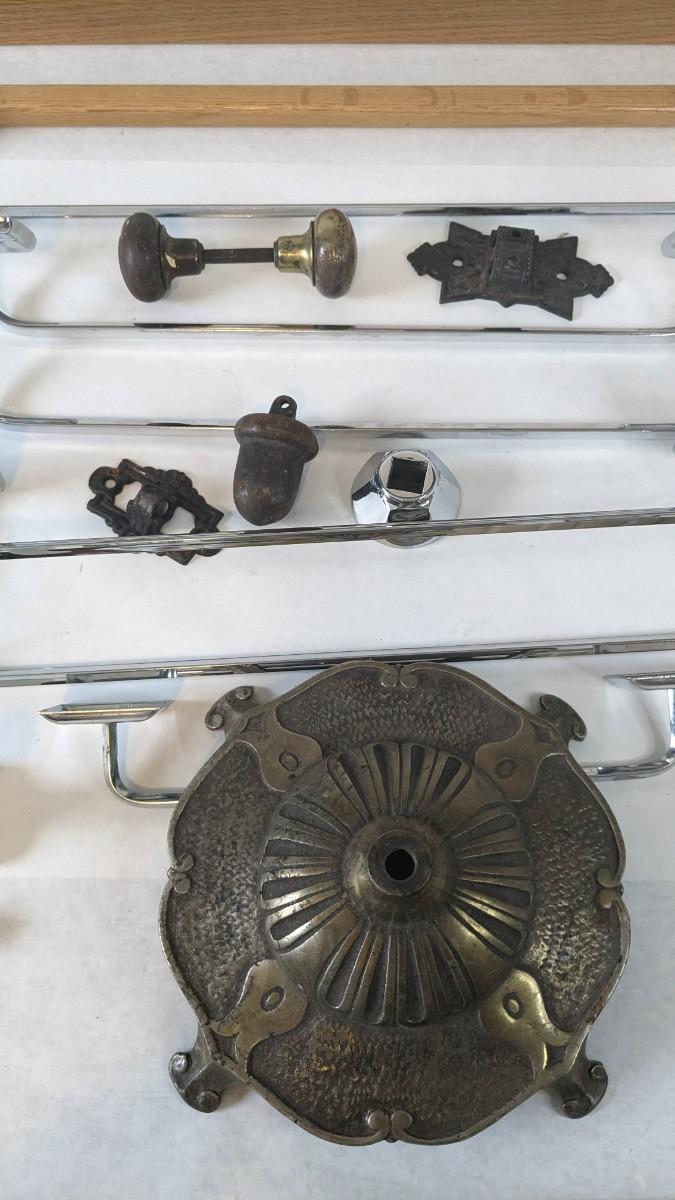 A small totes worth of salvaged pieces from cookhouse and bunk house and some other parts along the way including beautiful brass pendulum, Aerolux electric flowers light bulb, acorn weight for a clock, one snowflake pattern light cover dome, one 6" rose patterned ceiling fixture, varied switch plates, a few tools, and more! Noted in photos is a stress fracture in one of the white globes. This is a fantastic assortment full of practical use or upcycle potential