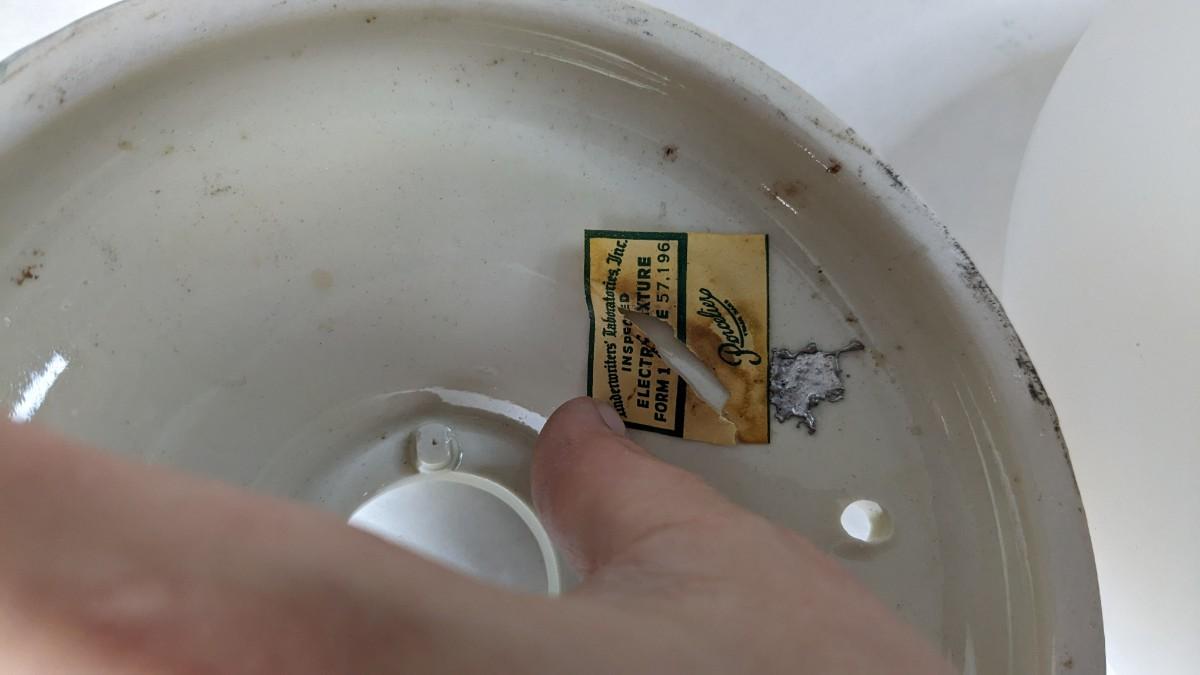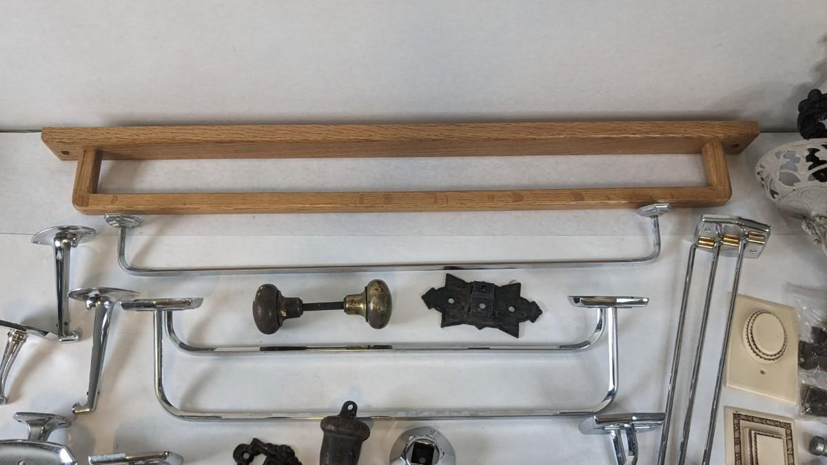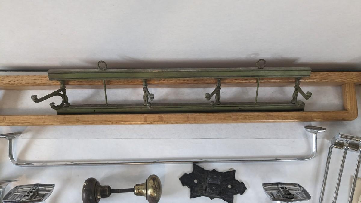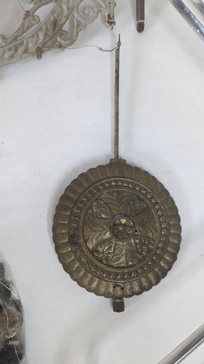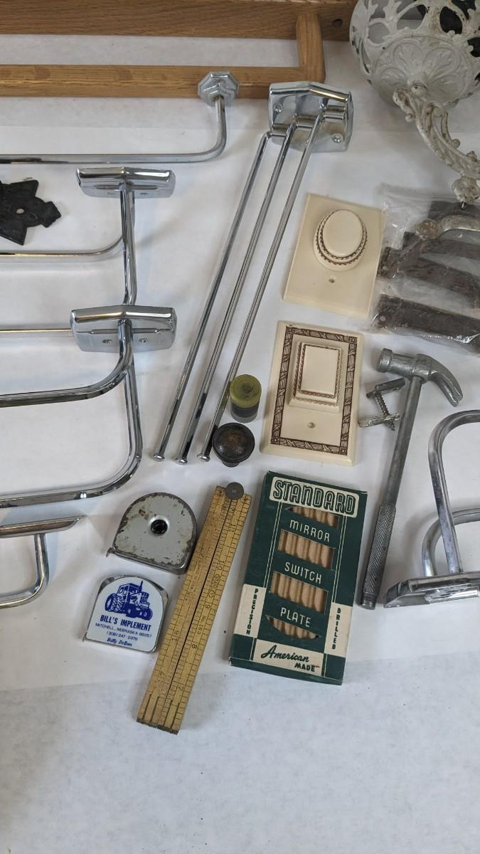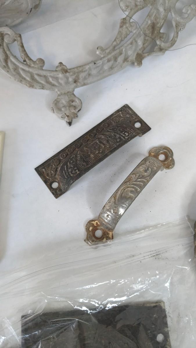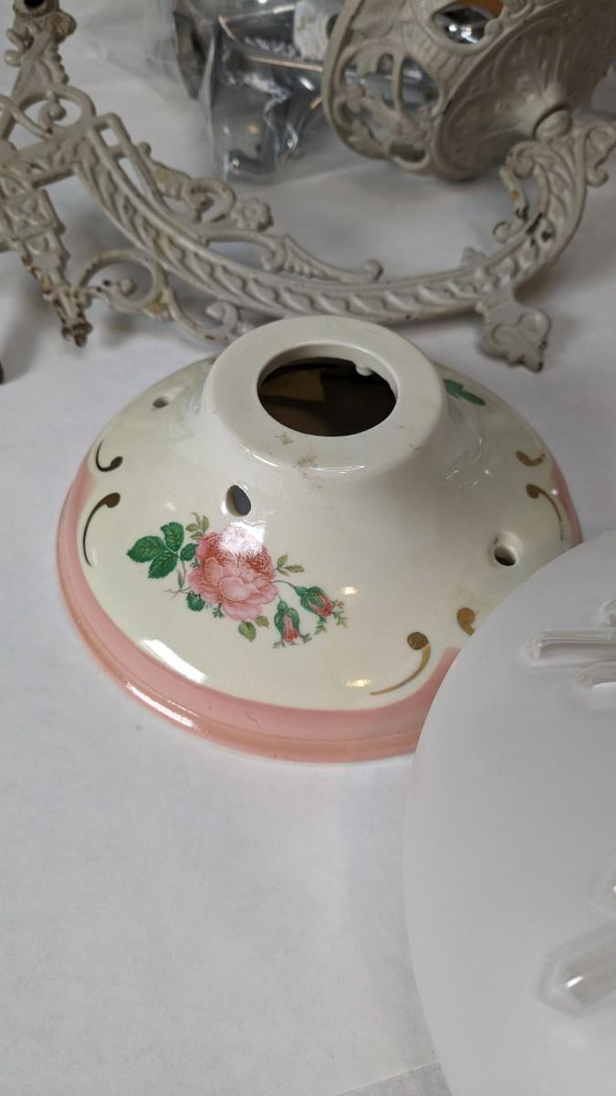 A small totes worth of salvaged pieces from cookhouse and bunk house and some other parts along the way including beautiful brass pendulum, Aerolux electric flowers light bulb, acorn weight for a clock, one snowflake pattern light cover dome, one 6" rose patterned ceiling fixture, varied switch plates, a few tools, and more! Noted in photos is a stress fracture in one of the white globes. This is a fantastic assortment full of practical use or upcycle potential
