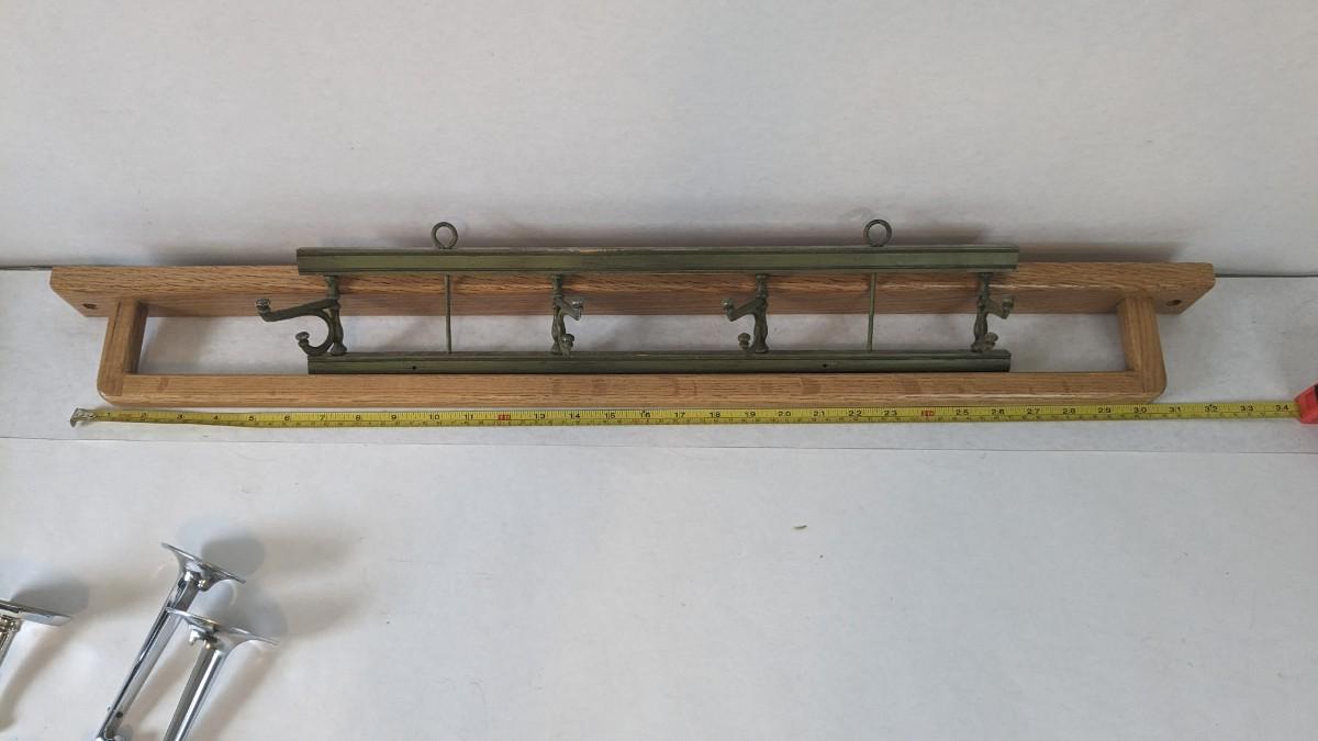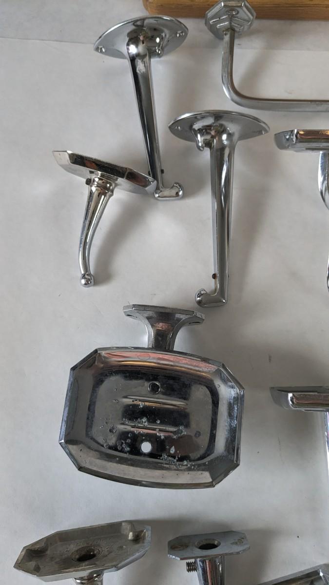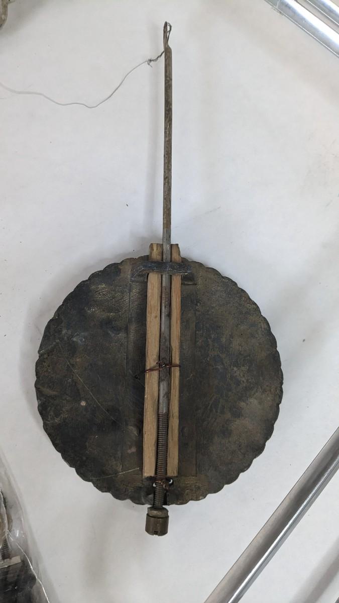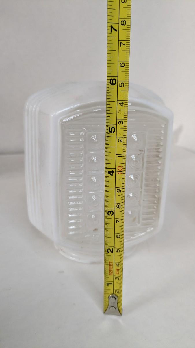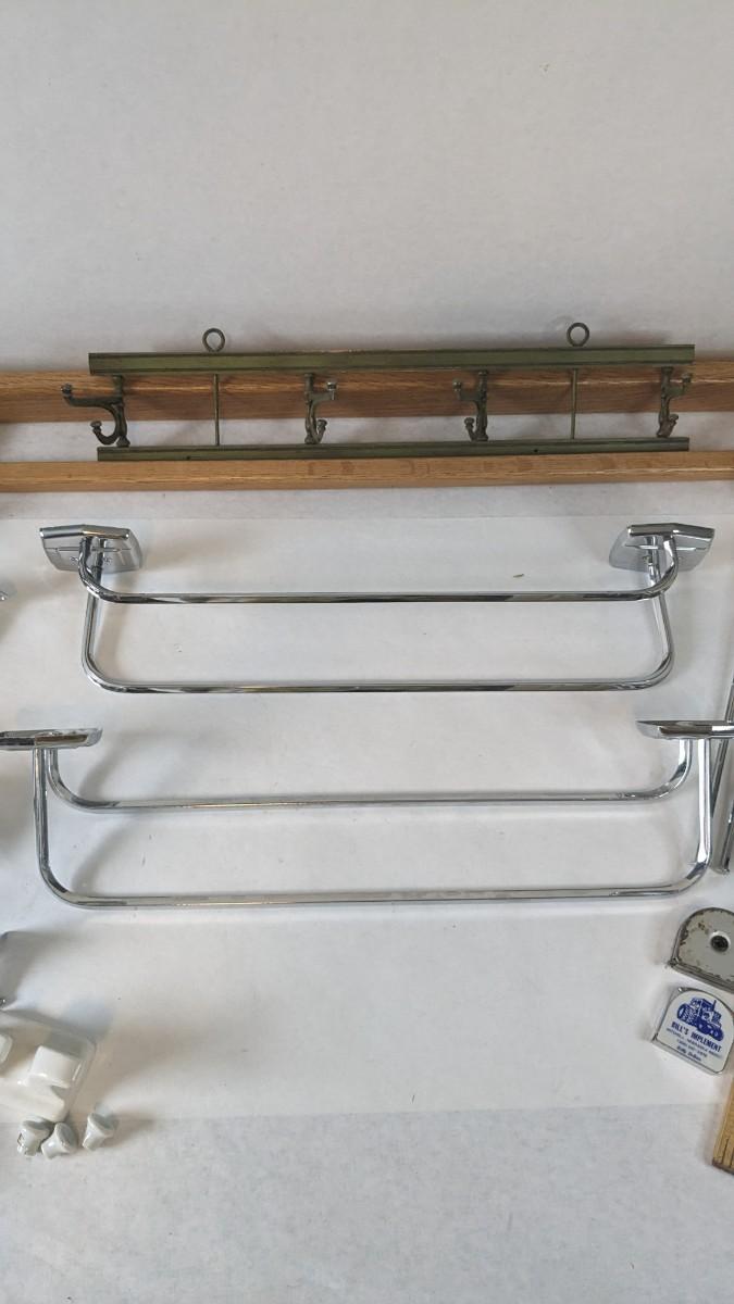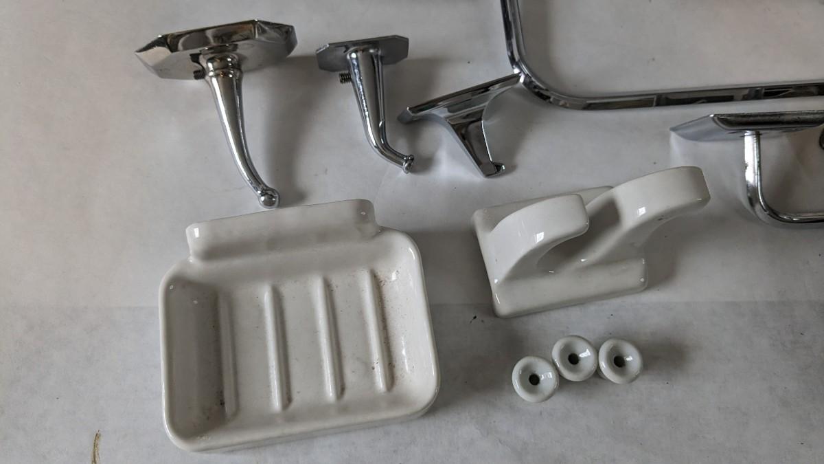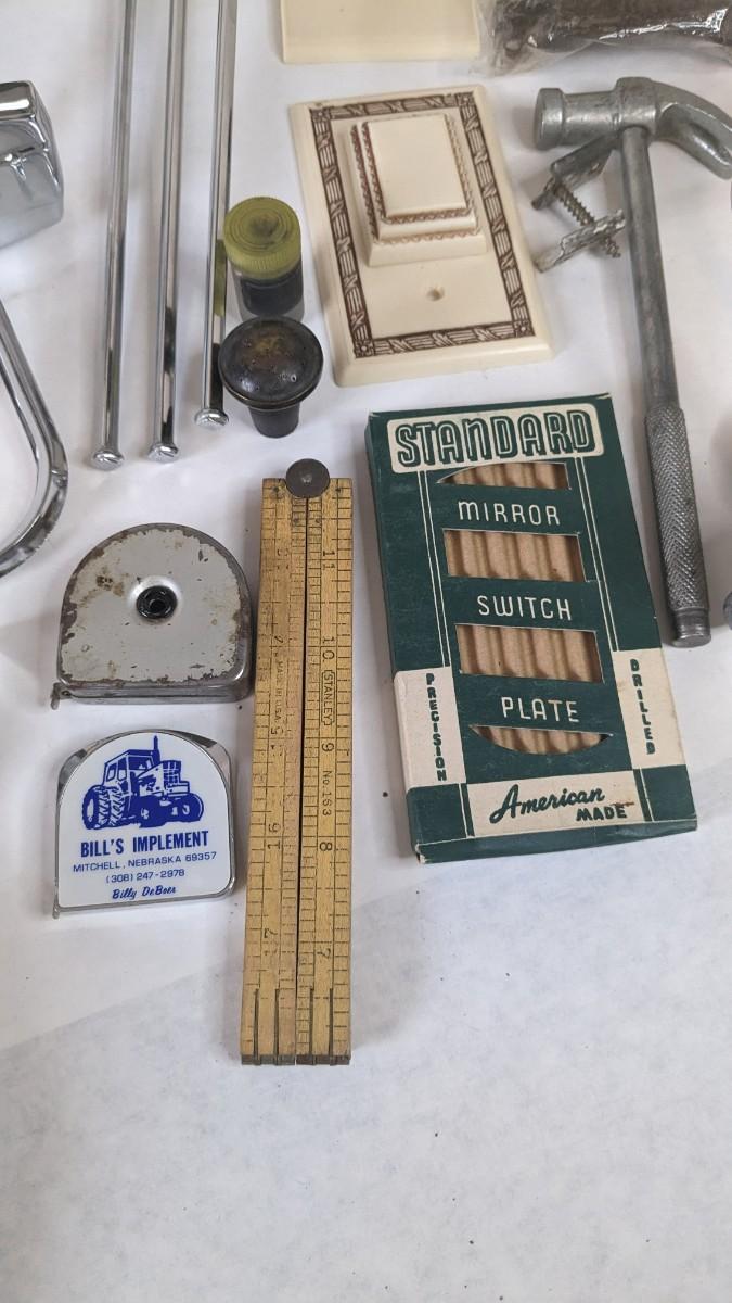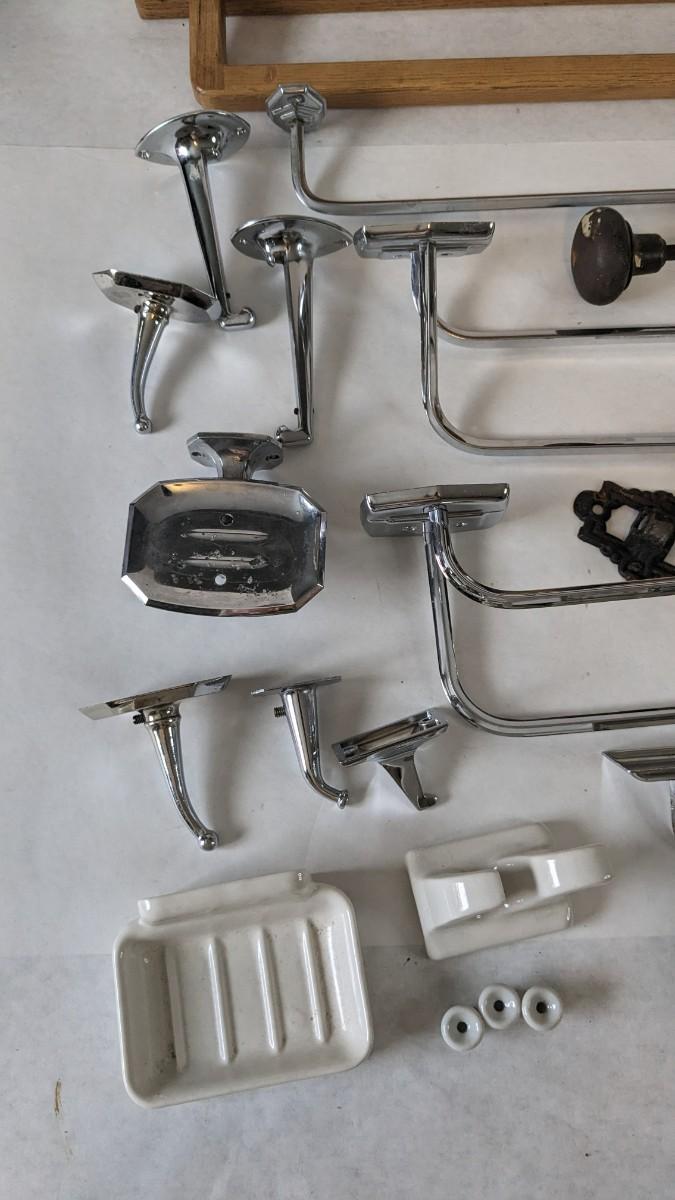 A small totes worth of salvaged pieces from cookhouse and bunk house and some other parts along the way including beautiful brass pendulum, Aerolux electric flowers light bulb, acorn weight for a clock, one snowflake pattern light cover dome, one 6" rose patterned ceiling fixture, varied switch plates, a few tools, and more! Noted in photos is a stress fracture in one of the white globes. This is a fantastic assortment full of practical use or upcycle potential