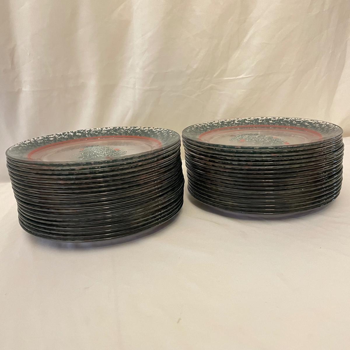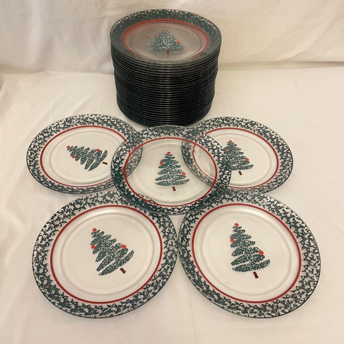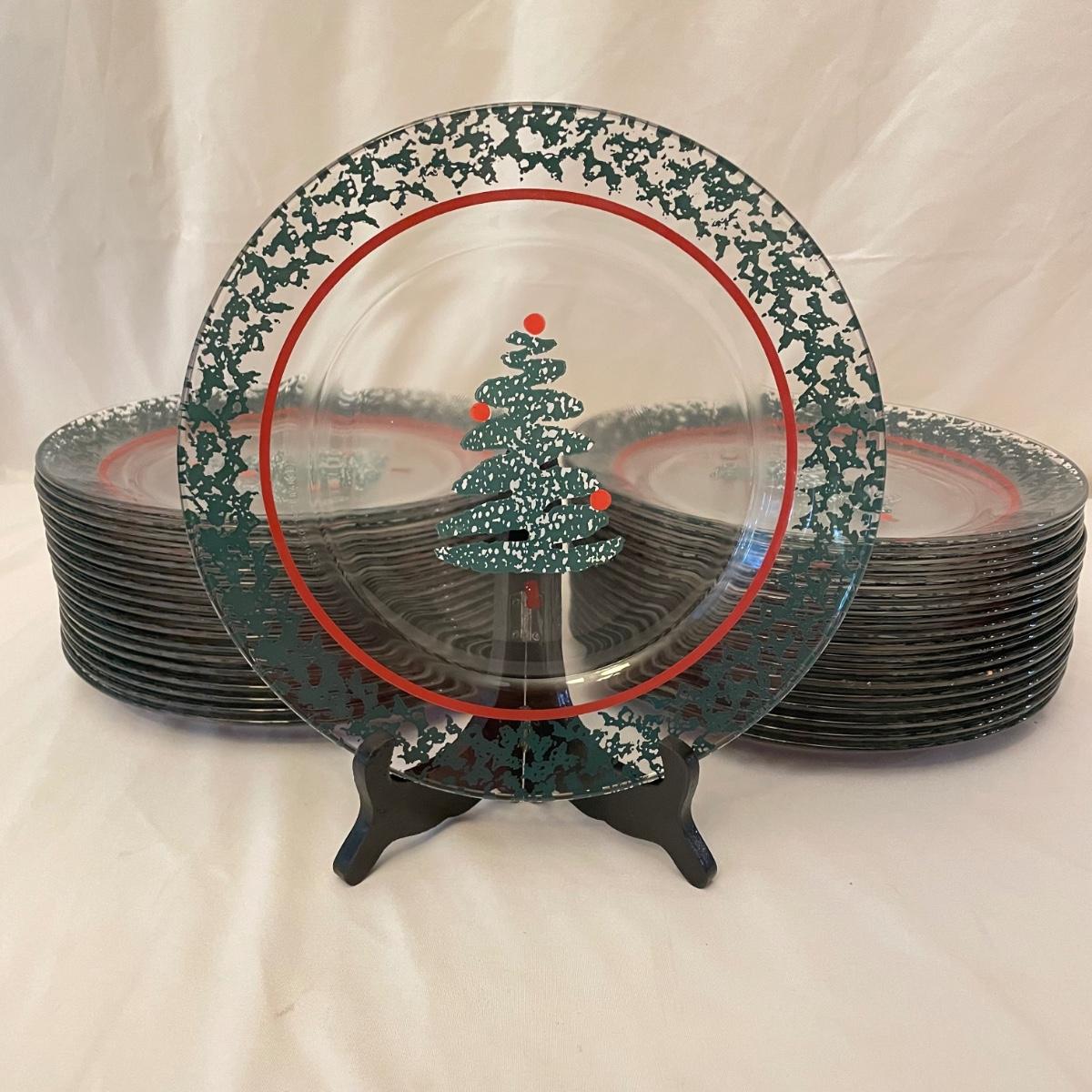 A festive set of 35 Arcoroc clear 9”D plates. The plates’ designs have been applied to the underside, just the clear glass will be in contact with food. Plates appear well cared for, their green and red borders plus tree centers do not appear to be worn. Shipping available.