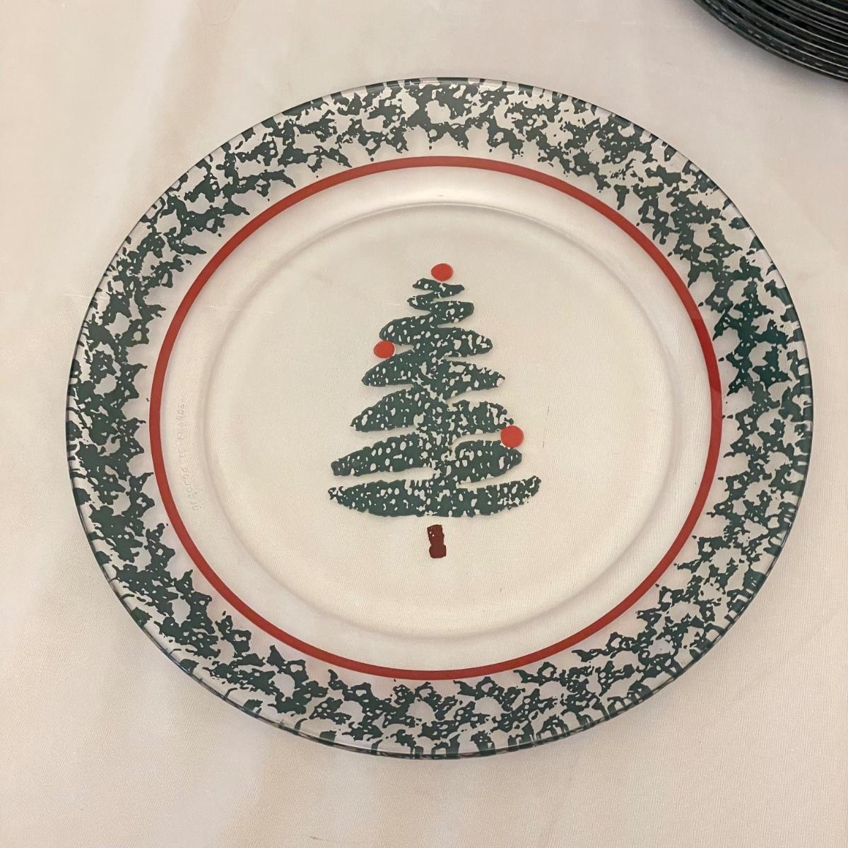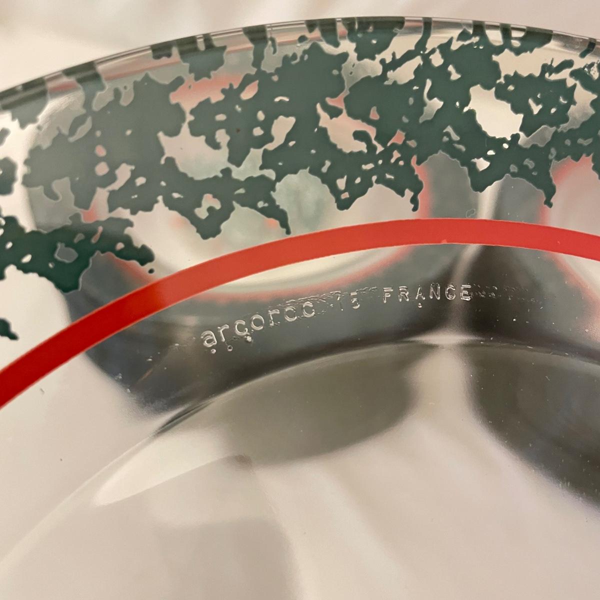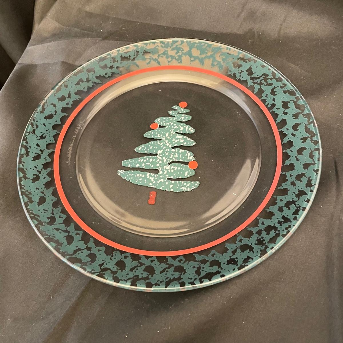 A festive set of 35 Arcoroc clear 9”D plates. The plates’ designs have been applied to the underside, just the clear glass will be in contact with food. Plates appear well cared for, their green and red borders plus tree centers do not appear to be worn. Shipping available.