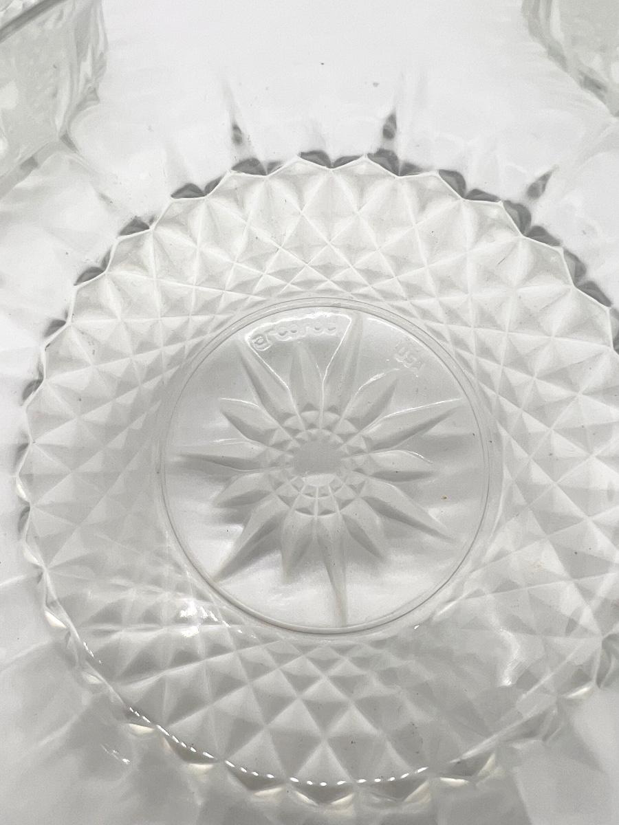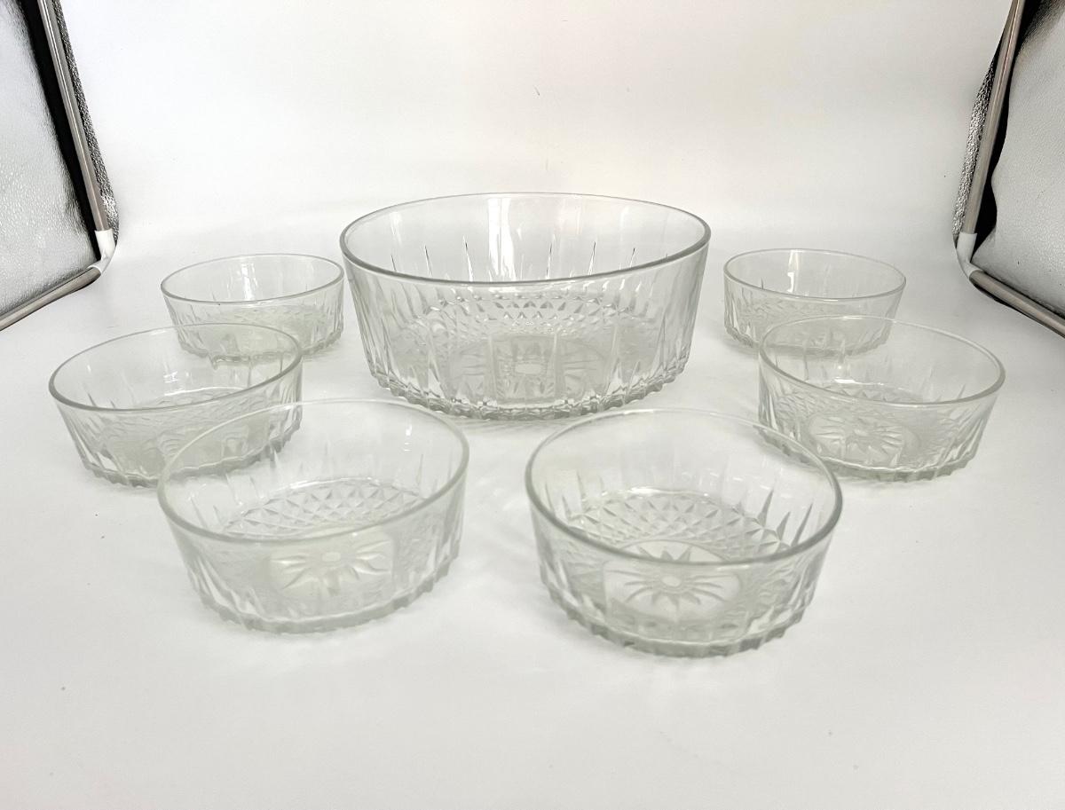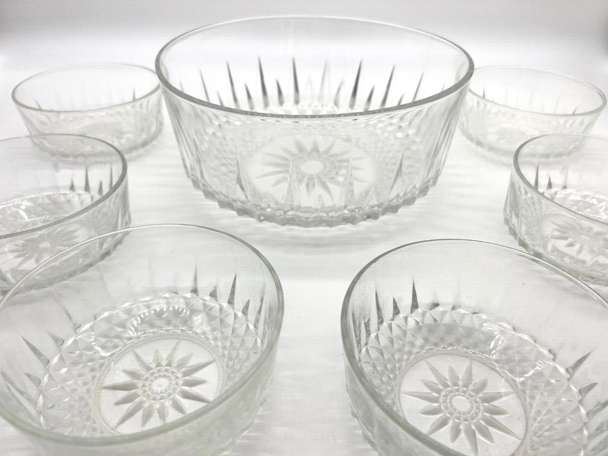 Set of 7. One big bowl and 6 smaller bowls. Arcoroc USA & France Diamond/Starburst/Sunburst Dessert bowl.