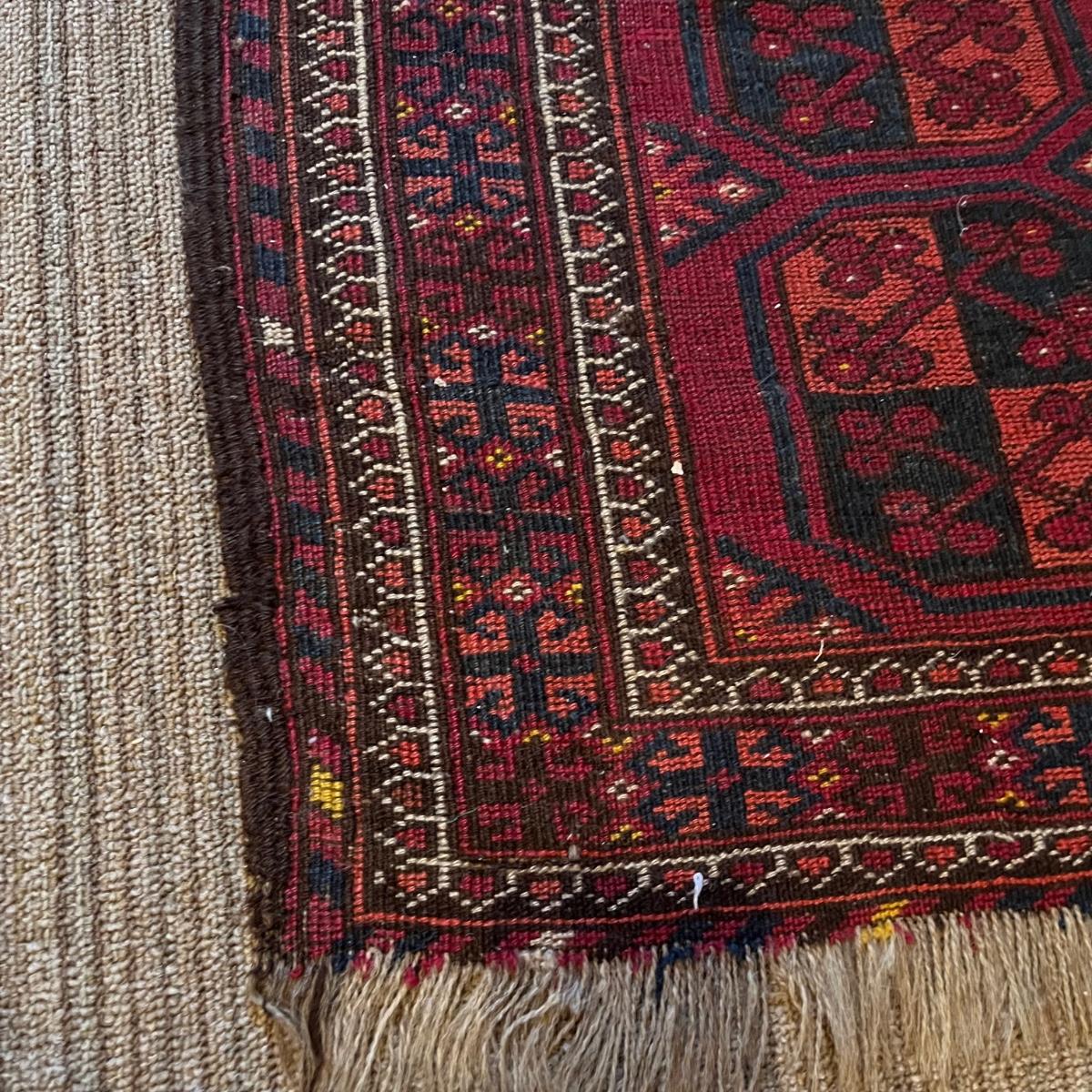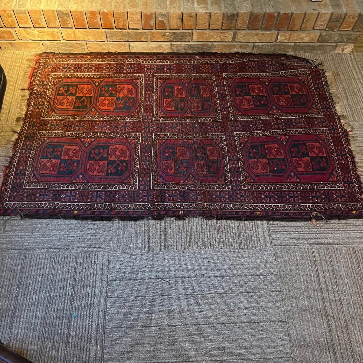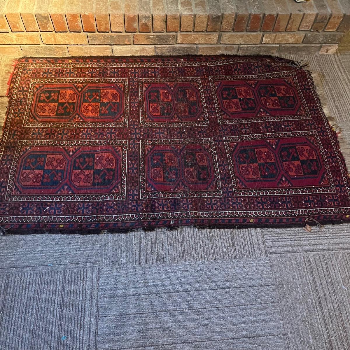 Lot includes an area rug that shows some wear on the sides, see pictures. Rug measures 37.5” x 60”. No markings but appears to be woven. Shipping available.