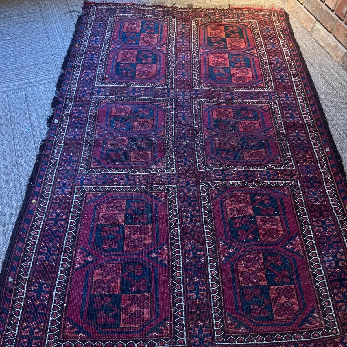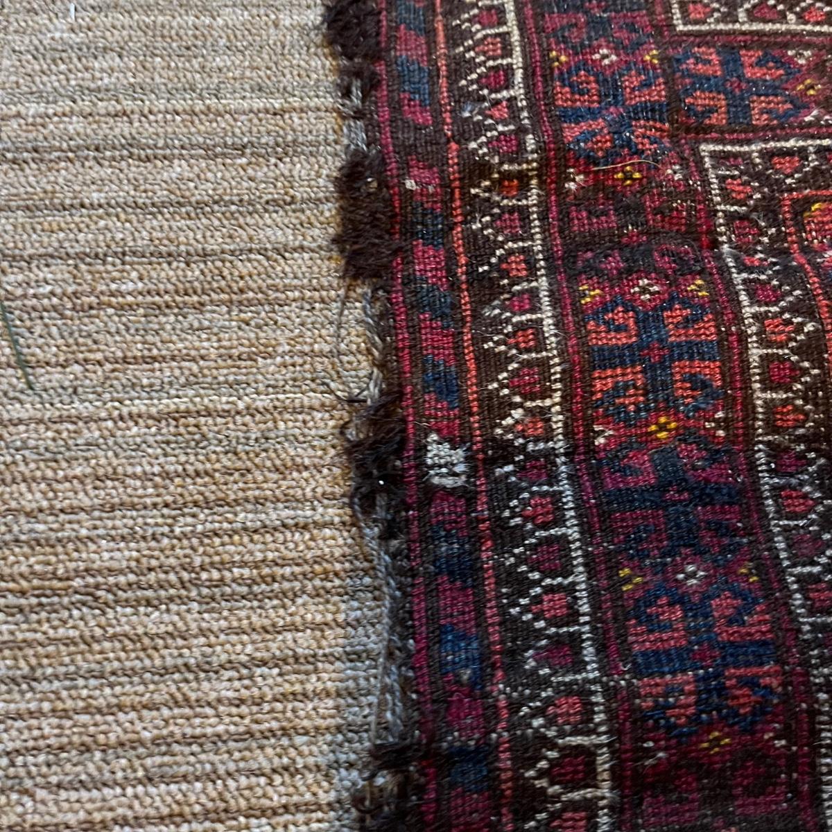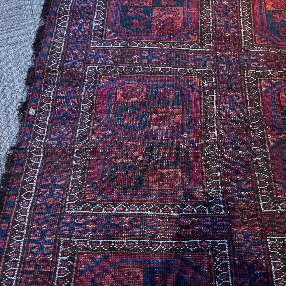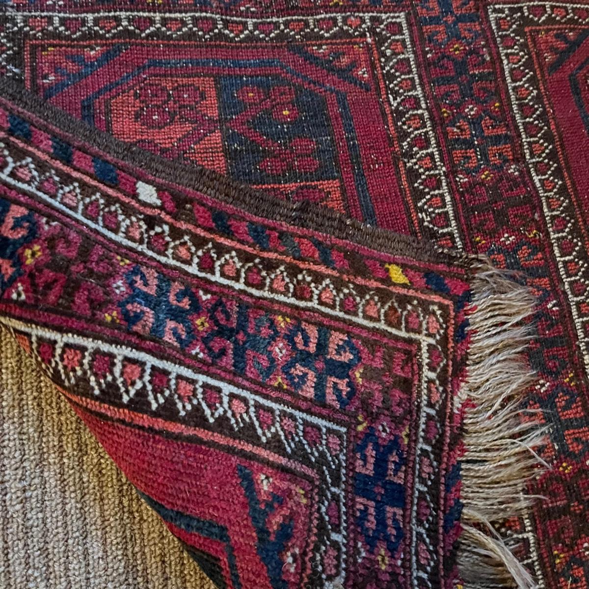 Lot includes an area rug that shows some wear on the sides, see pictures. Rug measures 37.5” x 60”. No markings but appears to be woven. Shipping available.